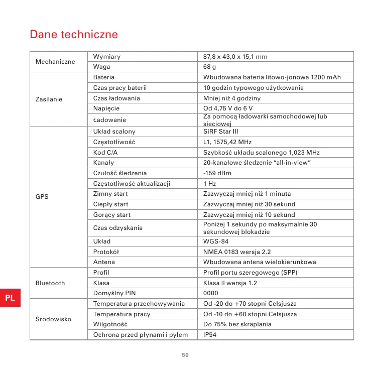 Dane techniczne Mechaniczne Zasilanie Wymiary 87,8 x 43,0 x 15,1 mm Waga 68 g Bateria Wbudowana bateria litowo-jonowa 1200 mAh Czas pracy baterii 10 godzin typowego użytkowania Czas ładowania Mniej niż 4 godziny Napięcie Układ scalony Od 4,75 V do 6 V Za pomocą ładowarki samochodowej lub sieciowej SiRF Star III Częstotliwość L1, 1575,42 MHz Kod C/A Szybkość układu scalonego 1,023 MHz Kanały 20-kanałowe śledzenie “all-in-view” Czułość śledzenia -159 dBm Częstotliwość aktualizacji 1 Hz Zimny start Zazwyczaj mniej niż 1 minuta Ciepły start Zazwyczaj mniej niż 30 sekund Gorący start Zazwyczaj mniej niż 10 sekund Czas odzyskania Poniżej 1 sekundy po maksymalnie 30 sekundowej blokadzie Układ WGS-84 Protokół NMEA 0183 wersja 2.2 Antena Wbudowana antena wielokierunkowa Profil Profil portu szeregowego (SPP) Klasa Klasa II wersja 1.2 Domyślny PIN