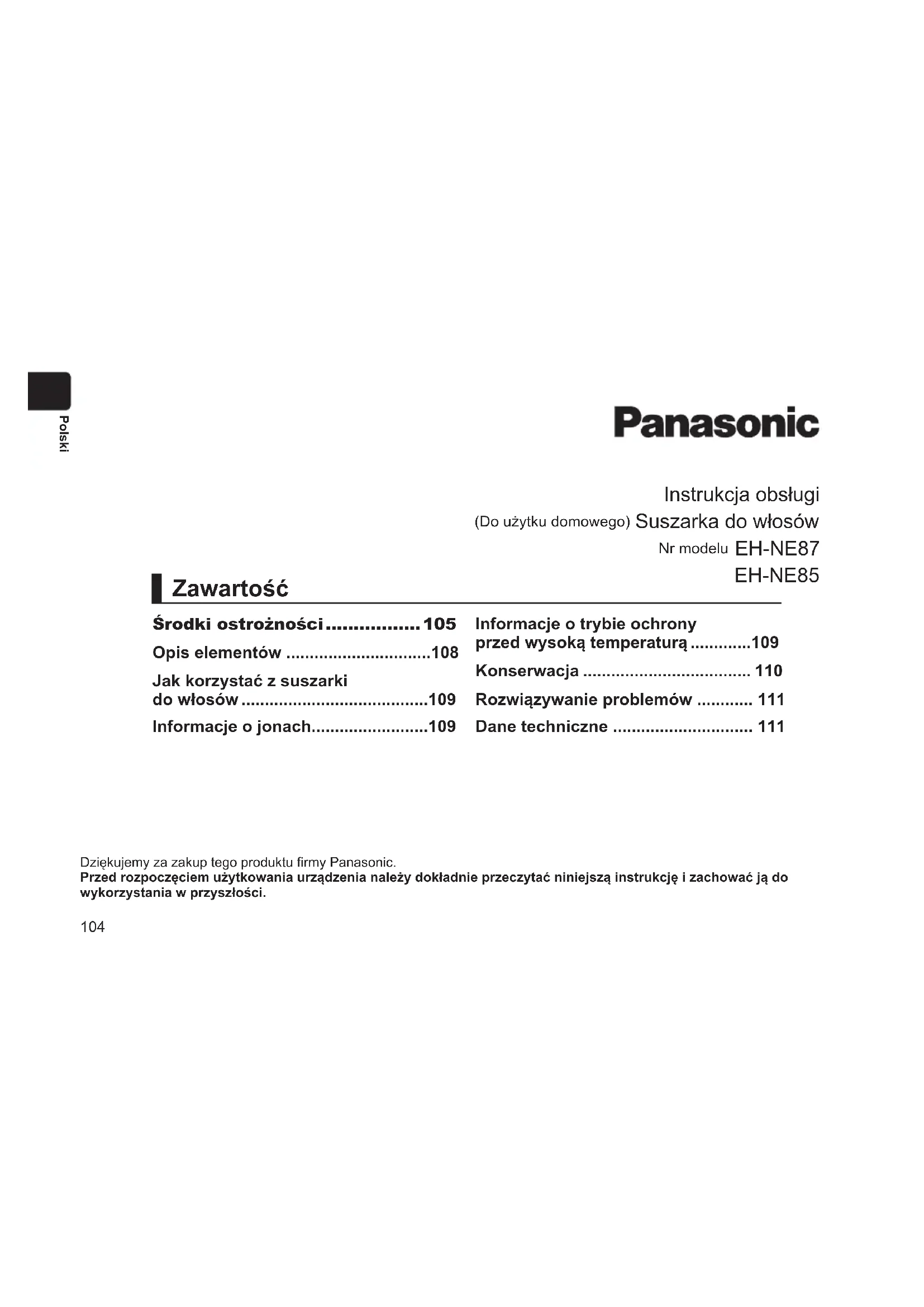 - Podczas lub po konserwacji wylotu powietrza może dojść do rozproszenia pyłu itp. Przed użyciem należy upewnić się, że z wylotu powietrza suszarki do włosów nie wydobywa się kurz itp (Nie patrzeć w wylot powietrza.). (Użyj dostępnej na rynku szczoteczki do zębów). Konserwacja wylotu jonów Wylot jonów należy czyścić raz na 6 miesięcy. Taka konserwacja pozwala suszarce do włosów utrzymać wytwarzany poziom jonów przez długi czas. ● Używaj dostępnych w handlu wacików bawełnianych (Zalecamy cienkie bawełniane waciki przeznaczone do stosowania u niemowląt). ● Delikatnie wsuń bawełniany wacik do oporu (około 6 mm) i obróć go 2 lub 3 razy. Wylot jonów Delikatnie pocierać końcówkę części igły alkoholzmywacz do paznokci111 Polski Rozwiązywanie problemów Problem Możliwa przyczyna Działanie Podczas pracy w trybie „Gorące” często przełącza się na chłodne powietrze lub w korpusie widoczne są iskry. (Iskry te są powodowane przez wyłącznik termostatyczny będący urządzeniem ochronnym i nie stanowią zagrożenia.) We wlocie lub wylocie powietrza nagromadził się kurz. Włos lub inny obcy przedmiot blokuje dopływ powietrza. Usuń nagromadzony kurz. Nie blokować wlotu powietrza. Gorące powietrze wciąż zmienia się w zimne powietrze. Gorące powietrze jest nienormalnie gorące. Wtyczka zasilania jest nienormalnie gorąca. Połączenie z gniazdkiem jest poluzowane. Należy używać gniazdka, które jest dobrze dopasowane. Wewnątrz wylotu jonów powstają iskry. Nieprawidłowość spowodowana zanieczyszczoną elektrodą (częścią igłową). Przeprowadź konserwację wylotu jonów. Wylot jonów emituje hałas (trzaski). Jeśli problem wciąż występuje, należy skontaktować się ze sklepem, w którym zakupiono urządzenie lub centrum serwisowym autoryzowanym przez firmę Panasonic w celu zlecenia naprawy. Dane techniczne Nazwa produktu Suszarka do włosów Model produktu EH-NE87, EH-NE85 Źródło zasilania 220 V