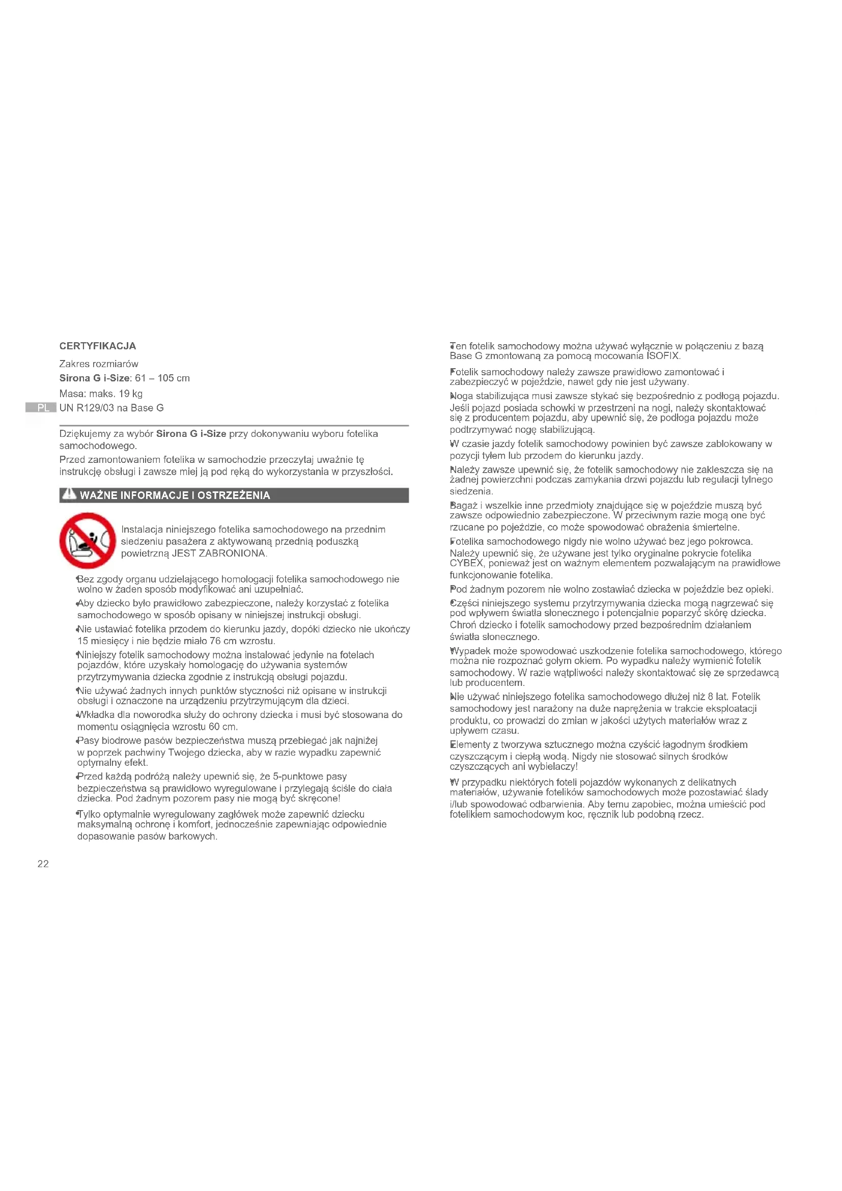 CERTYFIKACJA Zakres rozmiarów Sirona G i-Size: 61 – 105 cm Masa: maks. 19 kg UN R129/03 na Base G Dziękujemy za wybór Sirona G i-Size przy dokonywaniu wyboru fotelika samochodowego. Przed zamontowaniem fotelika w samochodzie przeczytaj uważnie tę instrukcję obsługi i zawsze miej ją pod ręką do wykorzystania w przyszłości.
