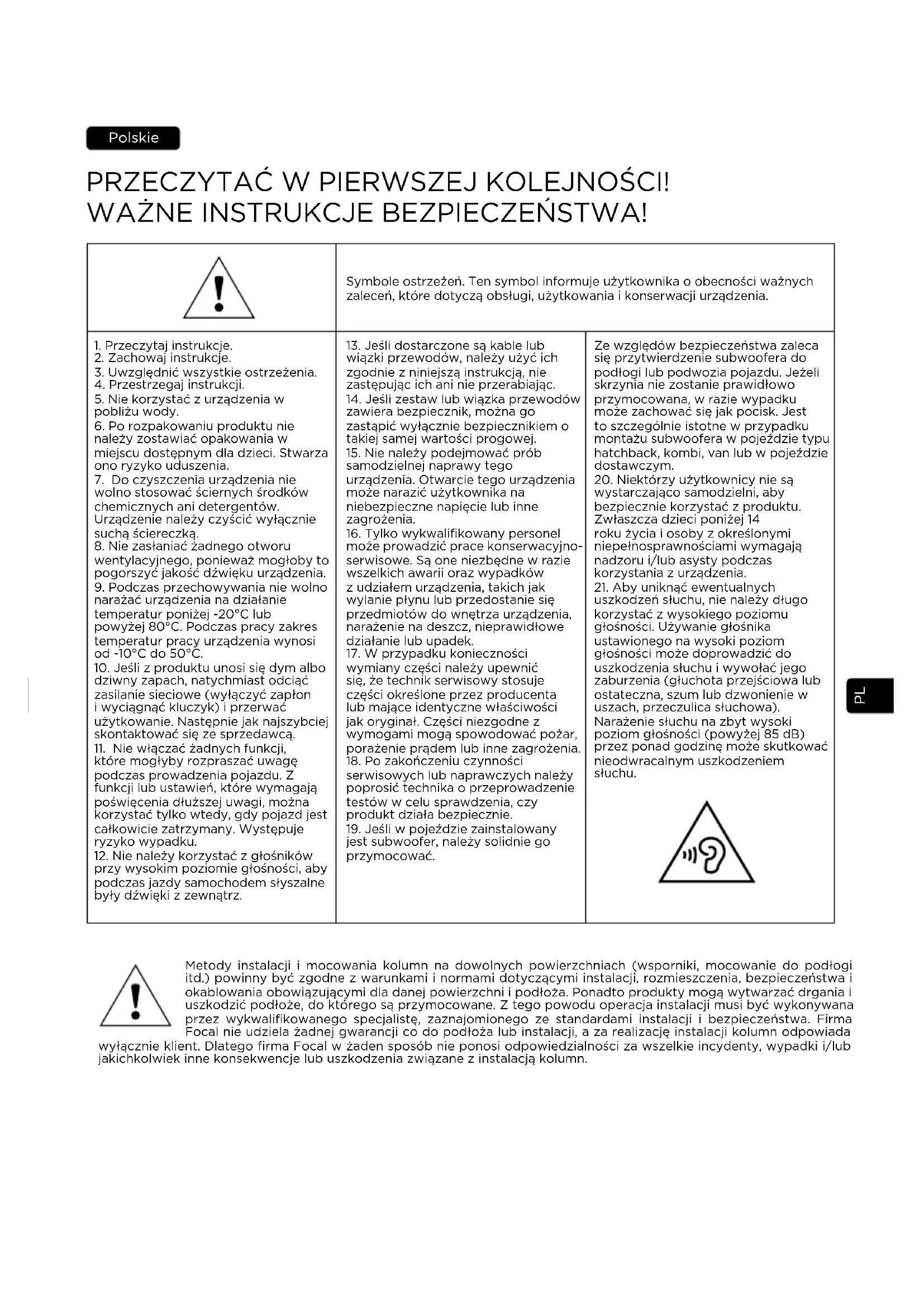 Konserwacja Konserwacja głośników K2 Power ogranicza się do usuwania kurzu za pomocą suchej ściereczki. W razie zabrudzenia kratki wystarczy użyć mokrej ściereczki. Nie używać rozpuszczalników, detergentów, alkoholi lub środków żrących, skrobaków lub myjek do czyszczenia powierzchni głośników. Okres docierania Wykorzystywane głośniki to złożone urządzenia mechaniczne wymagające pewnej ilości czasu, aby uzyskać maksymalną efektywność. Długość okresu docierania zmienia się w zależności od warunków i może przeciągnąć się do kilku tygodni. Aby przyspieszyć ten proces, zalecamy włączenie głośników na dwadzieścia godzin przy średniej głośności. Po pełnej stabilizacji parametrów działania głośników będą Państwo mogli w pełni cieszyć się jakością dźwięku oferowaną przez głośniki z gamy K2 Power. Warunki gwarancji W razie problemu należy skontaktować się ze sprzedawcą Focal. Gwarancja prawna na wszystkie urządzenia Focal na terenie Francji wynosi 2 lata, licząc od daty zakupu. W przypadku niezgodności sprzętu klient powinien odesłać go, w oryginalnym opakowaniu lub w równoważnym opakowaniu zapewniającym całkowitą ochronę w trakcie transportu, do sprzedawcy, który przeanalizuje sprzęt i określi charakter awarii. Jeśli urządzenie jest objęte gwarancją i spełnione są warunki uruchomienia gwarancji, zostanie ono naprawione lub wymienione zgodnie z warunkami gwarancji obowiązującej w dniu zakupu urządzenia. W przeciwnym razie klientowi zostanie przedstawiony kosztorys naprawy. Gwarancja nie obejmuje uszkodzeń wynikających z niewłaściwego użytkowania lub nieprawidłowego podłączenia (np. spalone ruchome cewki). Poza Francją sprzęt Focal jest objęty gwarancją, której warunki są ustalane lub realizowane lokalnie przez oficjalnego dystrybutora Focal w każdym kraju, zgodnie z przepisami obowiązującymi na danym terytorium.Знак предупреждения. Предупреждает пользователя о важных инструкциях, которые касаются погрузочно-разгрузочных операций с аппаратурой, ее устройства и технического обслуживания.