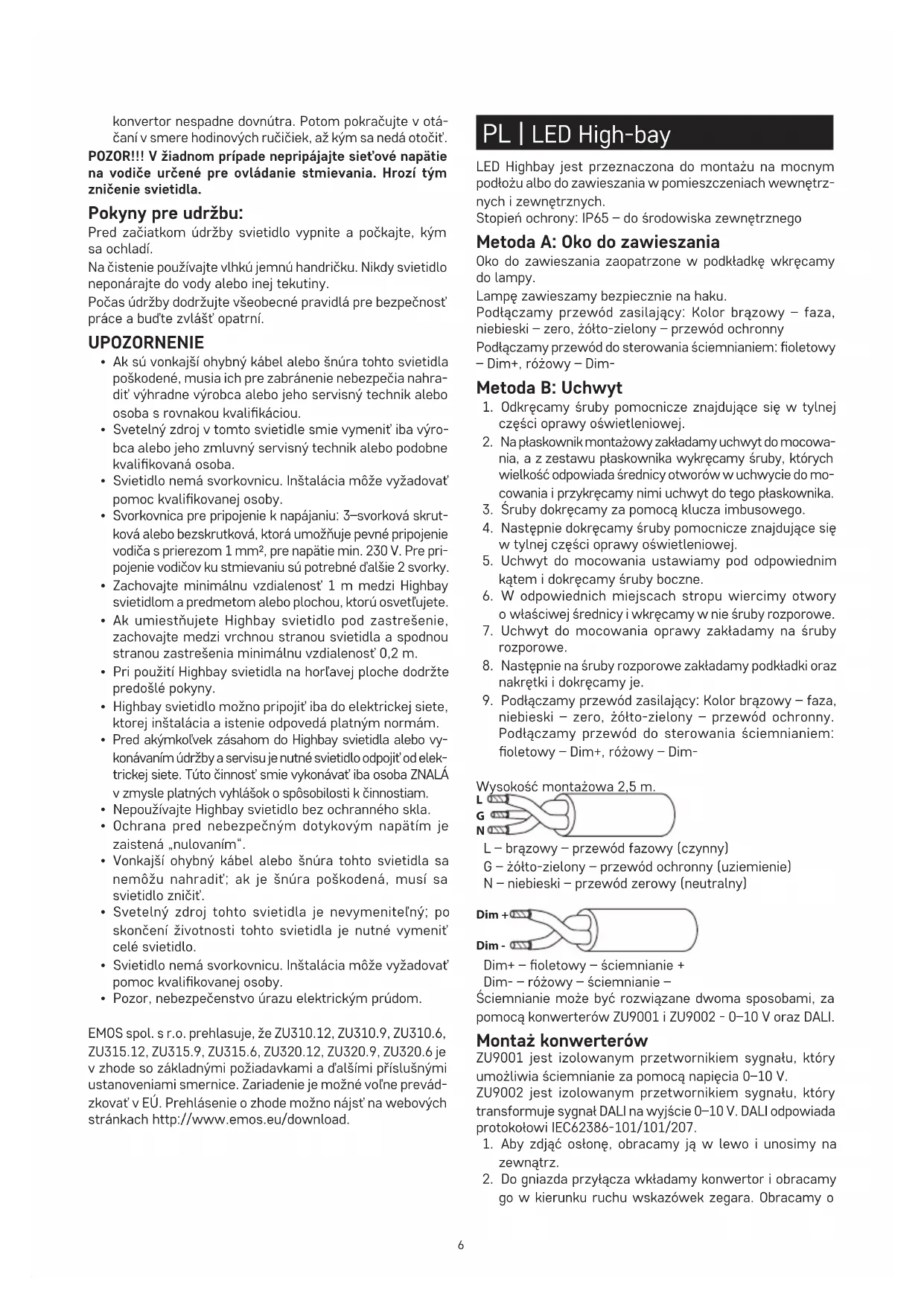 - Pozor, nebezpečenstvo úrazu elektrickým prúdom. EMOS spol. s r.o. prehlasuje, že ZU310.12, ZU310.9, ZU310.6, ZU315.12, ZU315.9, ZU315.6, ZU320.12, ZU320.9, ZU320.6 je v zhode so základnými požiadavkami a ďalšími příslušnými ustanoveniami smernice. Zariadenie je možné voľne prevád- zkovať v EÚ. Prehlásenie o zhode možno nájsť na webových stránkach http://www.emos.eu/download. PL | LED High-bay LED Highbay jest przeznaczona do montażu na mocnym podłożu albo do zawieszania w pomieszczeniach wewnętrz- nych i zewnętrznych. Stopień ochrony: IP65 – do środowiska zewnętrznego Metoda A: Oko do zawieszania Oko do zawieszania zaopatrzone w podkładkę wkręcamy do lampy. Lampę zawieszamy bezpiecznie na haku. Podłączamy przewód zasilający: Kolor brązowy – faza, niebieski – zero, żółto-zielony – przewód ochronny Podłączamy przewód do sterowania ściemnianiem: oletowy – Dim+, różowy – Dim- Metoda B: Uchwyt