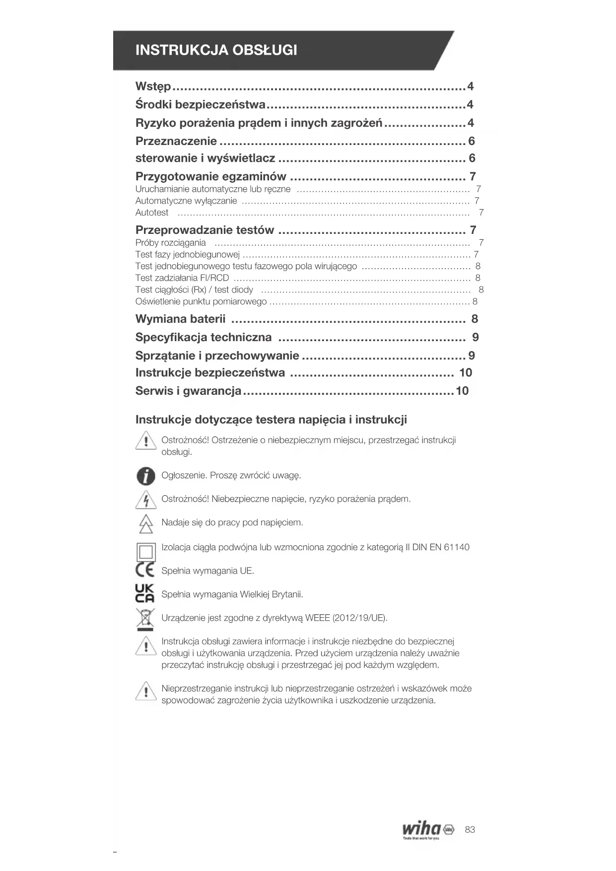 Wstęp 4 Środki bezpieczeństwa 4 Ryzyko porażenia prądem i innych zagrożeń 4 Przeznaczenie 6 sterowanie i wyświetlacz 6 Przygotowanie egzaminów 7 Uruchamianie automatyczne lub ręczne 7 Automatyczne wyłączanie 7 Autotest 7 Przeprowadzanie testów 7 Próby rozciągania 7 Test fazy jednobiegunowej 7 Test jednobiegunowego testu fazowego pola wirującego 8 Test zadziałania FI/RCD 8 Test ciągłości (Rx) / test diody 8 Oświetlenie punktu pomiarowego 8 Wymiana baterii 8 Specyfikacja techniczna 9 Sprzątanie i przechowywanie 9 Instrukcje bezpieczeństwa 10 Serwis i gwarancja 10 Instrukcje dotyczące testera napięcia i instrukcji Ostrożność! Ostrzeżenie o niebezpiecznym miejscu, przestrzegać instrukcji obsługi. Ogłoszenie. Proszę zwrócić uwagę. Ostrożność! Niebezpieczne napięcie, ryzyko porażenia prądem. Nadaje się do pracy pod napięciem. Izolacja ciągła podwójna lub wzmocniona zgodnie z kategorią II DIN EN 61140 Spełnia wymagania UE. Spełnia wymagania Wielkiej Brytanii. Urządzenie jest zgodne z dyrektywą WEEE (2012/19/UE). Instrukcja obsługi zawiera informacje i instrukcje niezbędne do bezpiecznej obsługi i użytkowania urządzenia. Przed użyciem urządzenia należy uważnie przeczytać instrukcję obsługi i przestrzegać jej pod każdym względem. Nieprzestrzeganie instrukcji lub nieprzestrzeganie ostrzeżeń i wskazówek może spowodować zagrożenie życia użytkownika i uszkodzenie urządzenia.INSTRUKCJA OBSŁUGI