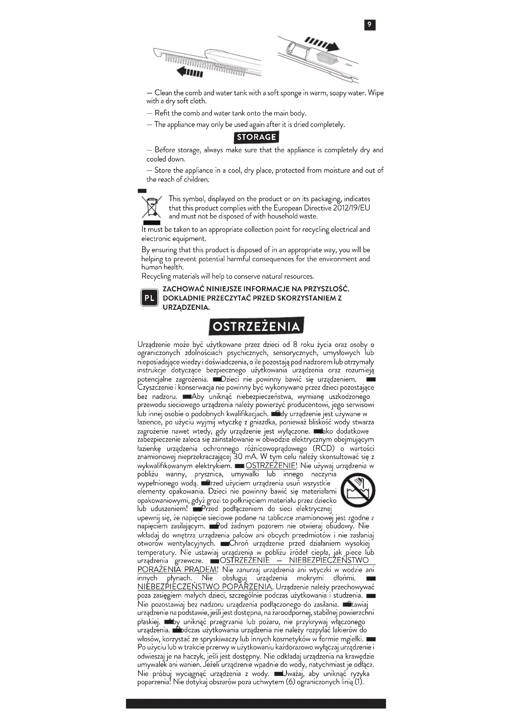 OSTRZEŻENIE! Powierzchnia urządzenia może być gorąca w trakcie używania i przez jakiś czas po zakończeniu pracy. Trzymaj urządzenie wyłącznie za uchwyt. Trzymaj płytki grzewcze, grzebień i generator pary z dala od ciała. Nie przytrzymuj płytek grzewczych przy włosach zbyt długo. UWAGA: Przed użyciem urządzenia upewnij się, że włosy są czyste i niesplątane. UWAGA: Urządzenie posiada funkcję automatycznego wyłączania. Wyłącza się automatycznie po ciągłej pracy przez ok. 1 godz. Napełnianie zbiornika na wodę UWAGA: Pełnego zbiornika na wodę można używać w sposób ciągły przez ok. 10 – 12 minut. UWAGA: Przed użyciem urządzenia upewnij się, że w zbiorniku jest wystarczająca ilość wody. Sprawdzaj to regularnie, aby zapewnić wystarczającą ilość wody w zbiorniku podczas pracy. Jeśli zbiornik jest pusty, natychmiast napełnij go wodą. UWAGA: Napełniaj zbiornik wyłącznie zimną, świeżą wodą. Nie napełniaj zbiornika na wodę żadną inną cieczą. — Przed wyjęciem zbiornika upewnij się, że urządzenie jest wyłączone, odłączone od zasilania i że całkowicie ostygło. — Aby wyjąć zbiornik na wodę z korpusu, przesuń go w kierunku przewodu zasilania. — Otwórz pokrywkę i napełnij zbiornik zimną, świeżą wodą. Nie przepełniaj zbiornika na wodę. — Aby uniknąć wycieku wody, do napełniania użyj dołączonej pipety. — Załóż pokrywkę i upewnij się, że jest prawidłowo zamocowana na miejscu. — Wytrzyj zbiornik na wodę miękką, suchą ściereczką. — Ponownie prawidłowo zamontuj zbiornik na wodę na korpusie. — Przed rozpoczęciem użytkowania urządzenia odczekaj ok. 90 sekund.11 Korzystanie z urządzenia INFORMACJA: Zawsze używaj urządzenia we właściwy sposób. Kieruj generator pary i grzebień w kierunku końcówek włosów. UWAGA: Urządzenie oferuje funkcję pary. Po włączeniu urządzenia woda w zbiorniku zaczyna się automatycznie nagrzewać. Na wyświetlaczu miga symbol . Rozgrzewanie zajmuje ok. 60 sekund. Podczas rozgrzewania nie zaciskaj płytek grzewczych. Po rozgrzaniu wyświetlacz stale wskazuje symbol . Aby odblokować przyciski, przytrzymaj przycisk „+” przez ok. 3 sekundy. Następnie, aby wyłączyć funkcję pary, jeden raz naciśnij przycisk włączania/wyłączania i pary. Aby przywrócić funkcję pary, ponownie naciśnij przycisk włączania/wyłączania i pary. UWAGA: Aby użyć funkcji pary, całkowicie dociśnij ze sobą płytki grzewcze, a generator będzie automatycznie wypuszczał parę przez ok. 7 – 8 sekund. Aby podgrzać wodę w zbiorniku do następnego użycia, zwolnij płytki grzewcze i odczekaj ok. 2 – 3 sekundy. UWAGA: Jeśli urządzenie nie zostanie uruchomione w ciągu 20 minut od włączenia, na wyświetlaczu pojawi się napis „SLP”. UWAGA: Grzebień jest zdejmowany. Przed wyjęciem grzebienia upewnij się, że urządzenie jest wyłączone, odłączone od zasilania i że całkowicie ostygło. — Podłącz urządzenie do zasilania. Na wyświetlaczu widnieje napis „OFF”. — Aby włączyć urządzenie, przytrzymaj przycisk włączania/wyłączania i pary przez około 2 – 3 sekundy. — Aby ustawić żądaną temperaturę grzania (150°C / 170°C / 190°C / 210°C / 230°C), naciskaj przyciski „+” oraz „-”. — Temperatura płytek grzewczych zaczyna natychmiast rosnąć. Rosnąca temperatura jest ukazywana na wyświetlaczu. — Jeżeli po włączeniu urządzenia / ustawieniu temperatury nie zostanie podjęte żadne działanie, przyciski zostaną automatycznie zablokowane po ok. 4 – 5 sekundach. Na wyświetlaczu pojawi się symbol . Aby odblokować przyciski, przytrzymaj przycisk „+” przez ok. 3 sekundy. Symbol miga, a następnie znika z wyświetlacza. — Po osiągnięciu przez płytki grzewcze zadanej temperatury wyświetlacz stale pokazuje temperaturę. — Trzymaj urządzenie za uchwyt, obejmij pasmo włosów płytkami grzewczymi i powoli przesuwaj urządzenie w dół w kierunku końcówek włosów. Uważaj, aby nie przytrzymywać płytek grzewczych przy włosach zbyt długo. — Po zakończeniu, aby wyłączyć urządzenie, przytrzymaj przycisk włączania/ wyłączania i pary przez 2 – 3 sekundy. — Odłącz urządzenie od źródła zasilania. Umieść urządzenie na powierzchni odpornej na wysoką temperaturę, aby ostygło. CZYSZCZENIE — Przed czyszczeniem odłącz urządzenie od zasilania i poczekaj na całkowite jego ostygnięcie. — Nie czyść urządzenia wełną stalową, silnymi środkami chemicznymi, alkalicznymi, ściernymi lub dezynfekującymi, gdyż mogą one uszkodzić powierzchnię. — Podczas czyszczenia nie zanurzaj urządzenia w wodzie ani żadnych innych płynach. Upewnij się, że elementy elektryczne nie zostają zamoczone ani zawilgocone. — Usuń wszelkie włosy pozostawione na urządzeniu, grzebieniu i płytkach grzewczych. — Oczyść urządzenie miękką wilgotną ściereczką i, jeśli to konieczne, niewielką ilością łagodnego detergentu. Wytrzyj miękką, suchą ściereczką. — Zdejmij grzebień z korpusu. — Aby wyjąć zbiornik na wodę z korpusu, przesuń go w kierunku przewodu zasilania. Spuść pozostałą wodę ze zbiornika. — Wyczyść grzebień i zbiornik na wodę miękką gąbką w ciepłej, namydlonej wodzie. Wytrzyj miękką, suchą ściereczką. — Zamontuj grzebień i zbiornik na wodę z powrotem na korpus. — Urządzenie może być używane wyłącznie po całkowitym wyschnięciu. PRZECHOWYWANIE — Przed schowaniem zawsze upewnij się, że urządzenie jest całkowicie suche i ostygło. — Przechowuj urządzenie w chłodnym, suchym miejscu, w którym jest chronione przed wilgocią, poza zasięgiem dzieci.12 Symbol ten widniejący na produkcie lub na jego opakowaniu wskazuje, że produkt spełnia wymogi dyrektywy unijnej 2012/19/UE i że nie może być utylizowany jako odpad gospodarstwa domowego. Należy oddać go do odpowiedniego punktu zbiórki sprzętu elek