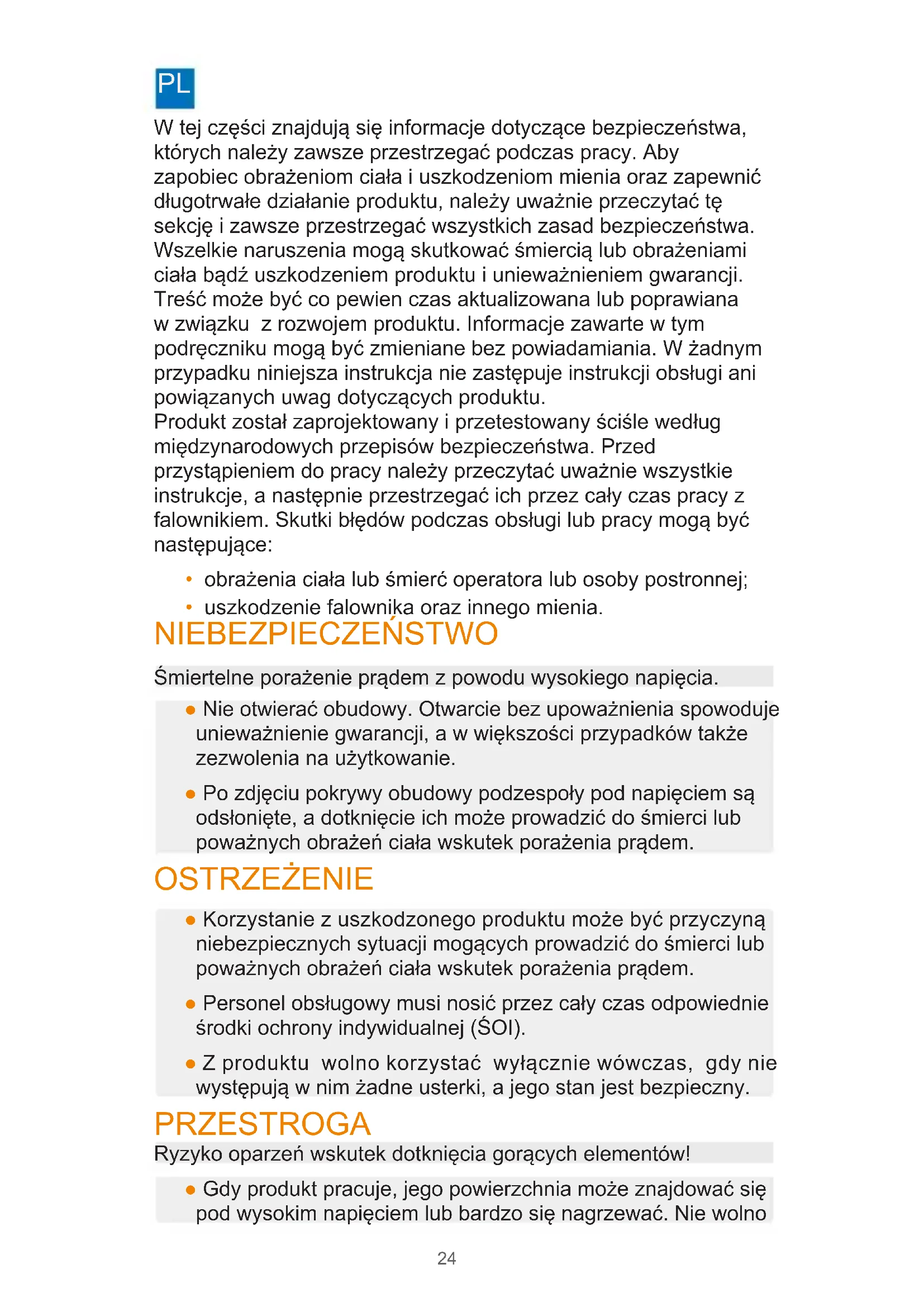 W tej.częsci znajduźpie informacja dotyczȩbezmieczne sta, kórych naleź y zawsze przystrzegoć podczas pracy. Aby zapobiec obrażeniomcia i uszkodzeniom mienia oraz zapewnić dlugotrwałe dzialeanie produktu, naleź uwazność przyczytrać tę sekcję i zawsze przystrzegoć wszystkichzasad bezpieczemu stwa. Wszelkie naruszenia mogą skutkowania smiercie lub obrażeniami cilia sądz uszkodzeniem produktu i uniewaźniemem gwarancji. TresćMZe boź co pewien czasactualizowana lub poprawiana w zwiazku z rozwojem produktu. Informacja zawarte w tym podreczniku mogą boź zmieianie bez powiadamiania. Wźadnym przypadku niniejsza instrukcja nie zastępuje instrukcji obstymi ani powiazanych uwag dotyczȩch produktu.