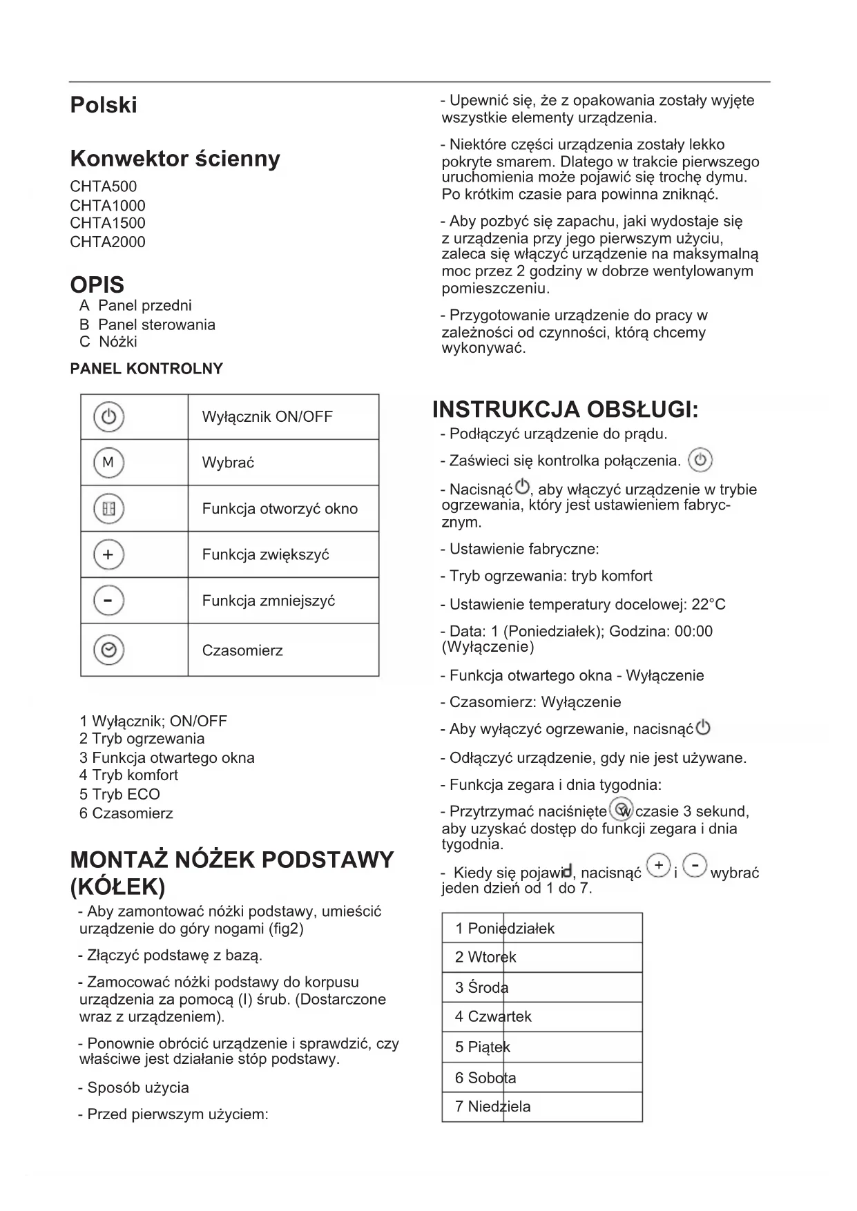 (KÓŁEK) - Aby zamontować nóżki podstawy, umieścić urządzenie do góry nogami (g2) - Złączyć podstawę z bazą. - Zamocować nóżki podstawy do korpusu urządzenia za pomocą (I) śrub. (Dostarczone wraz z urządzeniem). - Ponownie obrócić urządzenie i sprawdzić, czy właściwe jest działanie stóp podstawy. - Sposób użycia - Przed pierwszym użyciem: - Upewnić się, że z opakowania zostały wyjęte wszystkie elementy urządzenia. - Niektóre części urządzenia zostały lekko pokryte smarem. Dlatego w trakcie pierwszego uruchomienia może pojawić się trochę dymu. Po krótkim czasie para powinna zniknąć. - Aby pozbyć się zapachu, jaki wydostaje się z urządzenia przy jego pierwszym użyciu, zaleca się włączyć urządzenie na maksymalną moc przez 2 godziny w dobrze wentylowanym pomieszczeniu. - Przygotowanie urządzenie do pracy w zależności od czynności, którą chcemy wykonywać. INSTRUKCJA OBSŁUGI: - Podłączyć urządzenie do prądu. - Zaświeci się kontrolka połączenia. - Nacisnąć , aby włączyć urządzenie w trybie ogrzewania, który jest ustawieniem fabryc- znym. - Ustawienie fabryczne: - Tryb ogrzewania: tryb komfort - Ustawienie temperatury docelowej: 22°C - Data: 1 (Poniedziałek); Godzina: 00:00 (Wyłączenie) - Funkcja otwartego okna - Wyłączenie - Czasomierz: Wyłączenie - Aby wyłączyć ogrzewanie, nacisnąć - Odłączyć urządzenie, gdy nie jest używane. - Funkcja zegara i dnia tygodnia: - Przytrzymać naciśnięte w czasie 3 sekund, aby uzyskać dostęp do funkcji zegara i dnia tygodnia. - Kiedy się pojawi , nacisnąć