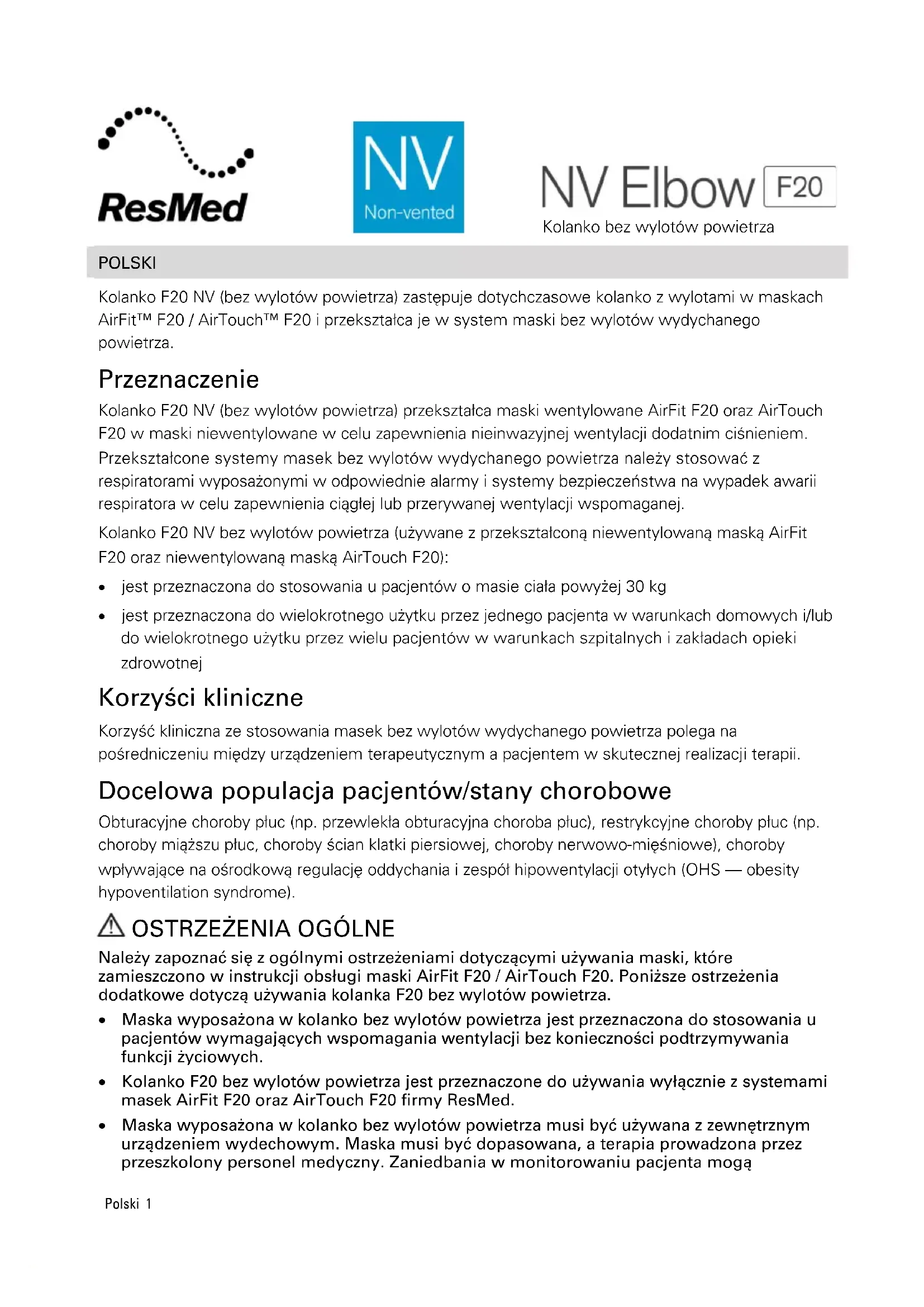 INSTRUKCJA OBSŁUGI NV Elbow F20 ResMed