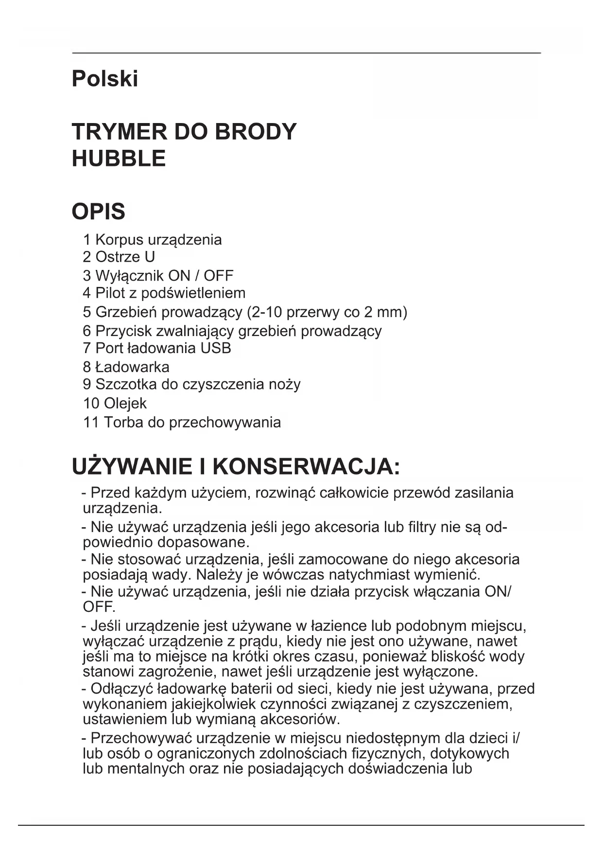 HUBBLE OPIS 1 Korpus urządzenia 2 Ostrze U 3 Wyłącznik ON / OFF 4 Pilot z podświetleniem 5 Grzebień prowadzący (2-10 przerwy co 2 mm) 6 Przycisk zwalniający grzebień prowadzący 7 Port ładowania USB 8 Ładowarka 9 Szczotka do czyszczenia noży 10 Olejek 11 Torba do przechowywania UŻYWANIE I KONSERWACJA: - Przed każdym użyciem, rozwinąć całkowicie przewód zasilania urządzenia. - Nie używać urządzenia jeśli jego akcesoria lub ltry nie są od- powiednio dopasowane. - Nie stosować urządzenia, jeśli zamocowane do niego akcesoria posiadają wady. Należy je wówczas natychmiast wymienić. - Nie używać urządzenia, jeśli nie działa przycisk włączania ON/ OFF. - Jeśli urządzenie jest używane w łazience lub podobnym miejscu, wyłączać urządzenie z prądu, kiedy nie jest ono używane, nawet jeśli ma to miejsce na krótki okres czasu, ponieważ bliskość wody stanowi zagrożenie, nawet jeśli urządzenie jest wyłączone. - Odłączyć ładowarkę baterii od sieci, kiedy nie jest używana, przed wykonaniem jakiejkolwiek czynności związanej z czyszczeniem, ustawieniem lub wymianą akcesoriów. - Przechowywać urządzenie w miejscu niedostępnym dla dzieci i/ lub osób o ograniczonych zdolnościach zycznych, dotykowych lub mentalnych oraz nie posiadających doświadczenia lubznajomości tego typu urządzeń. - Nie pozostawiać urządzenia włączonego leżącego na jakiejś powierzchni. - Utrzymywać urządzenie w dobrym stanie. Sprawdzać, czy rucho- me części nie są poprzestawiane względem siebie czy zaklesz- czone, czy nie ma zepsutych części czy innych warunków, które mogą wpłynąć na właściwe działanie urządzenia. - Zachować szczególną uwagę przy montażu i demontażu części, gdyż noże są bardzo ostre; unikać bezpośredniego kontaktu z powierzchnią noża. - Nie pozostawiać nigdy urządzenia podłączonego i bez nadzoru. W ten sposób można zaoszczędzić energię i przedłużyć okres użytkowania urządzenia. - Nie używać urządzenia do suszenia maskotek czy zwierząt. - Nie otwierać akumulatora pod żadnym pozorem. - Ładować urządzenie jedynie przy użyciu kabla cable USB dostarczonego przez producenta, jakikolwiek inny typ kabla może spowodować niebezpieczeństwo wybuchu lub pożaru. Nie używać przejściówek do USB. - Należy używać tylko tego typu baterii, dla których jest zaproje- ktowane urządzenie. Użycie innego typu baterii grozi wybuchem lub pożarem.