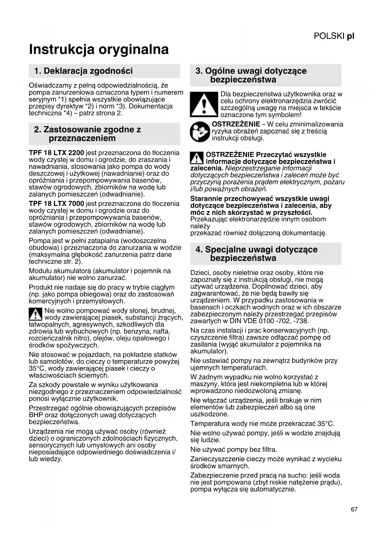 TPF 18 LTX 7000 jest przyznaczona do tloczenia wody czystej w domu i ogrodzie oraz do oprózniania i przyzempowywania basenów, stawów ogrodowych, zbiorników na wode lub zalanych pomieszczemu (odwadnianie).