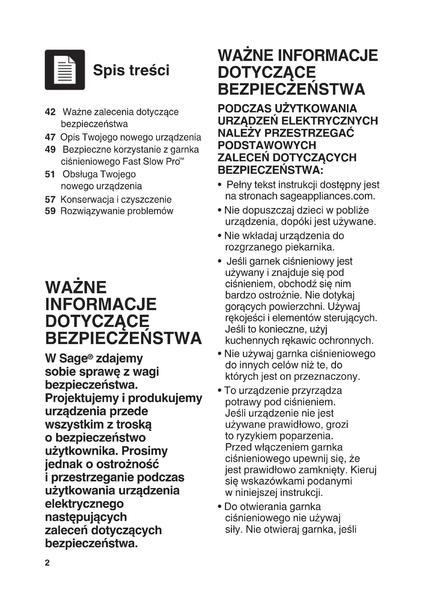 - Pełny tekst instrukcji dostępny jest na stronach sageappliances.com.• Nie dopuszczaj dzieci w pobliże urządzenia, dopóki jest używane. • Nie wkładaj urządzenia do rozgrzanego piekarnika.• Jeśli garnek ciśnieniowy jest używany i znajduje się pod ciśnieniem, obchodź się nim bardzo ostrożnie. Nie dotykaj gorących powierzchni. Używaj rękojeści i elementów sterujących. Jeśli to konieczne, użyj kuchennych rękawic ochronnych.• Nie używaj garnka ciśnieniowego do innych celów niż te, do których jest on przeznaczony.• To urządzenie przyrządza potrawy pod ciśnieniem. Jeśli urządzenie nie jest używane prawidłowo, grozi to ryzykiem poparzenia. Przed włączeniem garnka ciśnieniowego upewnij się, że jest prawidłowo zamknięty. Kieruj się wskazówkami podanymi w niniejszej instrukcji.• Do otwierania garnka ciśnieniowego nie używaj siły. Nie otwieraj garnka, jeśli 42 Ważne zalecenia dotyczące bezpieczeństwa47 Opis Twojego nowego urządzenia49 Bezpieczne korzystanie z garnka ciśnieniowego Fast Slow Pro 51 Obsługa Twojego nowego urządzenia57 Konserwacja i czyszczenie59 Rozwiązywanie problemów Spis treści WAŻNE INFORMACJE DOTYCZĄCE BEZPIECZEŃSTWA W Sage