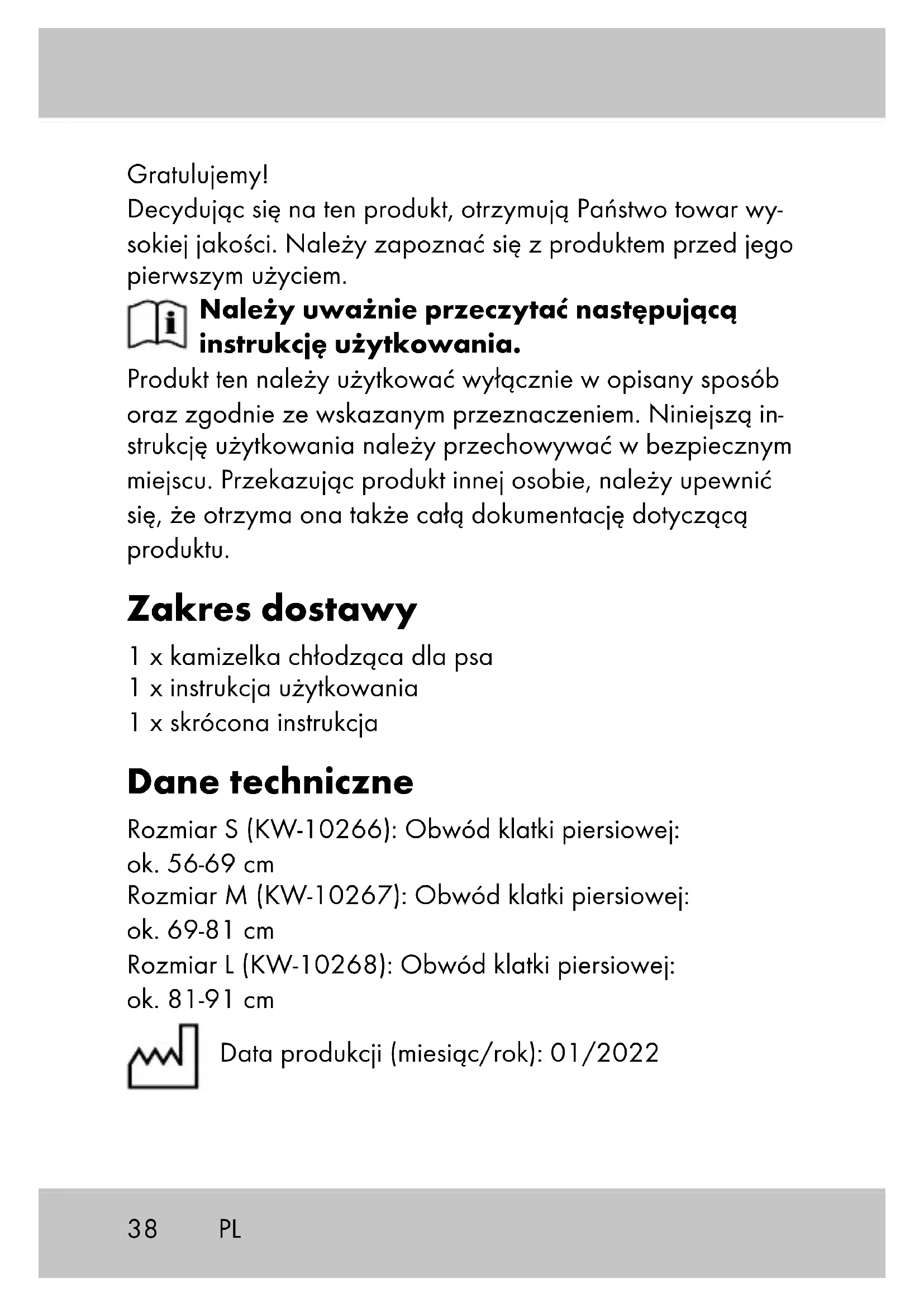 PL43 Przechowywanie, czyszczenie Aby zapewnić skuteczne działanie artykułu, należy regu- larnie poddawać go czyszczeniu mechanicznemu. Podczas nieużywania należy zawsze przechowywać produkt w suchym i czystym miejscu w temperaturze pokojowej. W przypadku lekkich zabrudzeń czyścić wodą, a następnie wytrzeć do sucha ściereczką. WAŻNE! Nie czyścić przy użyciu ostrych środków czyszczących. W trakcie choroby psa lub po jej zakończeniu należy zde- zynfekować artykuł. Należy skonsultować się z zaufanym lekarzem weterynarii i zapytać go o odpowiednie środki do higieny i dezynfekcji. Uwagi odnośnie recyklingu Artykuł oraz materiały opakowaniowe należy usunąć zgodnie z aktualnymi przepisami obowiązującymi w danym miejscu. Materiały opakowaniowe, jak np. worki foliowe nie powinny znaleźć się w rękach dzieci. Materiał opakowaniowy należy przechowywać w miejscu niedostępnym dla dzieci. Zutylizować produkt i opakowanie w sposób przyjazny dla środowiska. Kod materiału do recyklingu służy do oznaczenia różnych materiałów przeznaczonych do zwrotu do przetwórstwa wtórnego (recyklingu). Kod składa się z symbolu, który powinien odzwierciedlać cykl odzysku, oraz numeru oznaczającego materiał. PL44 Wskazówki dotyczące gwarancji i obsługi serwisowej Artykuł został wyprodukowany z najwyższą starannością i pod stałą kontrolą. DELTA-SPORT HANDELSKONTOR GmbH przyznaje klientowi końcowemu na niniejszy artykuł trzy lata gwarancji od daty zakupu (okres gwarancyjny) z zastrzeżeniem poniższych postanowień. Gwarancja dotyczy wyłącznie wad materiałowych i wad wykonania. Gwarancja nie obejmuje części, które podlegają normalnemu zużyciu i z tego względu należy je traktować jako części zużywalne (np. baterie) i nie obejmuje części kruchych, np. przełączni- ków, akumulatorów ani części wykonanych ze szkła. Wyklucza się roszczenia z tytułu niniejszej gwarancji w przy- padku użycia artykułu w sposób niewłaściwy lub sprzeczny z jego przeznaczeniem lub w sposób wykraczający poza przewidziane przeznaczenie lub poza przewidziany zakres użytkowania lub jeśli wytyczne zawarte w instrukcji obsługi nie były przestrzegane, chyba że klient końcowy udowodni istnienie wady materiałowej lub wady wykonania, która nie wynika z podanych wyżej przyczyn. Roszczenia z tytułu gwarancji można zgłaszać wyłącznie w okresie gwarancyjnym za okazaniem oryginalnego dowodu zakupu. Prosimy zatem zachować oryginalny dowód zakupu! W przypadku jakichkolwiek reklamacji prosimy skontaktować się z nami najpierw za pośrednictwem podanej poniżej infolinii serwisowej lub drogą e-mailową. W przypadku objętym gwa- rancją artykuł zostanie – według naszego uznania – bezpłat- nie naprawiony, wymieniony lub nastąpi zwrot ceny zakupu. PL45 Z gwarancji nie wynikają żadne inne prawa. Niniejsza gwarancja nie ogranicza Państwa ustawowych praw, w szczególności roszczeń gwarancyjnych wobec danego sprzedawcy. W przypadku wymiany części lub całego artykułu okres gwarancji przedłuża się o trzy lata zgodnie z art. 581 § 1 kodeksu cywilnego. Po upłynięciu czasu gwarancji powstałe naprawy są płatne. IAN: 389124_2107 Serwis Polska Tel.: 22 397 4996 E-Mail: deltasport@lidl.pl PL46 Srdečně blahopřejeme! Svým nákupem jste se rozhodli pro kvalitní výrobek. Před prvním použitím se prosím seznamte s tímto výrobkem. Pozorně si přečtete následující návod k použití. Používejte tento výrobek pouze tak, jak je popsáno, a pro uvedené účely. Uschovejte si tento návod k použití pro budoucí použití. Pokud výrobek předáte třetí osobě, předejte jí i veškerou dokumentaci. Rozsah dodávky 1 x chladicí vesta pro psa 1 x návod k použití 1 x stručný návod Technická data Velikost S (KW-10266): Objem hrudi: cca 56–69 cm Velikost M (KW-10267): Objem hrudi: cca 69–81 cm Velikost L (KW-10268): Objem hrudi: cca 81–91 cm Datum výroby (měsíc/rok): 01/2022 Použití ke stanovenému účelu Tento výrobek je určen pro privátní potřebu jako chladicí výrobek pro psy s obvodem hrudníku cca 56–69 cm při veli- kosti S, s obvodem hrudníku cca 69–81 cm při velikosti M a cca 81–91 cm při velikosti L. CZ47 Bezpečnostní pokyny Nebezpečí úrazu!