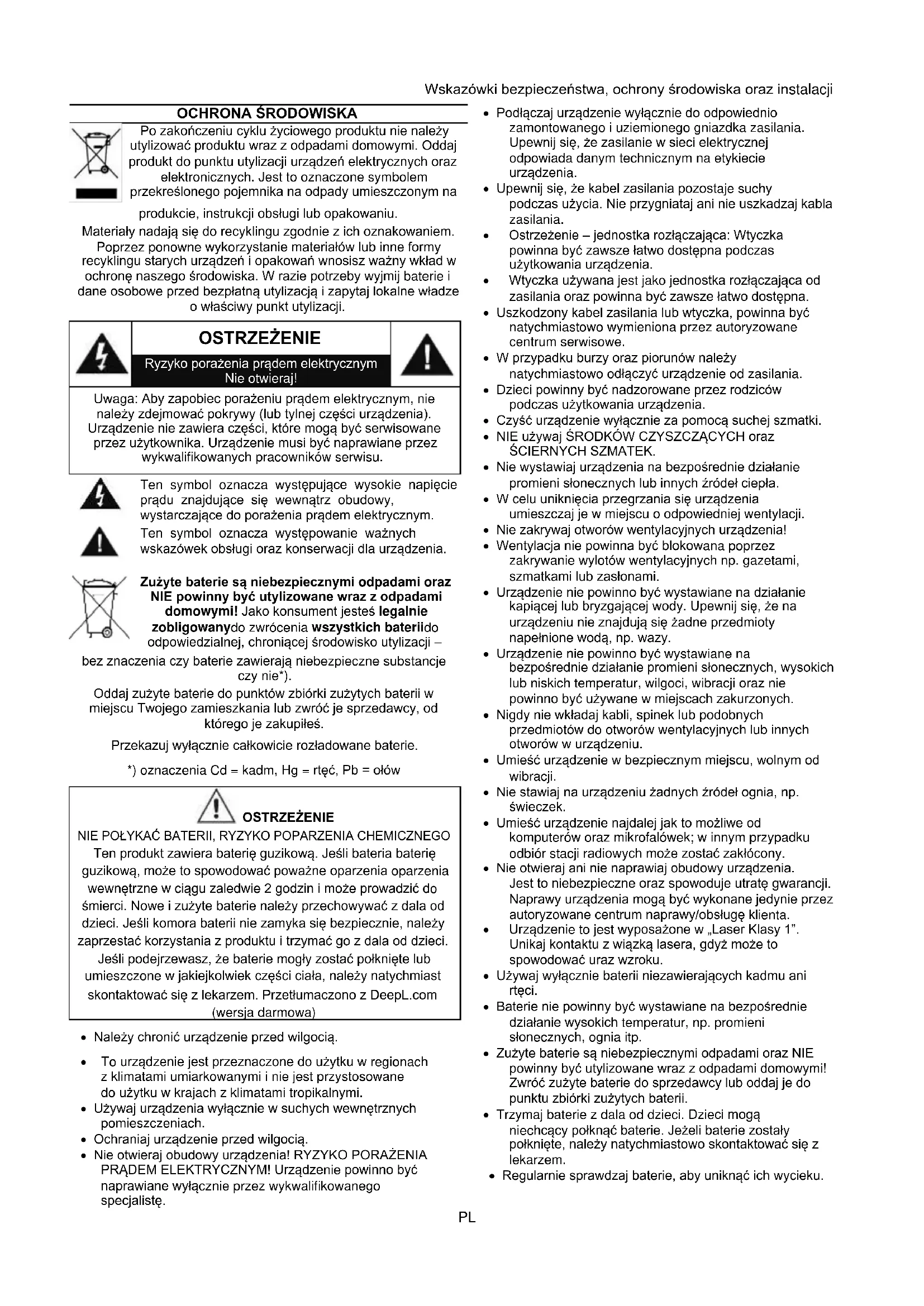 - Nie otwieraj obudowy urządzenia! RYZYKO PORAŻENIA PRĄDEM ELEKTRYCZNYM! Urządzenie powinno być naprawiane wyłącznie przez wykwalifikowanego specjalistę.