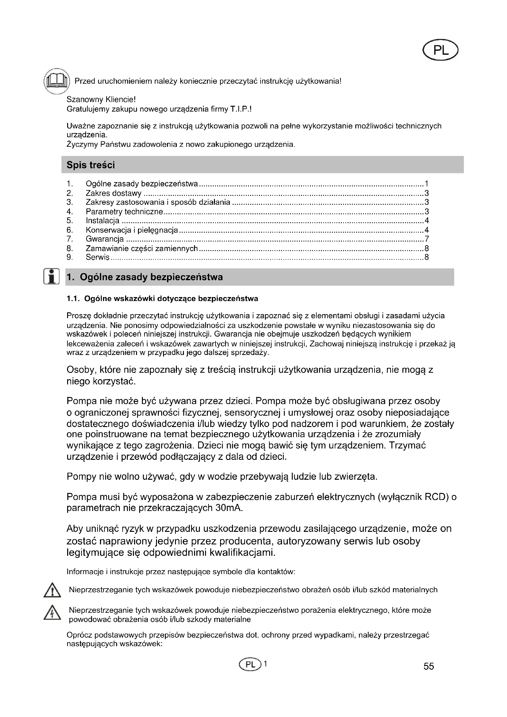 - Przed uruchomieniem należy koniecznie przeczytać instrukcję użytkowania! Szanowny Kliencie! Gratulujemy zakupu nowego urządzenia firmy T.I.P.! Uważne zapoznanie się z instrukcją użytkowania pozwoli na pełne wykorzystanie możliwości technicznych urządzenia. Życzymy Państwu zadowolenia z nowo zakupionego urządzenia. Spis treści 1. Ogólne zasady bezpieczeństwa p. 1