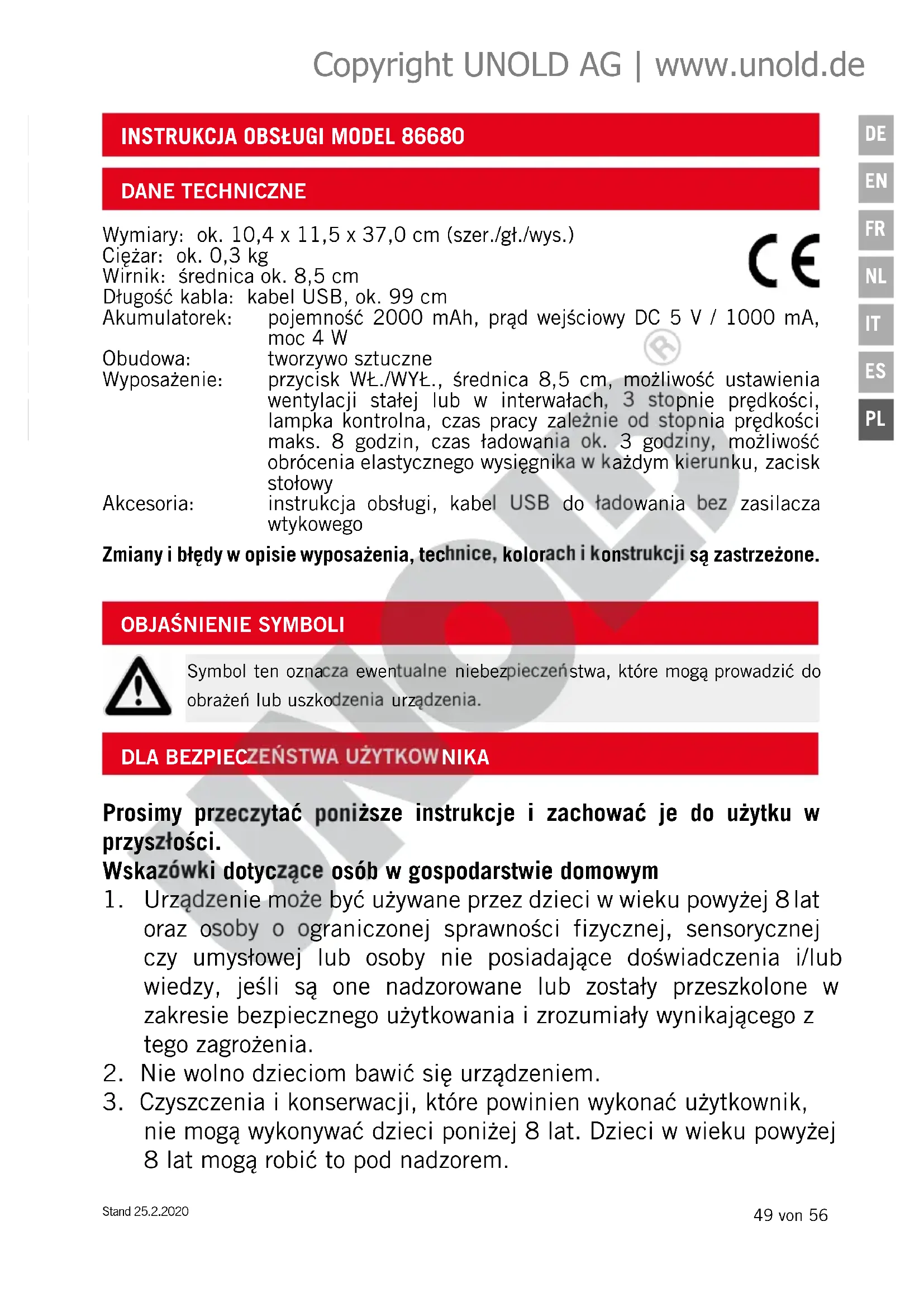 Symbol ten oznacza ewentualne niebezpieczeństwa, które mogą prowadzić do obrażeń lub uszkodzenia urządzenia. Wymiary: ok. 10,4 x 11,5 x 37,0 cm (szer./gł./wys.) Ciężar: ok. 0,3 kg Wirnik: średnica ok. 8,5 cm Długość kabla: kabel USB, ok. 99 cm Akumulatorek: pojemność 2000 mAh, prąd wejściowy DC 5 V / 1000 mA, moc 4 W Obudowa: tworzywo sztuczne Wyposażenie: przycisk WŁ./WYŁ., średnica 8,5 cm, możliwość ustawienia wentylacji stałej lub w interwałach, 3 stopnie prędkości, lampka kontrolna, czas pracy zależnie od stopnia prędkości maks. 8 godzin, czas ładowania ok. 3 godziny, możliwość obrócenia elastycznego wysięgnika w każdym kierunku, zacisk stołowy Akcesoria: instrukcja obsługi, kabel USB do ładowania bez zasilacza wtykowego Zmiany i błędy w opisie wyposażenia, technice, kolorach i konstrukcji są zastrzeżone. Copyright UNOLD AG | www.unold.de50 von 56 Stand 25.2.2020