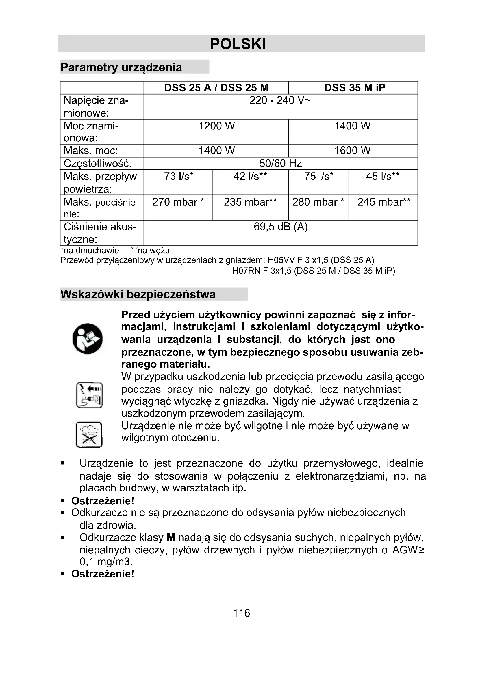 Moc znami- onowa: 1200 W 1400 W Maks. moc: 1400 W 1600 W Częstotliwość: 50/60 Hz Maks. przepływ powietrza: 73 l/s* 42 l/s** 75 l/s* 45 l/s** Maks. podciśnie- nie: 270 mbar * 235 mbar** 280 mbar * 245 mbar** Ciśnienie akus- tyczne: 69,5 dB (A) *na dmuchawie **na wężu Przewód przyłączeniowy w urządzeniach z gniazdem: H05VV F 3 x1,5 (DSS 25 A) H07RN F 3x1,5 (DSS 25 M / DSS 35 M iP) Wskazówki bezpieczeństwa
