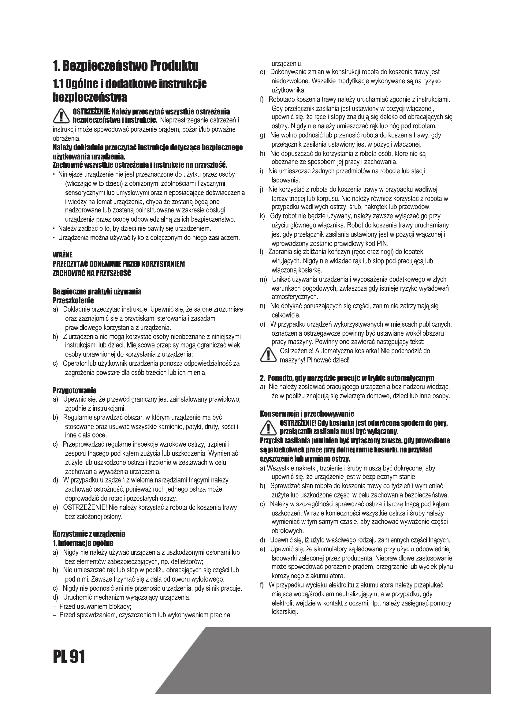 Bezpieczne praktyki używania Przeszkolenie a) Dokładnie przeczytać instrukcje. Upewnić się, że są one zrozumiałe oraz zaznajomić się z przyciskami sterowania i zasadami prawidłowego korzystania z urządzenia. b) Z urządzenia nie mogą korzystać osoby nieobeznane z niniejszymi instrukcjami lub dzieci. Miejscowe przepisy mogą ograniczać wiek osoby uprawnionej do korzystania z urządzenia; c) Operator lub użytkownik urządzenia ponoszą odpowiedzialność za zagrożenia powstałe dla osób trzecich lub ich mienia. Przygotowanie a) Upewnić się, że przewód graniczny jest zainstalowany prawidłowo, zgodnie z instrukcjami. b) Regularnie sprawdzać obszar, w którym urządzenie ma być stosowane oraz usuwać wszystkie kamienie, patyki, druty, kości i inne ciała obce. c) Przeprowadzać regularne inspekcje wzrokowe ostrzy, trzpieni i zespołu tnącego pod kątem zużycia lub uszkodzenia. Wymieniać zużyte lub uszkodzone ostrza i trzpienie w zestawach w celu zachowania wyważenia urządzenia. d) W przypadku urządzeń z wieloma narzędziami tnącymi należy zachować ostrożność, ponieważ ruch jednego ostrza może doprowadzić do rotacji pozostałych ostrzy. e) OSTRZEŻENIE! Nie należy korzystać z robota do koszenia trawy bez założonej osłony. Korzystanie z urządzenia