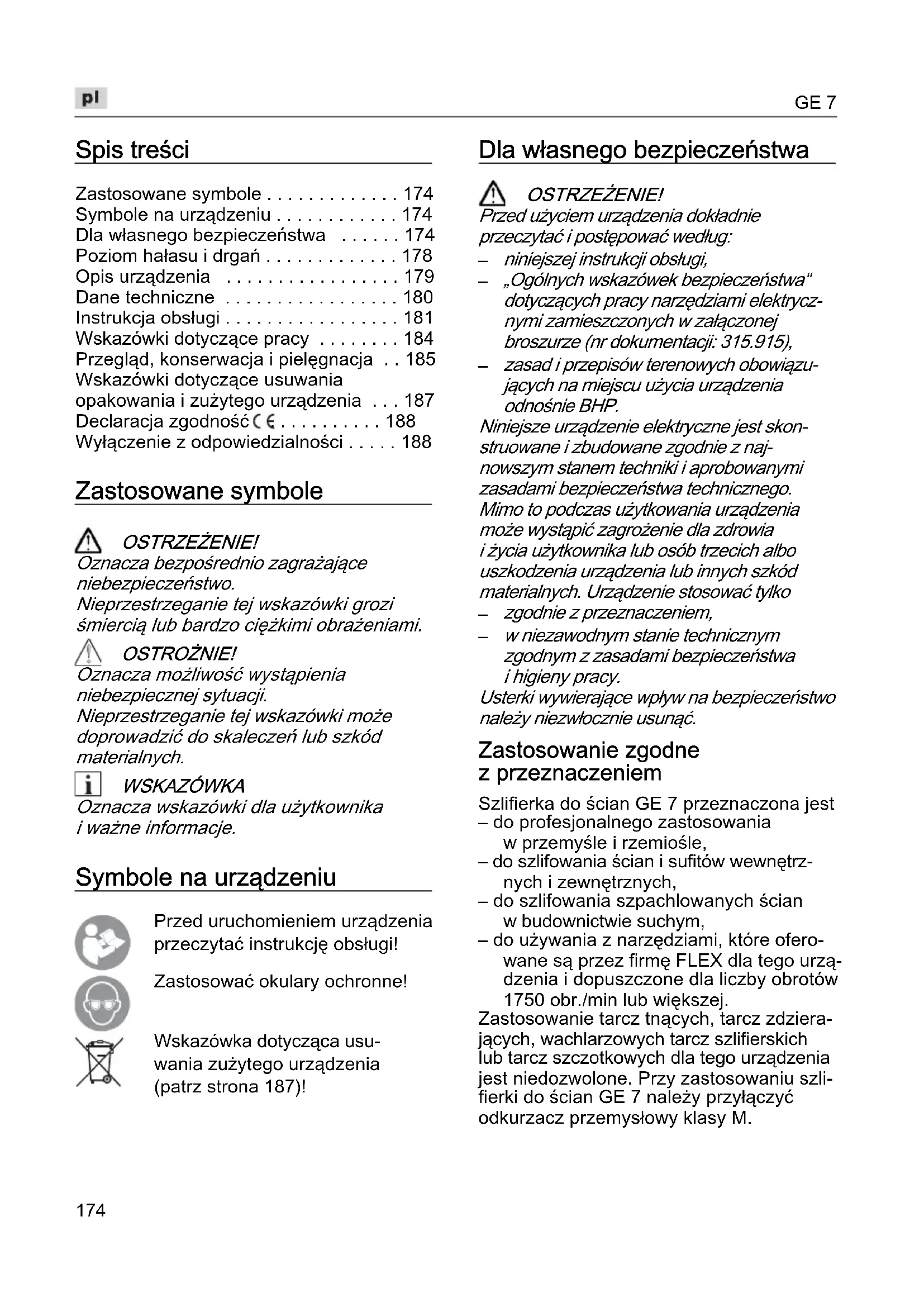 w niezawodnym stanie technicznym zgodnym z zasadami bezpieczeństwa i higieny pracy. Usterki wywierające wpływ na bezpieczeństwo należy niezwłocznie usunąć. Zastosowanie zgodne z przeznaczeniem Szlifierka do ścian GE 7 przeznaczona jest – do profesjonalnego zastosowania w przemyśle i rzemiośle, – do szlifowania ścian i sufitów wewnętrz- nych i zewnętrznych, – do szlifowania szpachlowanych ścian w budownictwie suchym, – do używania z narzędziami, które ofero- wane są przez firmę FLEX dla tego urzą- dzenia i dopuszczone dla liczby obrotów 1750 obr./min lub większej. Zastosowanie tarcz tnących, tarcz zdziera- jących, wachlarzowych tarcz szlifierskich lub tarcz szczotkowych dla tego urządzenia jest niedozwolone. Przy zastosowaniu szli- fierki do ścian GE 7 należy przyłączyć odkurzacz przemysłowy klasy M.GE 7