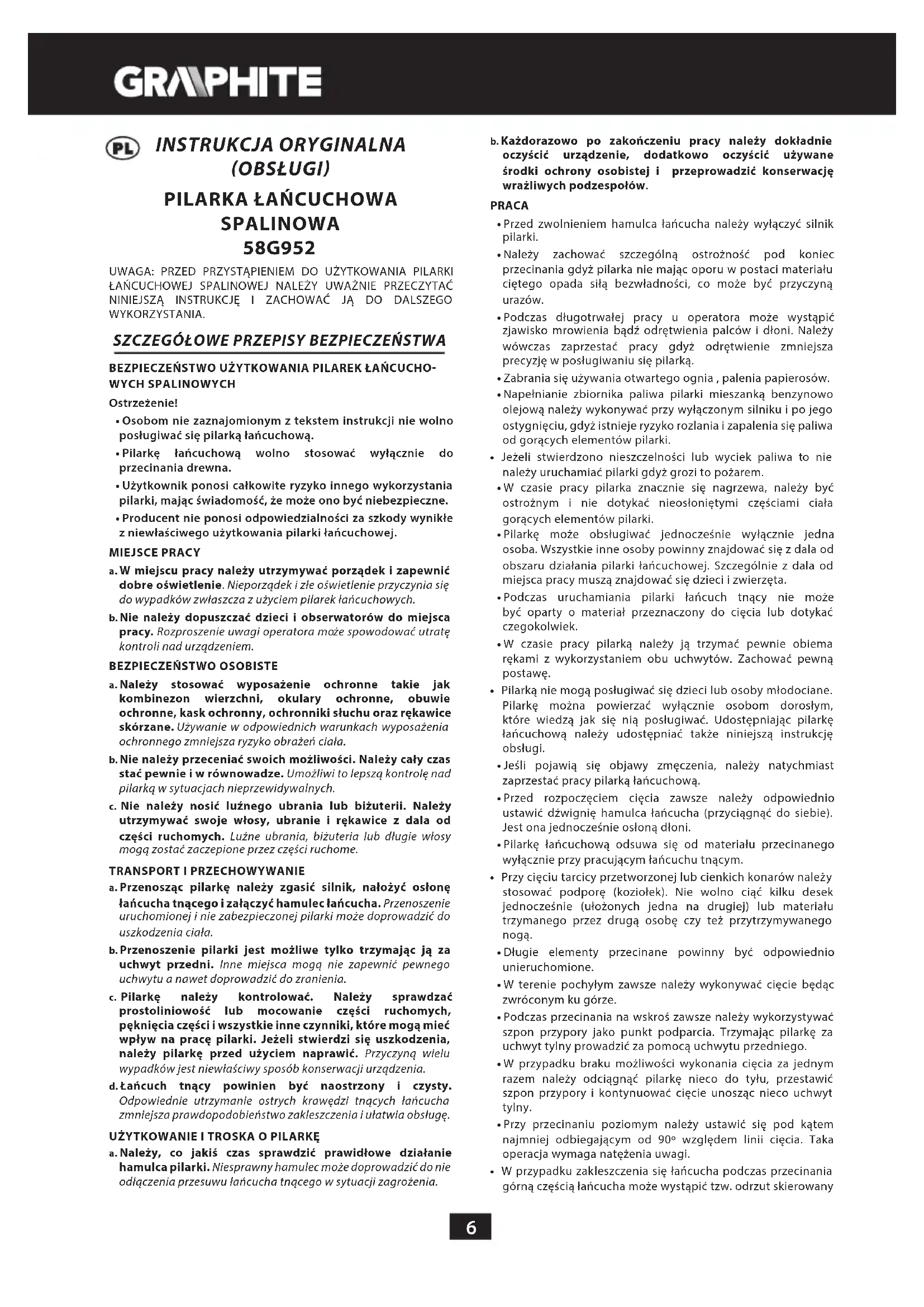 a. Należy, co jakiś czas sprawdzić prawidłowe działanie hamulca pilarki. Niesprawny hamulec może doprowadzić do nie odłączenia przesuwu łańcucha tnącego w sytuacji zagrożenia. b. Każdorazowo po zakończeniu pracy należy dokładnie oczyścić urządzenie, dodatkowo oczyścić używane środki ochrony osobistej i przeprowadzić konserwację wrażliwych podzespołów. PRACA