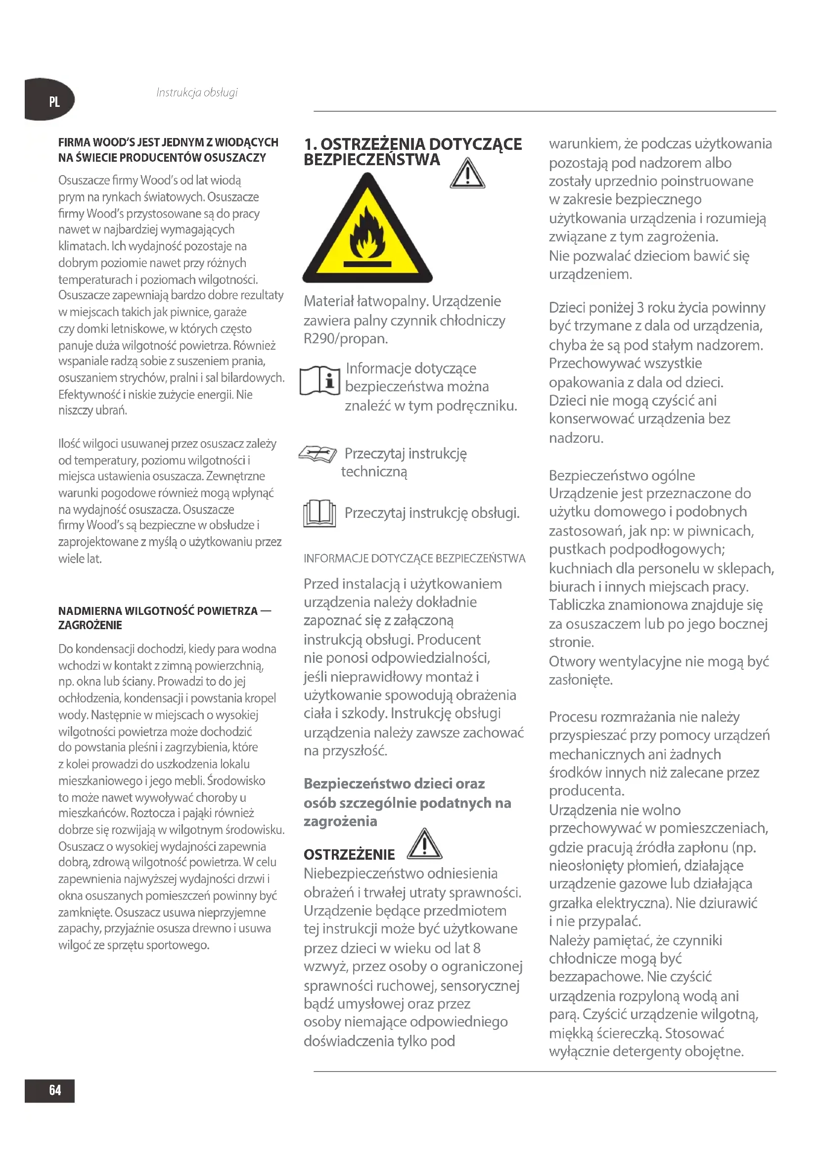 BEZPIECZEŃSTWA Materiał łatwopalny. Urządzenie zawiera palny czynnik chłodniczy R290/propan. Informacje dotyczące bezpieczeństwa można znaleźć w tym podręczniku. Przeczytaj instrukcję techniczną Przeczytaj instrukcję obsługi.