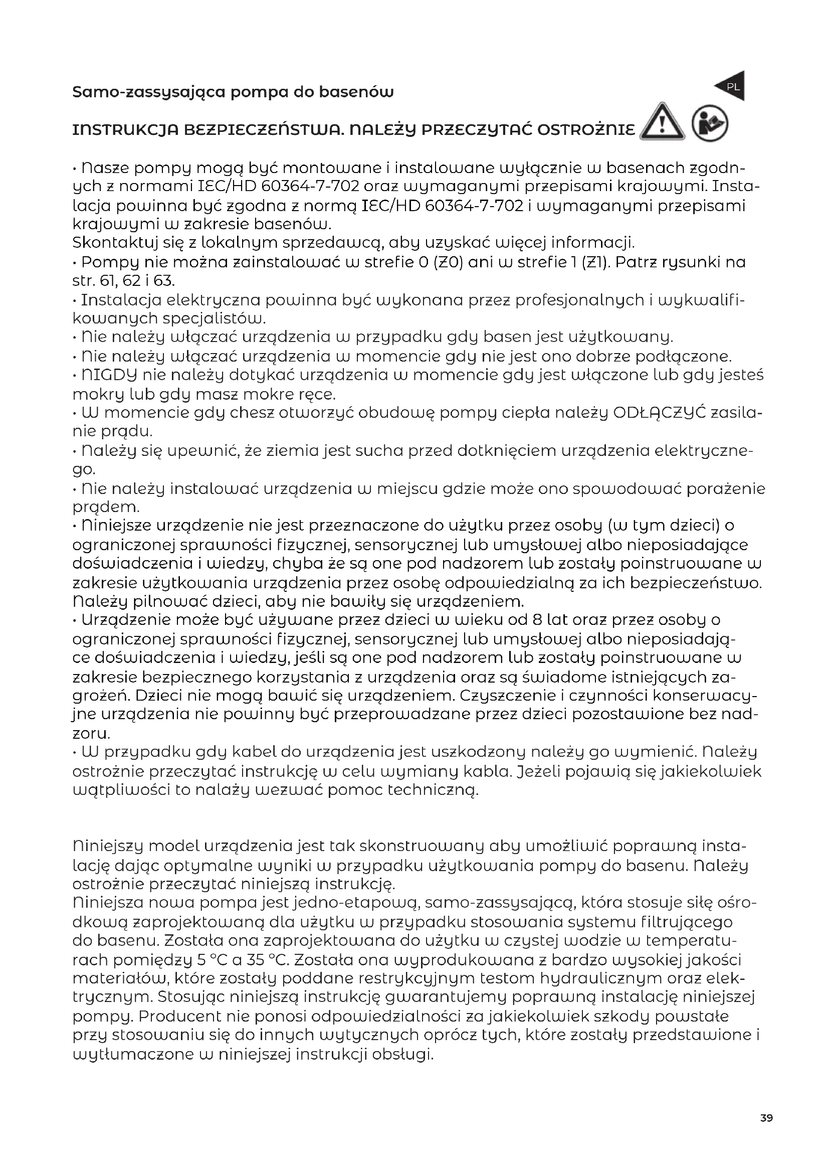 - W przypadku gdy kabel do urządzenia jest uszkodzony należy go wymienić. Należy ostrożnie przeczytać instrukcję w celu wymiany kabla. Jeżeli pojawią się jakiekolwiek wątpliwości to nalaży wezwać pomoc techniczną. Niniejszy model urządzenia jest tak skonstruowany aby umożliwić poprawną insta- lację dając optymalne wyniki w przypadku użytkowania pompy do basenu. Należy ostrożnie przeczytać niniejszą instrukcję. Niniejsza nowa pompa jest jedno-etapową, samo-zassysającą, która stosuje siłę ośro- dkową zaprojektowaną dla użytku w przypadku stosowania systemu filtrującego do basenu. Została ona zaprojektowana do użytku w czystej wodzie w temperatu- rach pomiędzy 5 ºC a 35 ºC. Została ona wyprodukowana z bardzo wysokiej jakości materiałów, które zostały poddane restrykcyjnym testom hydraulicznym oraz elek- trycznym. Stosując niniejszą instrukcję gwarantujemy poprawną instalację niniejszej pompy. Producent nie ponosi odpowiedzialności za jakiekolwiek szkody powstałe przy stosowaniu się do innych wytycznych oprócz tych, które zostały przedstawione i wytłumaczone w niniejszej instrukcji obsługi. PL40 WAŻNE Niniejsza instrukcja zawiera wszelkie niezbędne informacje jeżeli chodzi o środki be- zpieczeństwa, których należy przestrzegać w przypadku przeprowadzenia instalacji oraz uruchomienia urządzenia. Instalator oraz użytkownik urządzenia musi zatem zapoznać się z instrukcją przed przystąpieniem do instalacji oraz uruchomienia urzą- dzenia. OGÓLNE ZASADY DOTYCZĄCE BEZPIECZEŃSTWA
