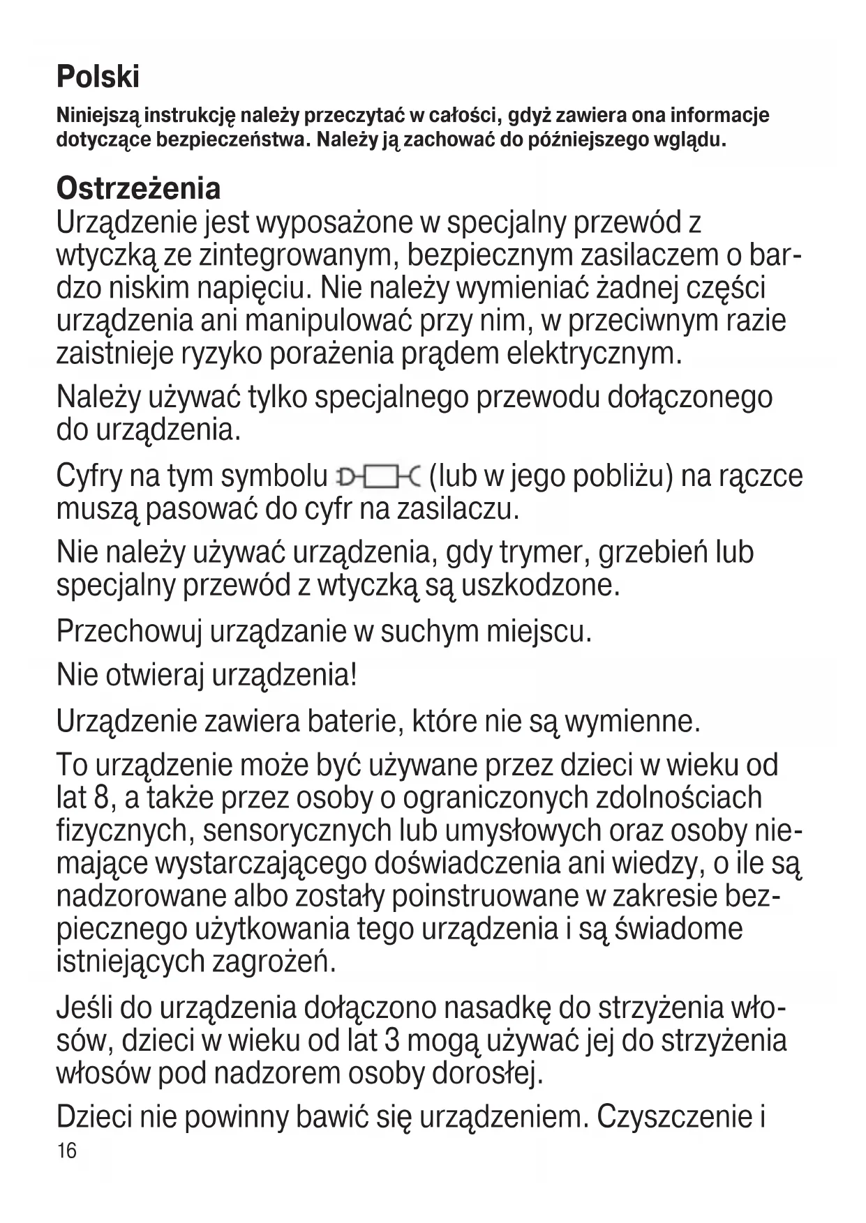 - selon les modèles ** le design peut varier Pour les spécifications électriques, voir les indications sur le bloc d‘alimentation. 90340910_Type5516_BT3421_3420_3411_3410_3400x_CEEMEA.indd 1490340910_Type5516_BT3421_3420_3411_3410_3400x_CEEMEA.indd 14 20.07.22 10:0320.07.22 10:0315 Note environnementale Ce produit contient des batteries et/ou des déchets électriques recyclables. Pour la protection de l’environnement, ne pas jeter avec les ordures ménagères, mais les porter dans les points de recyclage de déchets électriques disponibles dans votre pays. Sujet à des modifications sans préavis. Garantie Nous accordons une garantie de 2 ans sur ce produit, à partir de la date d’achat. Pendant la durée de la garantie, Braun prendra gratuitement à sa charge la réparation des vices de fabrication ou de matériaux en se réservant le droit de décider si certaines pièces doivent être réparées ou si l’appareil lui-même doit être échangé. Cette garantie s’étend à tous les pays où cet appareil est commercialisé par Braun ou son distributeur. Cette garantie ne couvre pas : les dommages occasionnés par une utilisation inadé- quate, l’usure normale (par exemple, grille et bloc couteau) ainsi que les défauts d’usures qui ont un effet négligeable sur la valeur ou l’utilisation de l’appareil. Cette garantie devient caduque si des réparations ont été effectuées par des personnes non agréées par Braun et si des pièces de rechange ne provenant pas de Braun ont été utili- sées. Pour toute réclamation intervenant pendant la période de garantie, retournez ou rappor- tez l’appareil ainsi que l’attestation de garantie à votre revendeur ou à un centre de service agréé Braun. Veuillez vous référer à www.service.braun.com ou appeler le 0 800 944 802 (service consommateurs – service & appel gratuits) pour connaître le centre de service agréé Braun le plus proche de chez vous. Clause spéciale pour la France Outre la garantie contractuelle exposée ci-dessus, nos clients bénéficient de la garantie légale des vices cachés prévue aux articles 1641 et suivants du Code civil. 90340910_Type5516_BT3421_3420_3411_3410_3400x_CEEMEA.indd 1590340910_Type5516_BT3421_3420_3411_3410_3400x_CEEMEA.indd 15 20.07.22 10:0320.07.22 10:0316 Polski Niniejszą instrukcję należy przeczytać w całości, gdyż zawiera ona informacje dotyczące bezpieczeństwa. Należy ją zachować do późniejszego wglądu. Ostrzeżenia Urządzenie jest wyposażone w specjalny przewód z wtyczką ze zintegrowanym, bezpiecznym zasilaczem o bar- dzo niskim napięciu. Nie należy wymieniać żadnej części urządzenia ani manipulować przy nim, w przeciwnym razie zaistnieje ryzyko porażenia prądem elektrycznym. Należy używać tylko specjalnego przewodu dołączonego do urządzenia. Cyfry na tym symbolu (lub w jego pobliżu) na rączce muszą pasować do cyfr na zasilaczu. Nie należy używać urządzenia, gdy trymer, grzebień lub specjalny przewód z wtyczką są uszkodzone. Przechowuj urządzanie w suchym miejscu. Nie otwieraj urządzenia! Urządzenie zawiera baterie, które nie są wymienne. To urządzenie może być używane przez dzieci w wieku od lat 8, a także przez osoby o ograniczonych zdolnościach fizycznych, sensorycznych lub umysłowych oraz osoby nie- mające wystarczającego doświadczenia ani wiedzy, o ile są nadzorowane albo zostały poinstruowane w zakresie bez- piecznego użytkowania tego urządzenia i są świadome istniejących zagrożeń. Jeśli do urządzenia dołączono nasadkę do strzyżenia wło- sów, dzieci w wieku od lat 3 mogą używać jej do strzyżenia włosów pod nadzorem osoby dorosłej. Dzieci nie powinny bawić się urządzeniem. Czyszczenie i 90340910_Type5516_BT3421_3420_3411_3410_3400x_CEEMEA.indd 1690340910_Type5516_BT3421_3420_3411_3410_3400x_CEEMEA.indd 16 20.07.22 10:0320.07.22 10:0317 konserwacja urządzenia nie mogą być wykonywane przez dzieci. Wyłącznie do użytku domowego. Uwaga Podczas ładowania należy upewnić się, że urządzenie jest wyłączone. Ważne Zalecana temperatura otoczenia podczas ładowania wynosi od 5 °C do 35 °C. Akumulator może nie naładować się prawidłowo w ekstremalnie niskiej lub wysokiej temperaturze. Zalecana temperatura otoczenia podczas korzystania z trymera wynosi od 15 °C do 35 °C. Nie należy wystawiać urządzenia na temperatury wyższe niż 50 °C na dłuższy czas. Aby nakładki działały prawidłowo, należy regularnie smarować trymer oraz folie kroplą lekkiego oleju maszynowego (nie jest dołączany). Opis produktu 1a Głowica trymera*/** 1b Głowica precyzyjnego trymera*/** 1c Mała głowica golarki foliowej* 2 Selektor długości 3 Przełącznik on/off (Wł./Wył.) 4 Gniazdo zasilania 5 Zasilacz** 6 Wskaźnik ładowania 7 Nakładka do precyzyjnego przycinania zarostu (0,5-10 mm)*/** 8 Nakładka do precyzyjnego przycinania włosów (10,5-20 mm)*/**