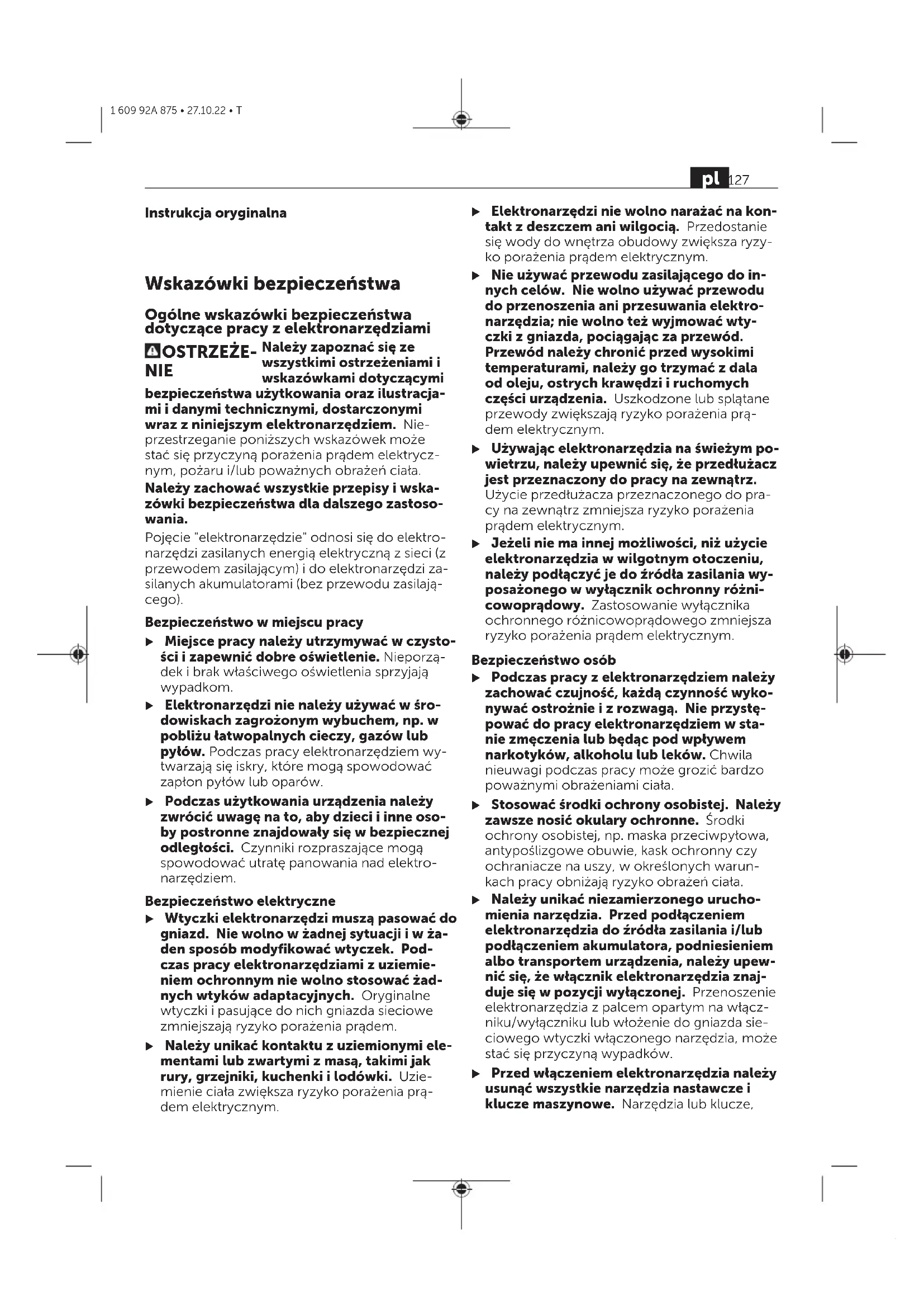 130 pl 1 609 92A 875 • 27.10.22 • T(Dane dotyczące cięcia płyt wiórowych obowią- zują dla materiału o grubości 20mm.) Podany w niniejszej instrukcji poziom drgań i po- ziom emisji hałasu zostały zmierzone zgodnie ze znormalizowaną procedurą pomiarową i mogą zostać użyte do porównywania elektronarzędzi. Można ich także użyć do wstępnej oceny pozio- mu drgań i poziomu emisji hałasu. Podany poziom drgań i poziom emisji hałasu jest reprezentatywny dla podstawowych zastosowań elektronarzędzia. Jeżeli elektronarzędzie użyte zostanie do innych zastosowań lub z innymi na- rzędziami roboczymi, a także jeśli nie będzie właściwie konserwowane, poziom drgań i po- ziom emisji hałasu mogą różnić się od podanych wartości. Podane powyżej przyczyny mogą spo- wodować podwyższenie poziomu drgań i pozio- mu emisji hałasu w czasie pracy. Aby dokładnie ocenić poziom drgań i poziom emisji hałasu, należy wziąć pod uwagę także okresy, gdy urządzenie jest wyłączone lub gdy jest ono wprawdzie włączone, ale nie jest uży- wane do pracy. Podane powyżej przyczyny mo- gą spowodować obniżenie poziomu drgań i po- ziomu emisji hałasu w czasie pracy. Należy wprowadzić dodatkowe środki bezpie- czeństwa, mające na celu ochronę osoby obsłu- gującej przed skutkami ekspozycji na drgania, np.: konserwacja elektronarzędzia i narzędzi ro- boczych, zapewnienie odpowiedniej temperatu- ry, aby nie dopuścić do wyziębienia rąk, właści- wa organizacja czynności wykonywanych pod- czas pracy. AkumulatorPolski Ładowanie akumulatoraPolski u Należy stosować wyłącznie ładowarki wy- szczególnione w danych technicznych. Tyl- ko te ładowarki dostosowane są do ładowania zastosowanego w elektronarzędziu akumula- tora litowo-jonowego. Wskazówka: Ze względu na międzynarodowe przepisy transportowe w momencie dostawy akumulatory litowo-jonowe są częściowo nała- dowane. Aby zagwarantować wykorzystanie naj- wyższej wydajności akumulatora, należy przed pierwszym użyciem całkowicie naładować aku- mulator. Wkładanie akumulatoraPolski Wsunąć naładowany akumulator w uchwyt aku- mulatora aż do wyczuwalnego zablokowania. Wyjmowanie akumulatoraPolski W celu wyjęcia akumulatora nacisnąć przycisk odblokowujący i wyjąć akumulator. Nie należy przy tym używać siły. Akumulatorposiada 2 stopnie blokady, zapobie- gające jego wypadnięciu w przypadku niezamie- rzonego naciśnięcia przycisku odblokowujące- goakumulator. Akumulator, umieszczony w elektronarzędziu, przytrzymywany jest na miej- scu za pomocą sprężyny. Wskaźnik stanu naładowania akumulatoraPolski Zielone diody LED wskaźnika stanu naładowania akumulatora pokazują stan naładowania akumu- latora. Ze względów bezpieczeństwa stan nała- dowania akumulatora można skontrolować tylko przy wyłączonym elektronarzędziu. Nacisnąć przycisk wskaźnika stanu naładowania lub , aby pojawiło się wskazanie stanu nała- dowania. Można to zrobić także po wyjęciu aku- mulatora. Jeżeli po naciśnięciu przycisku wskaźnika stanu naładowania nie świeci się żadna dioda LED, oznacza to, że akumulator jest uszkodzony i na- leży go wymienić. Typ akumulatora GBA 18V...Polski Dioda LED Pojemność Światło ciągłe, 3zielone diody 60–100% Światło ciągłe, 2zielone diody 30–60% Światło ciągłe, 1zielona dioda 5–30% Światło migające, 1zielona dioda 0–5% Typ akumulatora ProCORE18V...Polski Dioda LED Pojemność Światło ciągłe, 5zielonych diod 80–100% Światło ciągłe, 4zielone diody 60–80% Światło ciągłe, 3zielone diody 40–60% Światło ciągłe, 2zielone diody 20–40% Światło ciągłe, 1zielona dioda 5–20% Światło migające, 1zielona dioda 0–5% pl 131 1 609 92A 875 • 27.10.22 • TWskazówki dotyczące właściwego postępowania z akumulatoremPolski Akumulator należy chronić przed wilgocią iwo- dą. Akumulator należy przechowywać wyłącznie wtemperaturze od –20°C do 50°C. Nie wolno pozostawiać akumulatora, np. latem, w samo- chodzie. Otwory wentylacyjne należy regularnie czyścić za pomocą miękkiego, czystego i suchego pę- dzelka. Zdecydowanie krótszy czas pracy po ładowaniu wskazuje na zużycie akumulatora i konieczność wymiany na nowy. Przestrzegać wskazówek dotyczących utylizacji odpadów. MontażPolski u Przed przystąpieniem do jakichkolwiek prac przy elektronarzędziu (np. prace kon- serwacyjne, wymiana osprzętu itp.), a także na czas transportu i przechowywania nale- ży wyjąć z niego akumulator. Niezamierzone uruchomienie włącznika/wyłącznika grozi ska- leczeniem. Zakładanie/wymiana brzeszczotuPolski u Podczas montażu i wymiany narzędzia ro- boczego należy używać rękawic ochron- nych. Narzędzia robocze są bardzo ostre, a przy dłuższym użytkowaniu mogą rozgrzać się do wysokich temperatur. u Przy wymianie brzeszczotu należy zwrócić uwagę, by uchwyt mocujący nie był zabru- dzony pozostałościami po obrabianych ma- teriałach, np. wiórami drewnianymi lub me- talowymi. Wybór brzeszczotuPolski Należy stosować wyłącznie brzeszczoty z chwy- tem uniwersalnym 1/2". Brzeszczot nie powinien być dłuższy, niż wymaga tego zaplanowane cię- cie. Zakładanie brzeszczotu (zob.rys.A)Polski Obrócić tuleję zabezpieczającą(3) o ok. 90° w kierunku oznaczonym strzałką i przytrzymać ją w tej pozycji. Włożyć brzeszczot(1) w uchwyt brzeszczotu(10). Zwolnić tuleję zabezpieczają- cą. u Skontrolować prawidłowe zamocowanie, pociągając za brzeszczot. Niewłaściwie za- mocowany brzeszczot może wypaść i spowo- dować obrażenia. Do określonych prac brzeszczot(1) można od- wrócić o 180° (zębami do góry) i dopiero wtedy zamocować w uchwycie. Wyjmowanie brzeszczotu (zob.rys.B)Polski u Przed wyjęciem brzeszczotu należy zacze- kać, aż brzeszczot się schłodzi. Dotknięcie gorącego brzeszczotu może spowodować obrażenia. Obrócić tuleję zabezpieczają