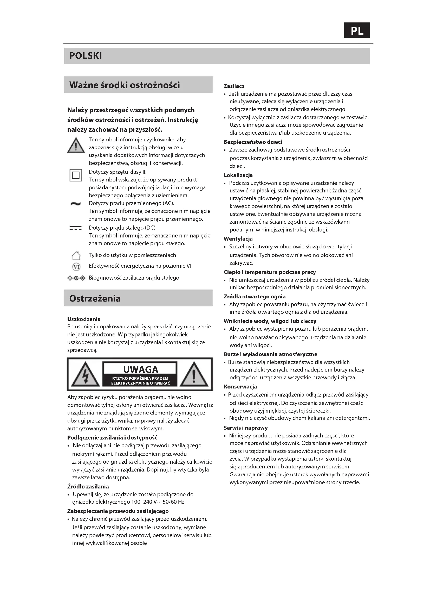 Ten symbol informuje użytkownika, aby zapoznał się z instrukcją obsługi w celu uzyskania dodatkowych informacji dotyczących bezpieczeństwa, obsługi i konserwacji.Dotyczy sprzętu klasy II.Ten symbol wskazuje, że opisywany produkt posiada system podwójnej izolacji i nie wymaga bezpiecznego połączenia zuziemieniem.Dotyczy prądu przemiennego (AC).Ten symbol informuje, że oznaczone nim napięcie znamionowe to napięcie prądu przemiennego.Dotyczy prądu stałego (DC) Ten symbol informuje, że oznaczone nim napięcie znamionowe to napięcie prądu stałego.Tylko do użytku w pomieszczeniachEfektywność energetyczna na poziomie VIBiegunowość zasilacza prądu stałego Ostrzeżenia UszkodzeniaPo usunięciu opakowania należy sprawdzić, czy urządzenie nie jest uszkodzone. W przypadku jakiegokolwiek uszkodzenia nie korzystaj zurządzenia i skontaktuj się ze sprzedawcą. UWAGA RYZYKO PORAŻENIA PRĄDEMELEKTRYCZNYM NIE OTWIERAĆAby zapobiec ryzyku porażenia prądem,, nie wolno demontować tylnej osłony ani otwierać zasilacza. Wewnątrz urządzenia nie znajdują się żadne elementy wymagające obsługi przez użytkownika; naprawy należy zlecać autoryzowanym punktom serwisowym.Podłączenie zasilania i dostępność