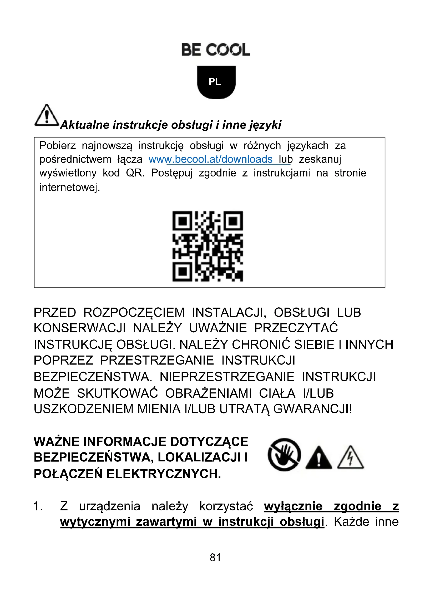 Pobierz najnowszą instrukcję obsługi w różnych językach za pośrednictwem łącza www.becool.at/downloads lub zeskanuj wyświetlony kod QR. Postępuj zgodnie z instrukcjami na stronie internetowej.