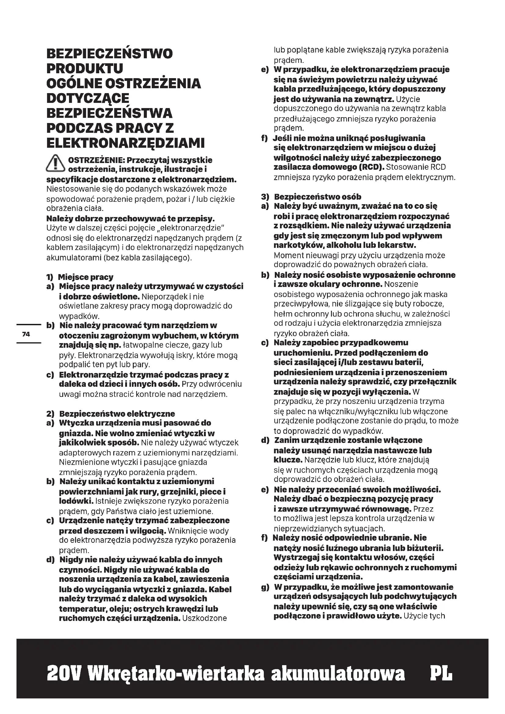 a) Należy być uważnym, zważać na to co się robi i pracę elektronarzędziem rozpoczynać z rozsądkiem. Nie należy używać urządzenia gdy jest się zmęczonym lub pod wpływem narkotyków, alkoholu lub lekarstw. Moment nieuwagi przy użyciu urządzenia może doprowadzić do poważnych obrażeń ciała. b) Należy nosić osobiste wyposażenie ochronne i zawsze okulary ochronne. Noszenie osobistego wyposażenia ochronnego jak maska przeciwpyłowa, nie ślizgające się buty robocze, hełm ochronny lub ochrona słuchu, w zależności od rodzaju i użycia elektronarzędzia zmniejsza ryzyko obrażeń ciała. c) Należy zapobiec przypadkowemu uruchomieniu. Przed podłączeniem do sieci zasilającej i/lub zestawu baterii, podniesieniem urządzenia i przenoszeniem urządzenia należy sprawdzić, czy przełącznik znajduje się w pozycji wyłączenia. W przypadku, że przy noszeniu urządzenia trzyma się palec na włączniku/wyłączniku lub włączone urządzenie podłączone zostanie do prądu, to może to doprowadzić do wypadków. d) Zanim urządzenie zostanie włączone należy usunąć narzędzia nastawcze lub klucze. Narzędzie lub klucz, które znajdują się w ruchomych częściach urządzenia mogą doprowadzić do obrażeń ciała. e) Nie należy przeceniać swoich możliwości. Należy dbać o bezpieczną pozycję pracy i zawsze utrzymywać równowagę. Przez to możliwa jest lepsza kontrola urządzenia w nieprzewidzianych sytuacjach. f) Należy nosić odpowiednie ubranie. Nie natęży nosić luźnego ubrania lub biżuterii. Wystrzegaj się kontaktu włosów, części odzieży lub rękawic ochronnych z ruchomymi częściami urządzenia. g) W przypadku, że możliwe jest zamontowanie urządzeń odsysających lub podchwytujących należy upewnić się, czy są one właściwie podłączone i prawidłowo użyte. Użycie tych75 20V Wkrętarko-wiertarka akumulatorowa PL urządzeń zmniejsza zagrożenie spowodowane pyłami. h) Częste używanie urządzenia i rutyna może osłabić twoją uwagę i być przyczyną niedotrzymywania zasad bezpieczeństwa. Nieuważne działanie może spowodować poważne szkody w ułamku sekundy.