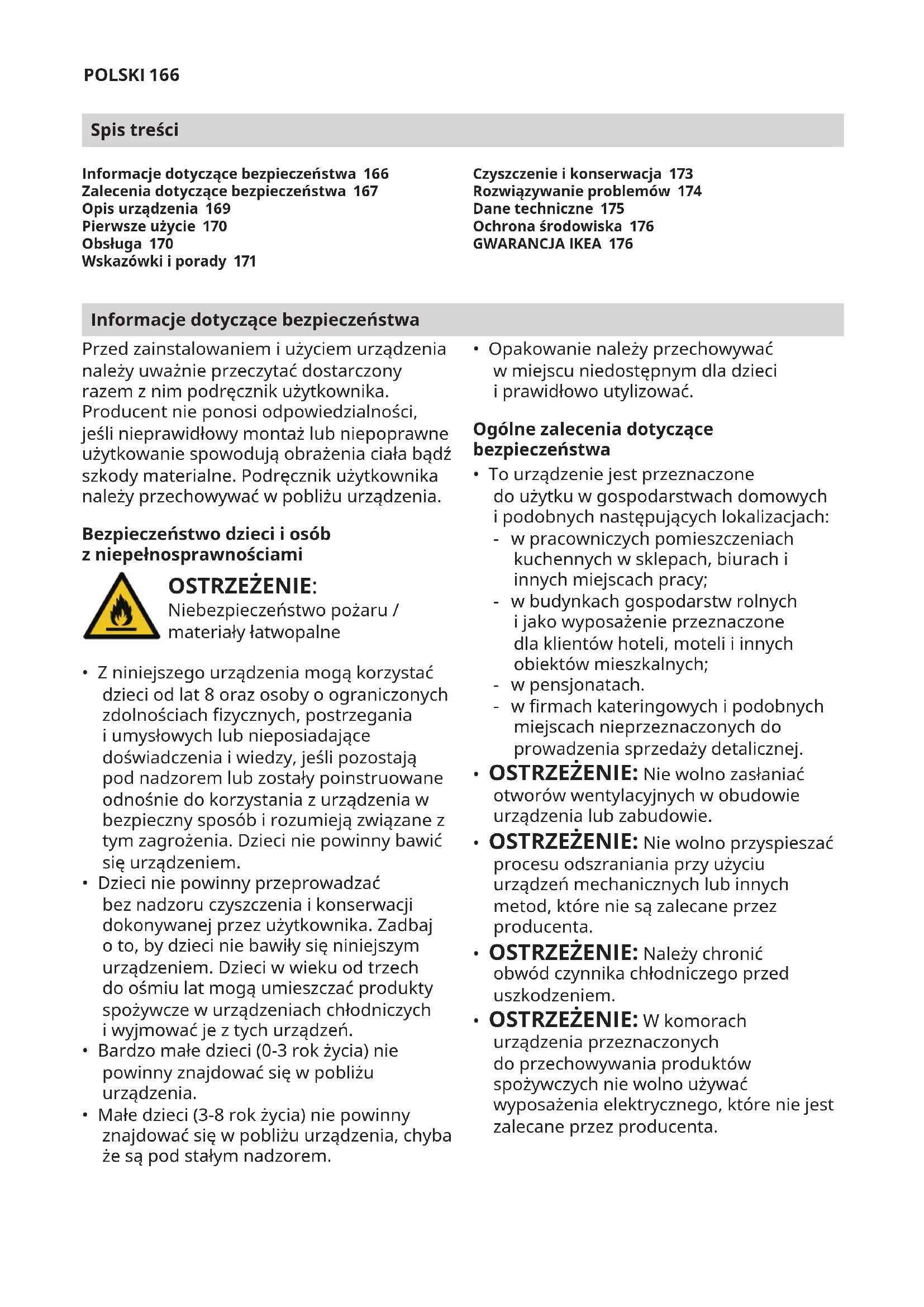 - uzyskanieinformacjidotyczącychdziałania urządzeńsprzedawanychwIKEA. Abyzapewnićjaknajlepsząpomocznaszejstrony, przedkontaktemznami,prosimyodokładne zapoznaniesięzinstrukcjązabudowyi/lubinstrukcją obsługi. Punkty serwisowe wyznaczone przez IKEA Numerytelefonów usługposprzedażowych rekomendowanychprzez IKEAznajdziesznakońcutego podręcznikaużytkownika.POLSKI 178 Abyszybciej uzyskać pomoc techniczną, użyj numerów telefonów podanych nakońcu tego podręcznika. Zawsze korzystaj znumerów podanych wpodręczniku użytkownika dostarczonym razem zurządzeniem, dla którego chcesz uzyskać pomoc techniczną. Pamiętaj, by podać 8-cyfrowy numer artykułu i 22-cyfrowy numer seryjny ukazane na tabliczce znamionowej urządzenia. ZACHOWAJ DOWÓD ZAKUPU! Abykorzystaćzusługgwarancyjnych,należy okazaćoryginałparagonulubfaktury, potwierdzającyzakupurządzenia.Dowódzakupu zawierarównieżnazwęoraznumerartykułuIKEA (ośmiocyfrowykod)dlakażdegozzakupionych urządzeń. Czy potrzebujecie Państwo dodatkowej pomocy? Wprzypadkudodatkowychpytań,któreniedotyczą urządzeńzakupionychwIKEAprosimyokontakt znajbliższymcentruminformacyjnymIKEA. Przedskontaktowaniemsięznaminależyuważnie przeczytaćdokumentacjęurządzenia. Informacje o częściach zamiennych - Następująceczęścizamiennebędądostępnedla punktówserwisowychprzezokresconajmniej siedmiulatodwprowadzeniadosprzedaży ostatniegoegzemplarzategomodelu:termostaty, czujnikitemperatury,płytkidrukowaneiźródła światła. - Następująceczęścizamienne:uchwytydo drzwiczek,zawiasydodrzwiczek,paletyikoszyki będądostępnedlapunktówserwisowychi użytkownikówkońcowychprzezokresconajmniej siedmiulat,natomiastuszczelkidodrzwiczek przezokresconajmniej10latodwprowadzeniado sprzedażyostatniegoegzemplarzategomodelu. Częścizamiennemożnaznaleźćnastronie: www.ikea.comРУССКИЙ 179
