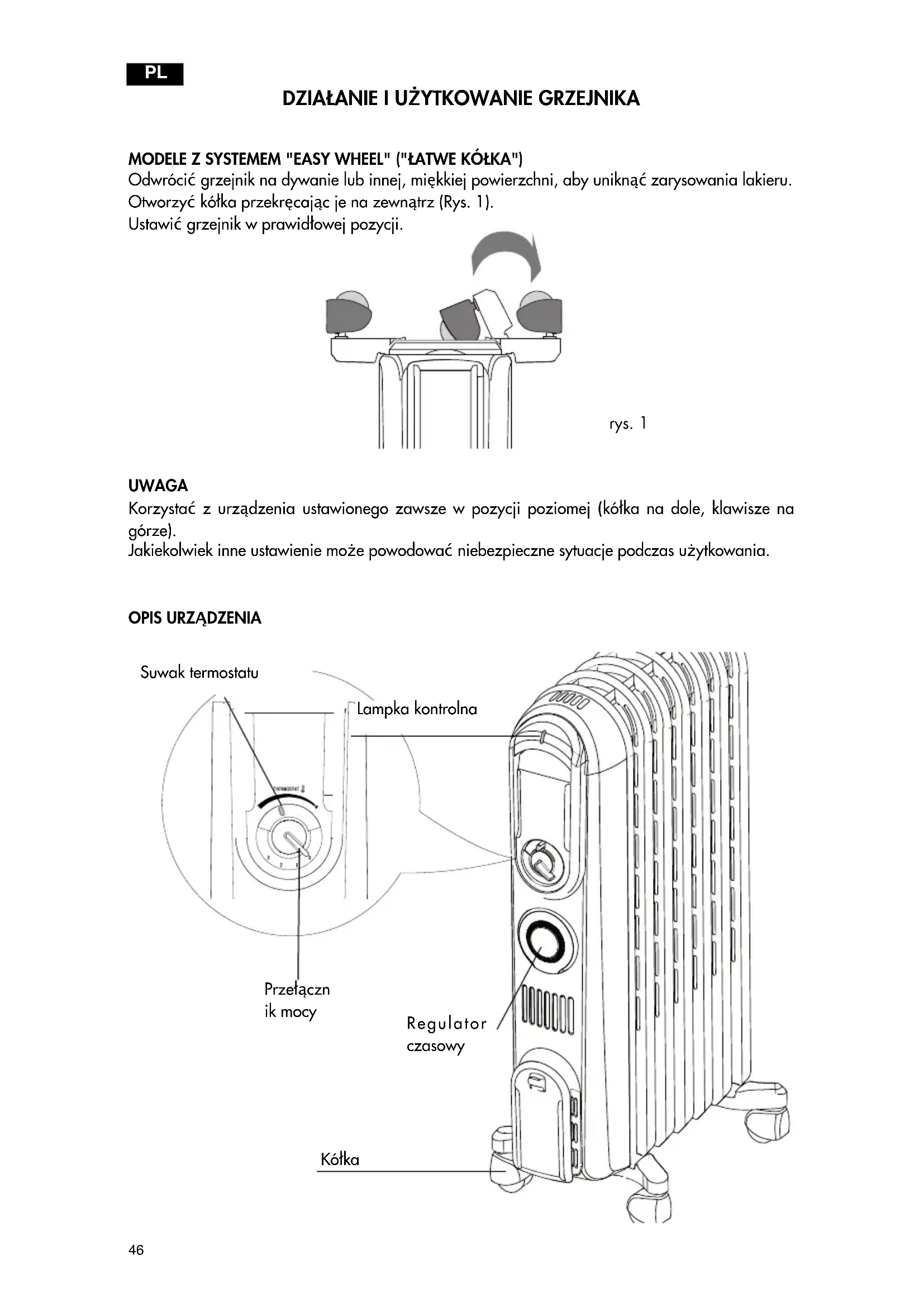 rys. 1 Lampka kontrolna Suwak termostatu Regulator czasowy Przełączn ik mocy Kółka PL47