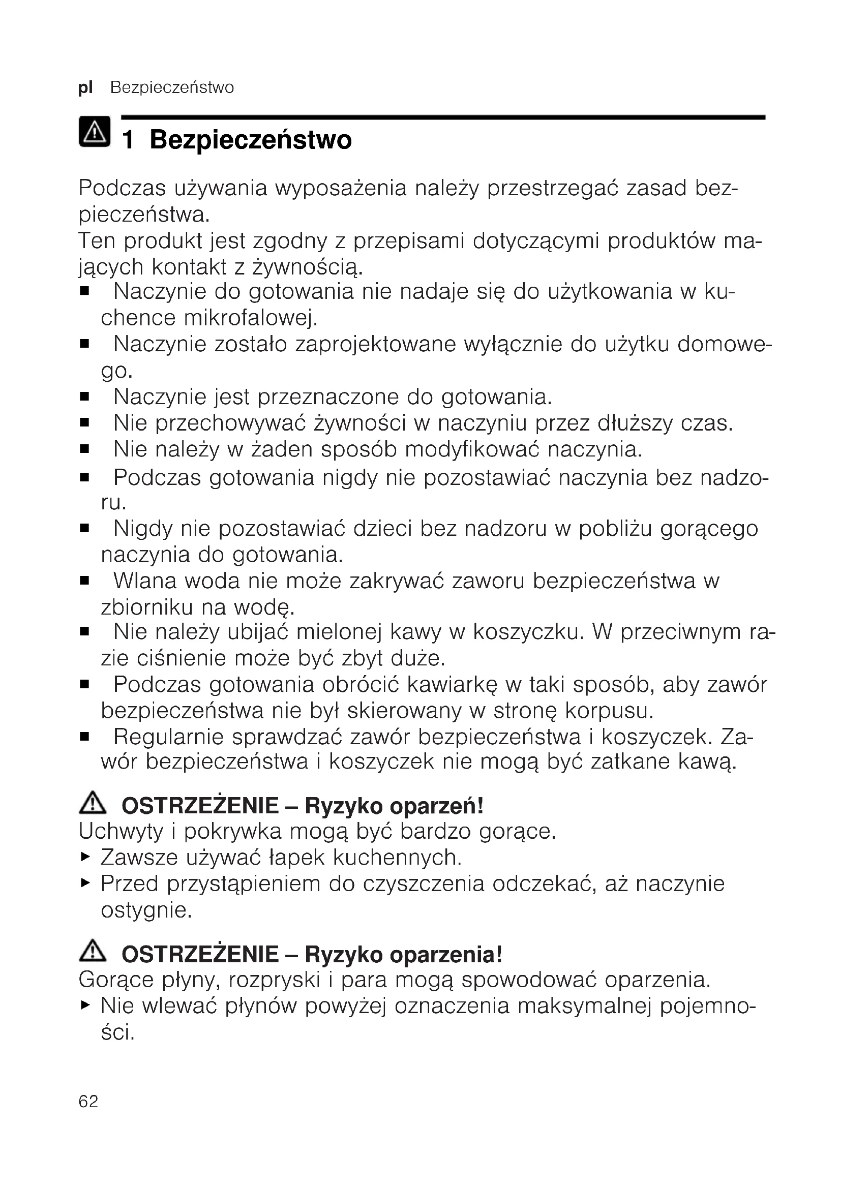 1 Bezpieczeństwo Podczas używania wyposażenia należy przestrzegać zasad bez- pieczeństwa. Ten produkt jest zgodny z przepisami dotyczącymi produktów ma- jących kontakt z żywnością. ¡ Naczynie do gotowania nie nadaje się do użytkowania w ku- chence mikrofalowej. ¡ Naczynie zostało zaprojektowane wyłącznie do użytku domowe- go. ¡ Naczynie jest przeznaczone do gotowania. ¡ Nie przechowywać żywności w naczyniu przez dłuższy czas. ¡ Nie należy w żaden sposób modyfikować naczynia. ¡ Podczas gotowania nigdy nie pozostawiać naczynia bez nadzo- ru. ¡ Nigdy nie pozostawiać dzieci bez nadzoru w pobliżu gorącego naczynia do gotowania. ¡ Wlana woda nie może zakrywać zaworu bezpieczeństwa w zbiorniku na wodę. ¡ Nie należy ubijać mielonej kawy w koszyczku. W przeciwnym ra- zie ciśnienie może być zbyt duże. ¡ Podczas gotowania obrócić kawiarkę w taki sposób, aby zawór bezpieczeństwa nie był skierowany w stronę korpusu. ¡ Regularnie sprawdzać zawór bezpieczeństwa i koszyczek. Za- wór bezpieczeństwa i koszyczek nie mogą być zatkane kawą. OSTRZEŻENIE‒Ryzyko oparzeń! Uchwyty i pokrywka mogą być bardzo gorące. ▶ Zawsze używać łapek kuchennych. ▶ Przed przystąpieniem do czyszczenia odczekać, aż naczynie ostygnie. OSTRZEŻENIE‒Ryzyko oparzenia! Gorące płyny, rozpryski i para mogą spowodować oparzenia. ▶ Nie wlewać płynów powyżej oznaczenia maksymalnej pojemno- ści.Bezpieczeństwo pl