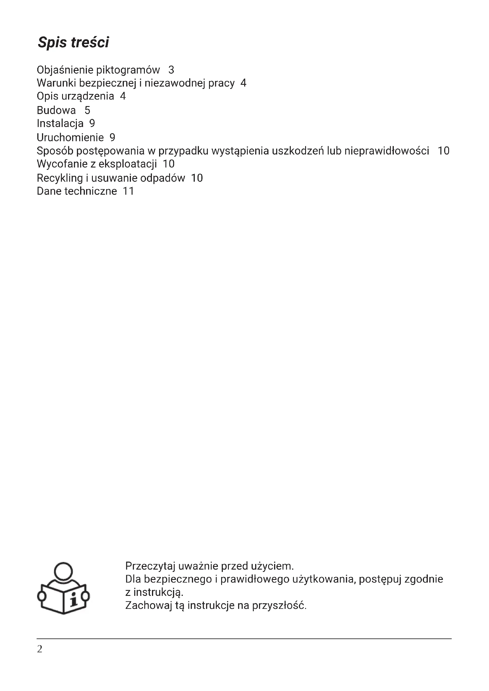 zapoznanie się z treścią niniejszej instrukcji obsługi umożliwia prawidłową instalację i eksploatację urzą dze nia, za pew nia jąc jego długotrwałą i niezawodną pracę,
