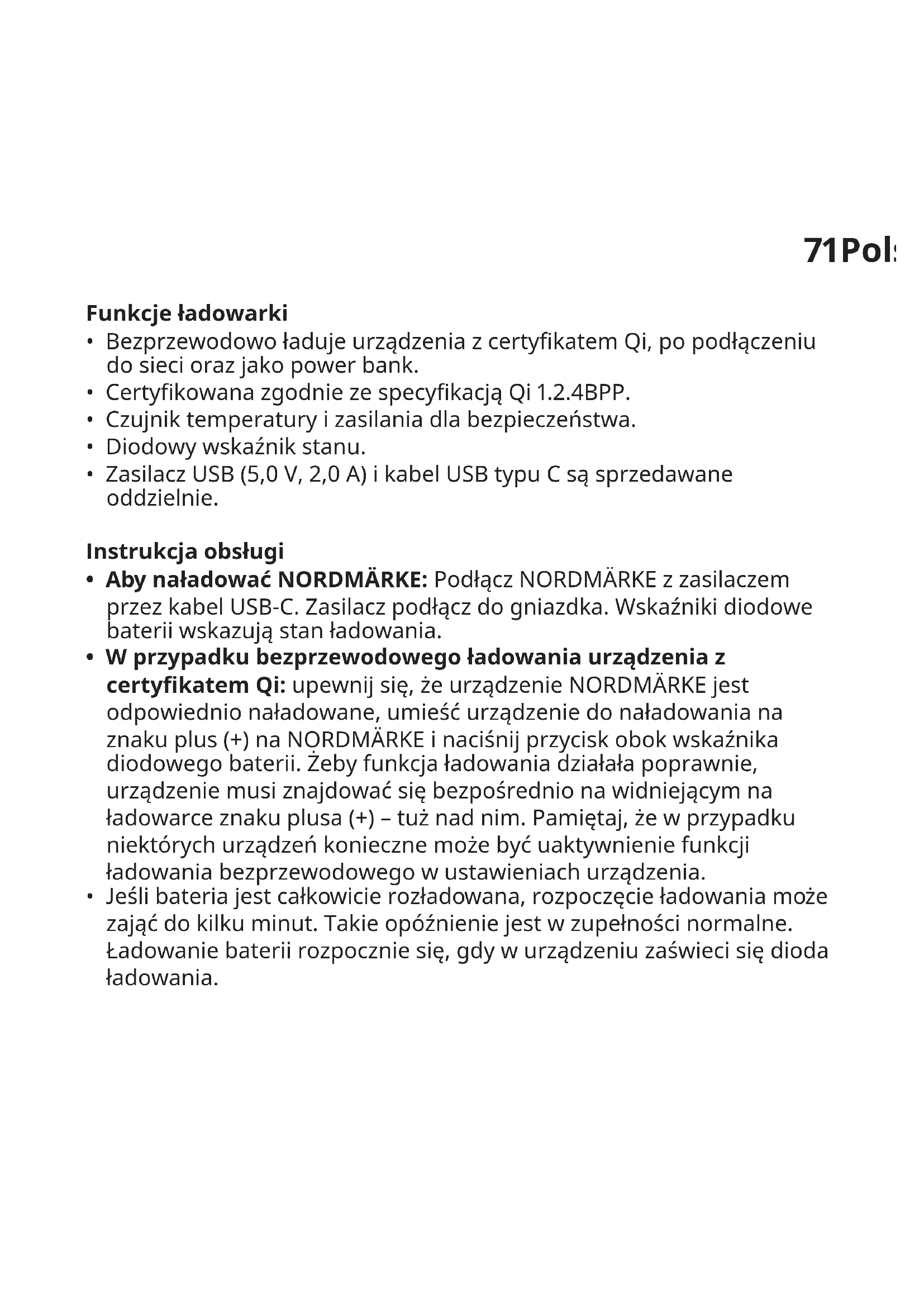 - Bezprzewodowo ładuje urządzenia z certykatem Qi, po podłączeniu do sieci oraz jako power bank.