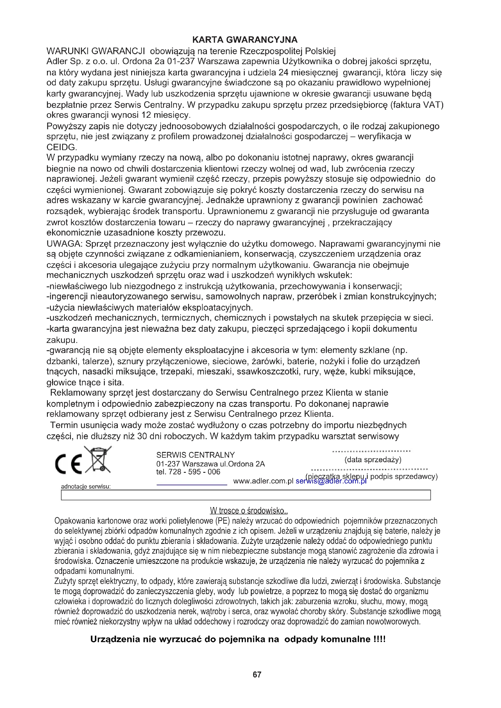 KARTA GWARANCYJNA Termin usunięcia wady może zostać wydłużony o czas potrzebny do importu niezbędnych części, nie dłuższy niż 30 dni roboczych. W każdym takim przypadku warsztat serwisowy Reklamowany sprzęt jest dostarczany do Serwisu Centralnego przez Klienta w stanie kompletnym i odpowiednio zabezpieczony na czas transportu. Po dokonanej naprawie reklamowany sprzęt odbierany jest z Serwisu Centralnego przez Klienta. -gwarancją nie są objęte elementy eksploatacyjne i akcesoria w tym: elementy szklane (np. dzbanki, talerze), sznury przyłączeniowe, sieciowe, żarówki, baterie, nożyki i folie do urządzeń tnących, nasadki miksujące, trzepaki, mieszaki, ssawkoszczotki, rury, węże, kubki miksujące, głowice tnące i sita. -karta gwarancyjna jest nieważna bez daty zakupu, pieczęci sprzedającego i kopii dokumentu zakupu. -uszkodzeń mechanicznych, termicznych, chemicznych i powstałych na skutek przepięcia w sieci. -użycia niewłaściwych materiałów eksploatacyjnych. -ingerencji nieautoryzowanego serwisu, samowolnych napraw, przeróbek i zmian konstrukcyjnych; -niewłaściwego lub niezgodnego z instrukcją użytkowania, przechowywania i konserwacji; UWAGA: Sprzęt przeznaczony jest wyłącznie do użytku domowego. Naprawami gwarancyjnymi nie są objęte czynności związane z odkamienianiem, konserwacją, czyszczeniem urządzenia oraz części i akcesoria ulegające zużyciu przy normalnym użytkowaniu. Gwarancja nie obejmuje mechanicznych uszkodzeń sprzętu oraz wad i uszkodzeń wynikłych wskutek: W przypadku wymiany rzeczy na nową, albo po dokonaniu istotnej naprawy, okres gwarancji biegnie na nowo od chwili dostarczenia klientowi rzeczy wolnej od wad, lub zwrócenia rzeczy naprawionej. Jeżeli gwarant wymienił część rzeczy, przepis powyższy stosuje się odpowiednio do części wymienionej. Gwarant zobowiązuje się pokryć koszty dostarczenia rzeczy do serwisu na adres wskazany w karcie gwarancyjnej. Jednakże uprawniony z gwarancji powinien zachować rozsądek, wybierając środek transportu. Uprawnionemu z gwarancji nie przysługuje od gwaranta zwrot kosztów dostarczenia towaru – rzeczy do naprawy gwarancyjnej , przekraczający ekonomicznie uzasadnione koszty przewozu. Powyższy zapis nie dotyczy jednoosobowych działalności gospodarczych, o ile rodzaj zakupionego sprzętu, nie jest związany z profilem prowadzonej działalności gospodarczej – weryfikacja w CEIDG. WARUNKI GWARANCJI obowiązują na terenie Rzeczpospolitej Polskiej Adler Sp. z o.o. ul. Ordona 2a 01-237 Warszawa zapewnia Użytkownika o dobrej jakości sprzętu, na który wydana jest niniejsza karta gwarancyjna i udziela 24 miesięcznej gwarancji, która liczy się od daty zakupu sprzętu. Usługi gwarancyjne świadczone są po okazaniu prawidłowo wypełnionej karty gwarancyjnej. Wady lub uszkodzenia sprzętu ujawnione w okresie gwarancji usuwane będą bezpłatnie przez Serwis Centralny. W przypadku zakupu sprzętu przez przedsiębiorcę (faktura VAT) okres gwarancji wynosi 12 miesięcy. SERWIS CENTRALNY01-237 Warszawa ul.Ordona 2Atel. 728 - 595 - 006 www.adler.com.pl serwis@adler.com.pl(data sprzedaży)(pieczątka sklepu i podpis sprzedawcy)adnotacje serwisu: Urządzenia nie wyrzucać do pojemnika na odpady komunalne !!!! Zużyty sprzęt elektryczny, to odpady, które zawierają substancje szkodliwe dla ludzi, zwierząt i środowiska. Substancje te mogą doprowadzić do zanieczyszczenia gleby, wody lub powietrze, a poprzez to mogą się dostać do organizmu człowieka i doprowadzić do licznych dolegliwości zdrowotnych, takich jak: zaburzenia wzroku, słuchu, mowy, mogą również doprowadzić do uszkodzenia nerek, wątroby i serca, oraz wywołać choroby skóry. Substancje szkodliwe mogą mieć również niekorzystny wpływ na układ oddechowy i rozrodczy oraz doprowadzić do zamian nowotworowych. Opakowania kartonowe oraz worki polietylenowe (PE) należy wrzucać do odpowiednich pojemników przeznaczonych do selektywnej zbiórki odpadów komunalnych zgodnie z ich opisem. Jeżeli w urządzeniu znajdują się baterie, należy je wyjąć i osobno oddać do punktu zbierania i składowania. Zużyte urządzenie należy oddać do odpowiedniego punktu zbierania i składowania, gdyż znajdujące się w nim niebezpieczne substancje mogą stanowić zagrożenie dla zdrowia i środowiska. Oznaczenie umieszczone na produkcie wskazuje, że urządzenia nie należy wyrzucać do pojemnika z odpadami komunalnymi. W trosce o środowisko..68 POLSKI