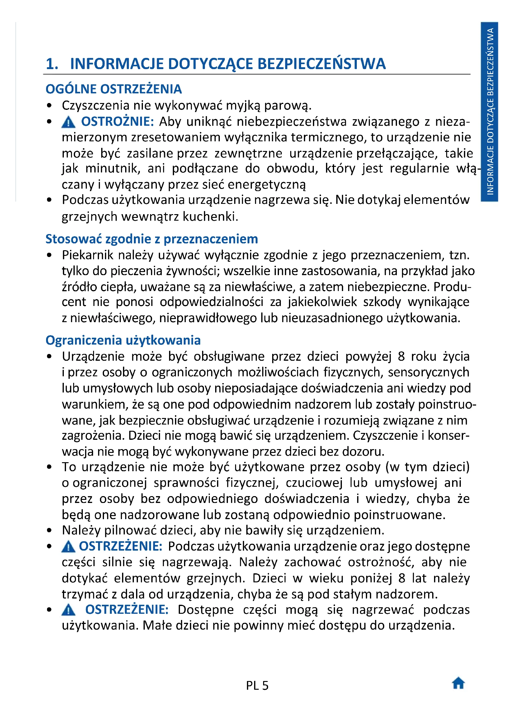 - OSTRZEŻENIE: Dostępne części mogą się nagrzewać podczas użytkowania. Małe dzieci nie powinny mieć dostępu do urządzenia.PL 6