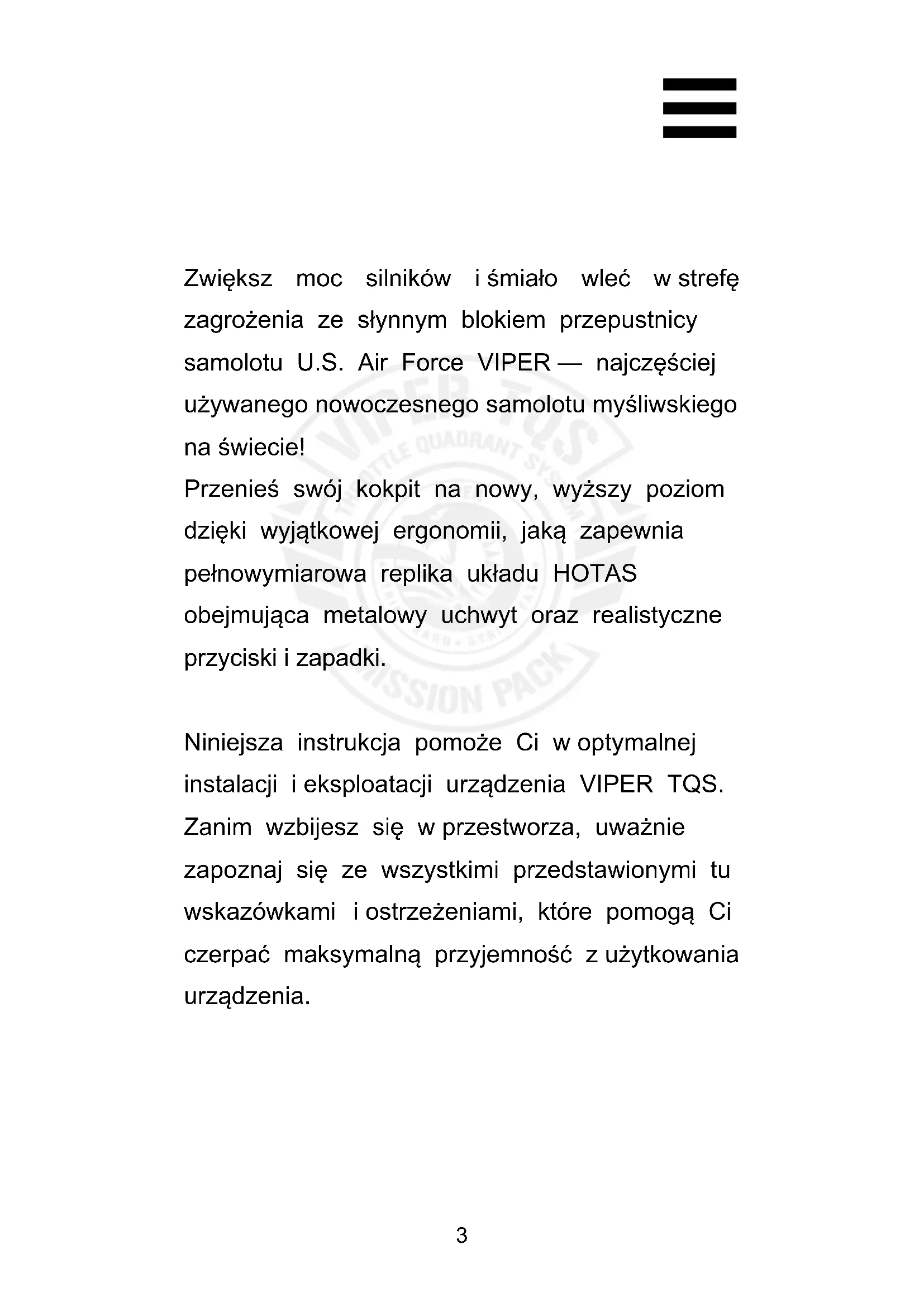 Zwiększ moc silników i śmiało wleć w strefę zagrożenia ze słynnym blokiem przepustnicy samolotu U.S. Air Force VIPER — najczęściej używanego nowoczesnego samolotu myśliwskiego na świecie! Przenieś swój kokpit na nowy, wyższy poziom dzięki wyjątkowej ergonomii, jaką zapewnia pełnowymiarowa replika układu HOTAS obejmująca metalowy uchwyt oraz realistyczne przyciski i zapadki. Niniejsza instrukcja pomoże Ci w optymalnej instalacji i eksploatacji urządzenia VIPER TQS. Zanim wzbijesz się w przestworza, uważnie zapoznaj się ze wszystkimi przedstawionymi tu wskazówkami i ostrzeżeniami, które pomogą Ci czerpać maksymalną przyjemność z użytkowania urządzenia.4