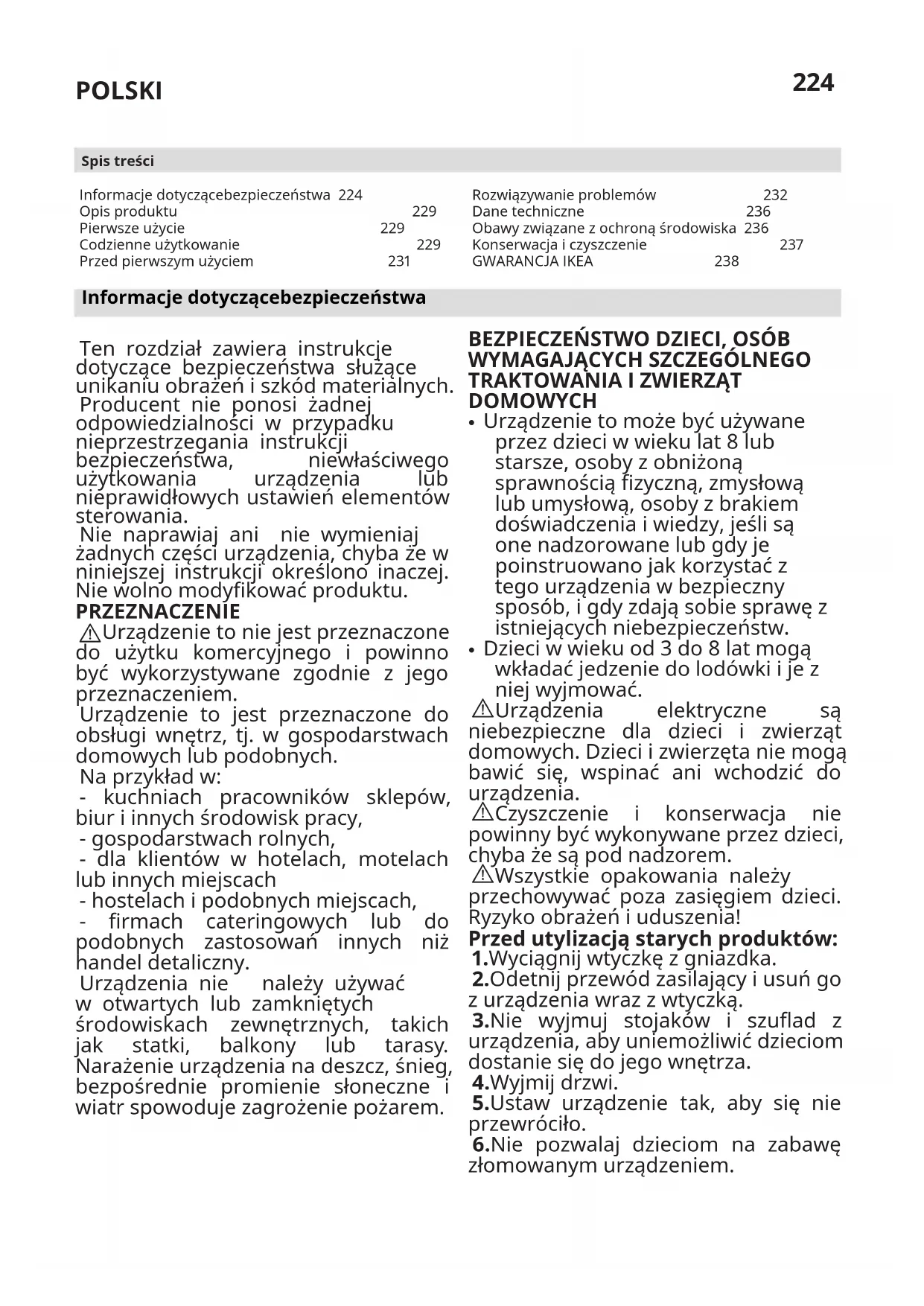 Informacje dotyczącebezpieczeństwa 224 Opis produktu 229 Pierwsze użycie 229 Codzienne użytkowanie 229 Przed pierwszym użyciem 231 Spis treści Rozwiązywanie problemów 232 Dane techniczne 236 Obawy związane z ochroną środowiska 236 Konserwacja i czyszczenie 237 GWARANCJA IKEA 238 Informacje dotyczącebezpieczeństwa Ten rozdział zawiera instrukcje dotyczące bezpieczeństwa służące unikaniu obrażeń i szkód materialnych. Producent nie ponosi żadnej odpowiedzialności w przypadku nieprzestrzegania instrukcji bezpieczeństwa, niewłaściwego użytkowania urządzenia lub nieprawidłowych ustawień elementów sterowania. Nie naprawiaj ani nie wymieniaj żadnych części urządzenia, chyba że w niniejszej instrukcji określono inaczej. Nie wolno modyfikować produktu. PRZEZNACZENIE