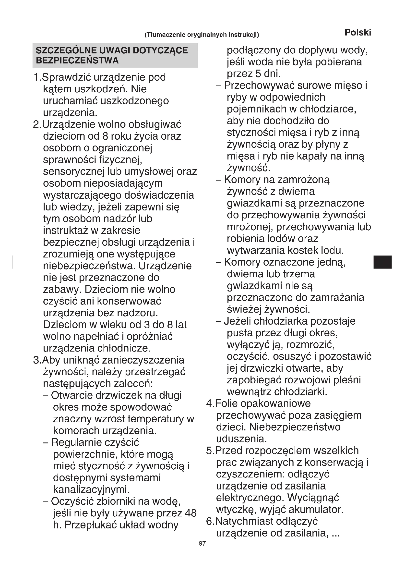 Urzadzenia woI no obslugiwać dzieciom od 8 roku zycia oraz osobom o ograniczonej sprawnosci fizycznej, sensorycznej lub umysłowewej oraz osobom nieposiadajacym wystarczajacego doświadczenia lub wiedzy, sąželi zapewni są tym osobom nadźór lub instruktaż w zakresie bezpiecznej obstogi urzadzenia i zrozumieje one wystepujucieNiebezpieczenstwa. Urzadzenia nie jest przyznaczone do zagawy. Dzieciom nie wolno czyszcie ani konserwowań urzadzenia bez nadzoru. Dzieciom w wieku od 3 do 8 lat wolno napelniać i oprózniać urzadzenia chłodnicze.