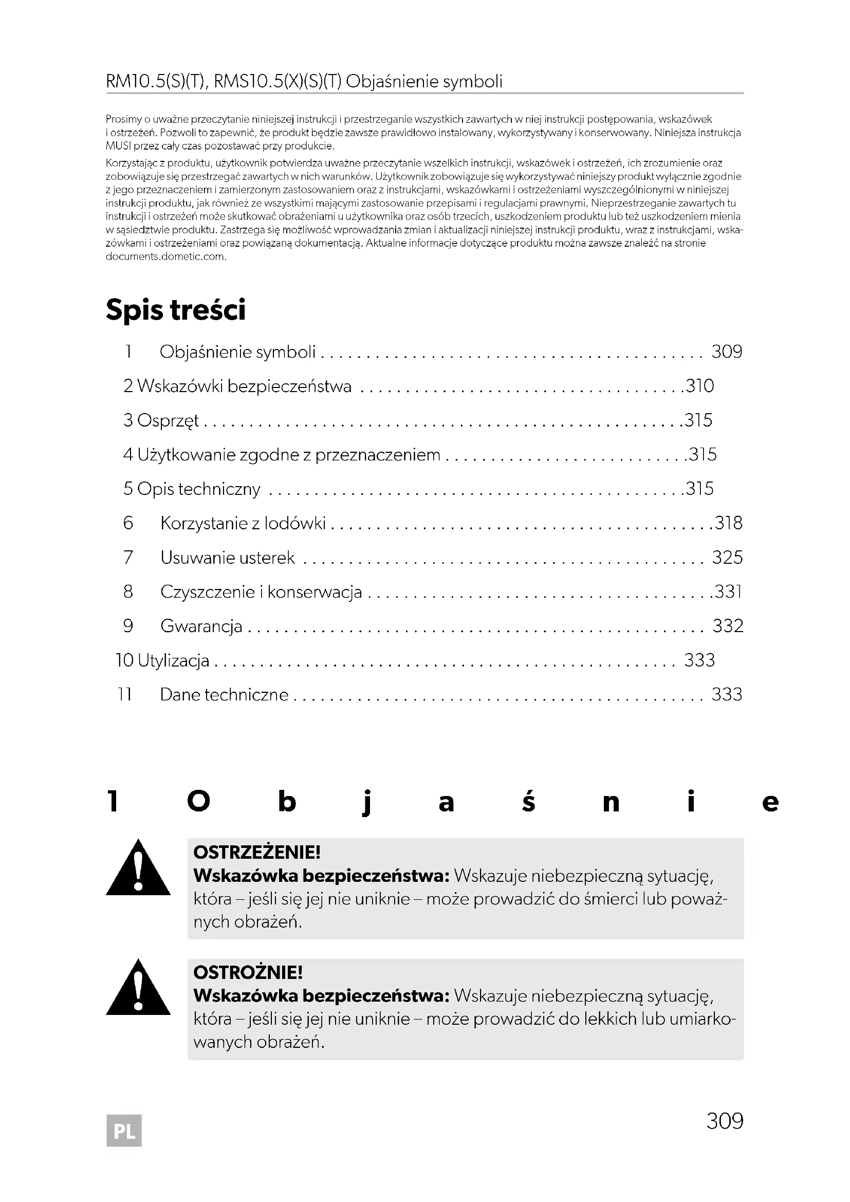 - Prosimy o uważne przeczytanie niniejszej instrukcji i przestrzeganie wszystkich zawartych w niej instrukcji postępowania, wskazówek i ostrzeżeń. Pozwoli to zapewnić, że produkt będzie zawsze prawidłowo instalowany, wykorzystywany i konserwowany. Niniejsza instrukcja MUSI przez cały czas pozostawać przy produkcie. Korzystając z produktu, użytkownik potwierdza uważne przeczytanie wszelkich instrukcji, wskazówek i ostrzeżeń, ich zrozumienie oraz zobowiązuje się przestrzegać zawartych w nich warunków. Użytkownik zobowiązuje się wykorzystywać niniejszy produkt wyłącznie zgodnie z jego przeznaczeniem i zamierzonym zastosowaniem oraz z instrukcjami, wskazówkami i ostrzeżeniami wyszczególnionymi w niniejszej instrukcji produktu, jak również ze wszystkimi mającymi zastosowanie przepisami i regulacjami prawnymi. Nieprzestrzeganie zawartych tu instrukcji i ostrzeżeń może skutkować obrażeniami u użytkownika oraz osób trzecich, uszkodzeniem produktu lub też uszkodzeniem mienia w sąsiedztwie produktu. Zastrzega się możliwość wprowadzania zmian i aktualizacji niniejszej instrukcji produktu, wraz z instrukcjami, wska- zówkami i ostrzeżeniami oraz powiązaną dokumentacją. Aktualne informacje dotyczące produktu można zawsze znaleźć na stronie documents.dometic.com. Spis treści 1 Objaśnienie symboli p. 309