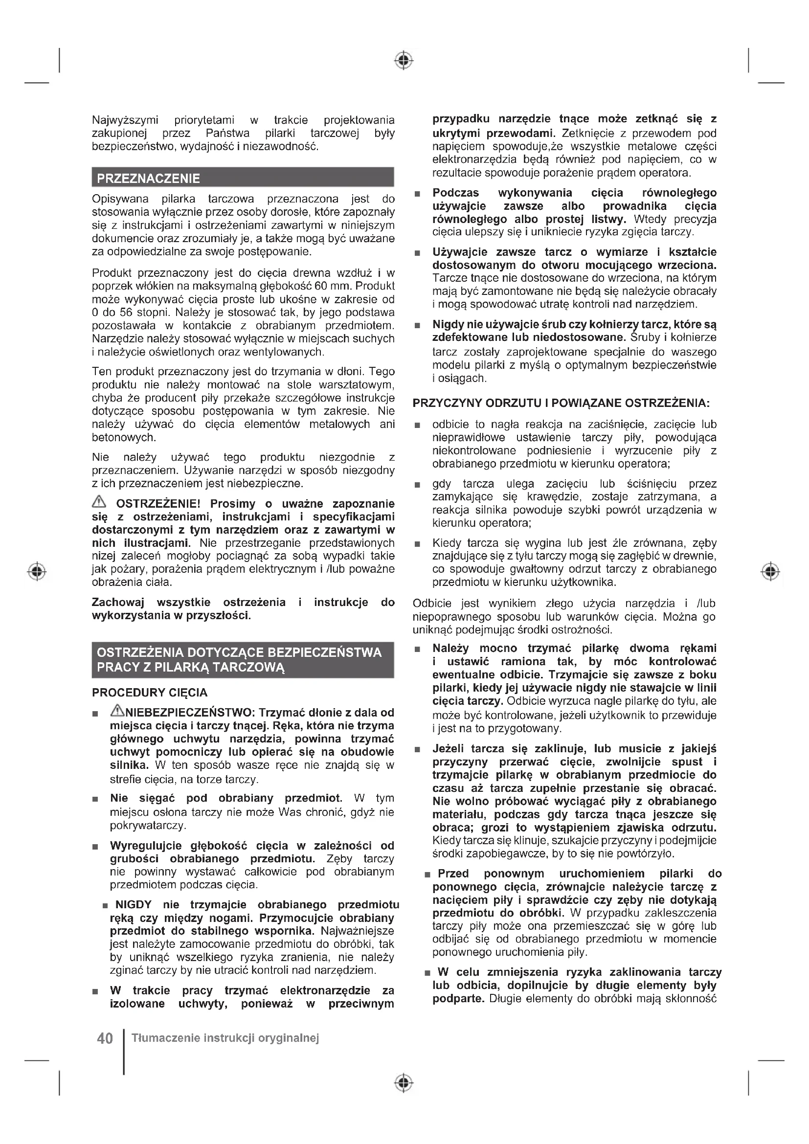 Tłumaczenie instrukcji oryginalnejdo uginania się pod własnym ciężarem. Możecie ustawić wsporniki po obu stronach przedmiotu do obróbki, blisko linii cięcia i na końcu przedmiotu. ■ Nie używajcie uszkodzonych lub stępionych tarcz. Tarcze nienaostrzone lub źle zamontowane będądawały cięcie powodujące nadmierne tarcie tarczy i zwiększenie ryzyka wygięcia czy odbicia. ■ Przed rozpoczęciem cięcia, sprawdźcie czy przyciski regulacji głębokości cięcia i nachylenia są należycie zablokowane. Jeżeli ustawienia pozycji tarczy zmienią się podczas cięcia, tarcza może się zaklinować i może nastąpić odbicie. ■ Należy zachować szczególną ostrożność w przypadku cięcia istniejących ścian lub innych konstrukcji nieprzelotowych. Tarcza mogłaby uderzyć o ukryte przedmioty, co doprowadziłoby do odbicia.