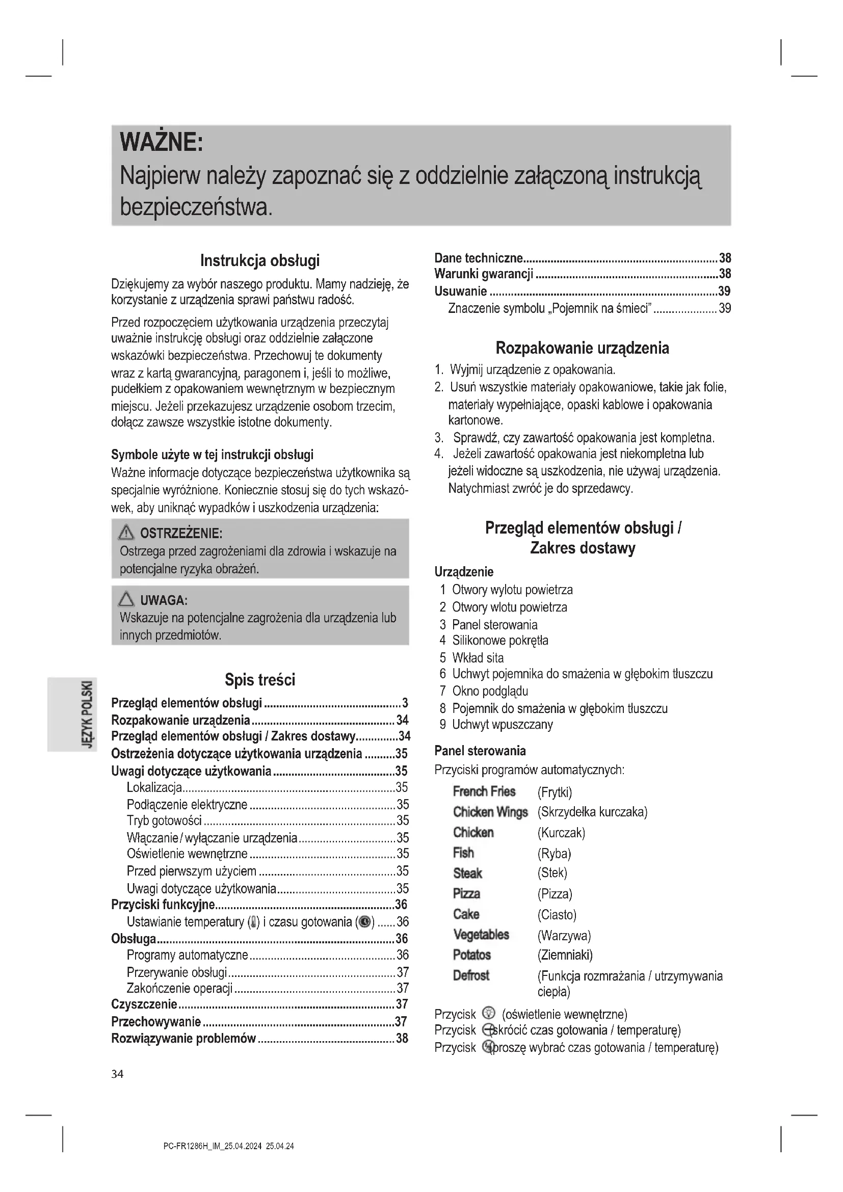 Rozwiązywanie problemów Problem Możliwa przyczyna Środek zaradczy Urządzenie nie działa. Urządzenie nie jest zasilane. Sprawdzić gniazdo sieciowe za pomocą innego urządzenia. Włożyć prawidłowo wtyczkę sieciową. Sprawdzić bezpiecznik domowy. Pojemnik do frytowania nie jest prawidłowo włożony. Wyłącznik bezpieczeństwa unie- możliwia obsługę nieprawidłowo włożonego pojemnika do smażenia. Włóż prawidłowo pojemnik do smażenia. Musi on słyszalnie zatrzasnąć się na swoim miejscu. Urządzenie jest uszkodzone. Skontaktuj się z naszym serwisem lub specjalistą. Potrawa nie jest w pełni ugotowana. Pojemnik do smażenia jest przepełniony. Zmniejsz ilość jedzenia. Mniejsze ilości gotują się bardziej równomiernie. Ustawiono zbyt niską temperaturę. Ustaw wyższą temperaturę. Ustawiono zbyt krótki czas gotowania. Ustaw dłuższy czas smażenia. Potrawa jest nierów- nomiernie ugotowana. Jedzenie jest ułożone jedno na drugim. Nie zapewnia to wystarczającej cyrkulacji powietrza. Wstrząsnąć potrawą w połowie czasu gotowania. Potrawa nie jest chrupiąca. Użyto żywności, która nadaje się tylko do konwencjonalnej frytownicy. Używaj potraw odpowiednich do piekarnika lub posmaruj je niewielką ilością oleju. Z urządzenia wydo- bywa się dym. Przygotowujesz bardzo tłuste potrawy. Rozpryski tłuszczu wewnątrz urządzenia mogą powodować powstawanie dymu. Upewnij się, że wentylacja jest wystarczająca. Pojemnik do smażenia jest przepełniony. Żywność dotyka elementu grzejnego. Zmniejsz ilość jedzenia. W pojemniku do smażenia lub na elemencie grzejnym nadal znajdują się resztki jedzenia / tłuszczu z poprzedniego użytkowania. Urządzenie należy czyścić po każdym użyciu zgodnie z opisem w rozdziale „Czyszczenie”. Dane techniczne Model:..............................................................PC-FR 1286 H Zasilanie: ............................................220 – 240 V~, 50 – 60 Hz Pobór mocy: ................................................................1700 W Klasa ochronności: ................................................................. Waga netto: ..............................................................ok. 4,9 kg Ten produkt zawiera źródło światła o klasie efektywności energetycznej < G >. Źródło światła jest odporne na wysokie temperatury i jest przeznaczone wyłącznie do użytku w tym urządzeniu. Zastrzegamy sobie prawo wprowadzania zmian technicz- nych i projektowych w trakcie ciągłego rozwoju produktu. To urządzenie zostało przetestowane zgodnie z wszystkimi obowiązującymi, aktualnymi dyrektywami CE i zbudowane zgodnie z najnowszymi przepisami bezpieczeństwa. Warunki gwarancji Przyznajemy 24 miesiące gwarancji na produkt licząc od daty zakupu. W tym okresie będziemy bezpłatnie usuwać w terminie 14 dni od daty dostarczenia wadliwego sprzętu z kartą gwarancyjną do miejsca zakupu wszystkie uszkodzenia powstałe w tym urządzeniu na skutek wady materiałów lub wadliwego wykonania, naprawiając oraz wymieniając wadliwe części lub (jeśli uznamy za stosowne) wymieniając całe urządzenie na nowe. Sprzęt do naprawy powinien być dostarczony w komplecie wraz z dowodem zakupu oraz z ważną kartą gwarancyjną do sprzedawcy w miarę możliwości w oryginalnym opako- waniu lub innym odpowiednim dla zabezpieczenia przed uszkodzeniem. W razie braku kompletnego opakowania fa- brycznego, ryzyko uszkodzenia sprzętu podczas transportu do i z miejsca zakupu ponosi reklamujący.PC-FR1286H_IM_25.04.2024 25.04.24