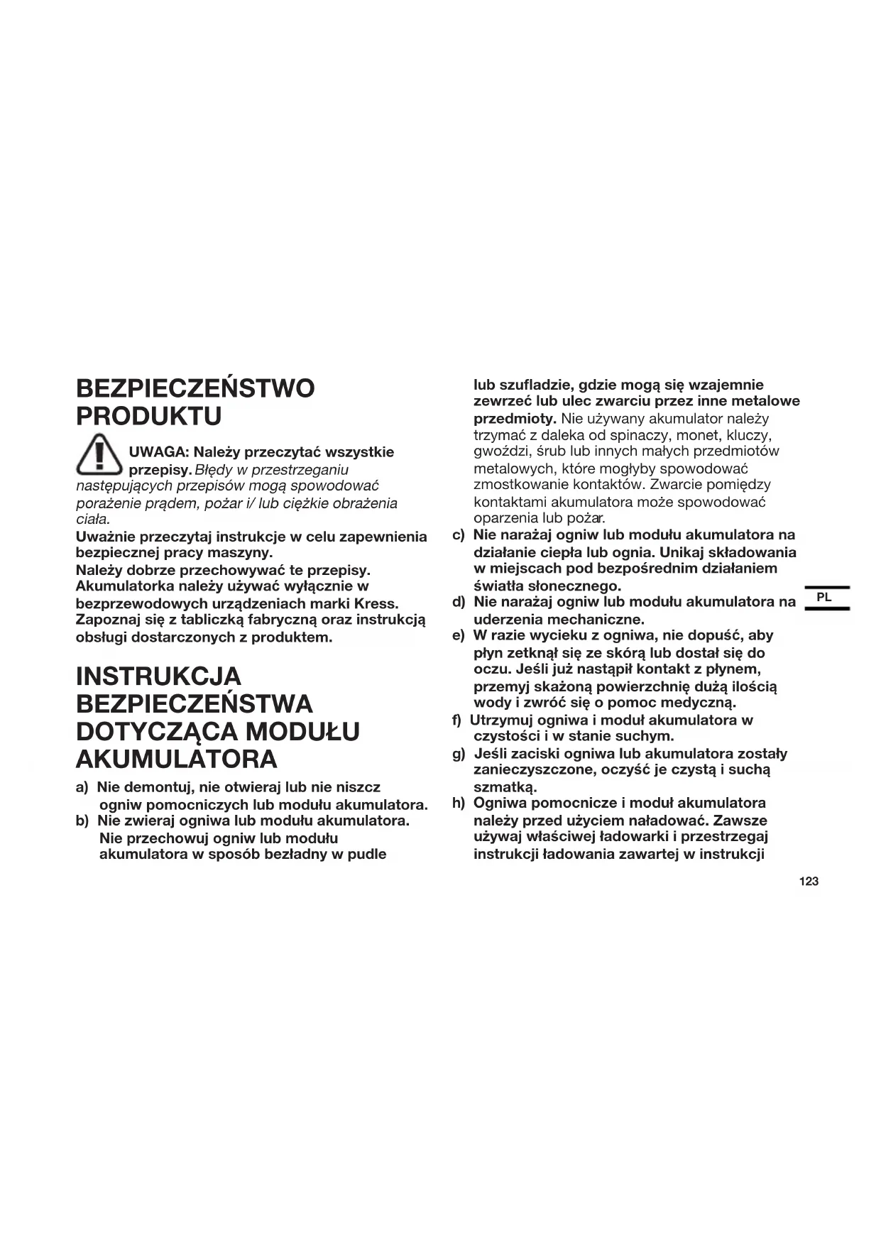 BEZPIECZEŃSTWO PRODUKTU UWAGA: Należy przeczytać wszystkie przepisy. Błędy w przestrzeganiu następujących przepisów mogą spowodować porażenie prądem, pożar i/ lub ciężkie obrażenia ciała. Uważnie przeczytaj instrukcje w celu zapewnienia bezpiecznej pracy maszyny. Należy dobrze przechowywać te przepisy. Akumulatorka należy używać wyłącznie w bezprzewodowych urządzeniach marki Kress. Zapoznaj się z tabliczką fabryczną oraz instrukcją obsługi dostarczonych z produktem. INSTRUKCJA BEZPIECZEŃSTWA