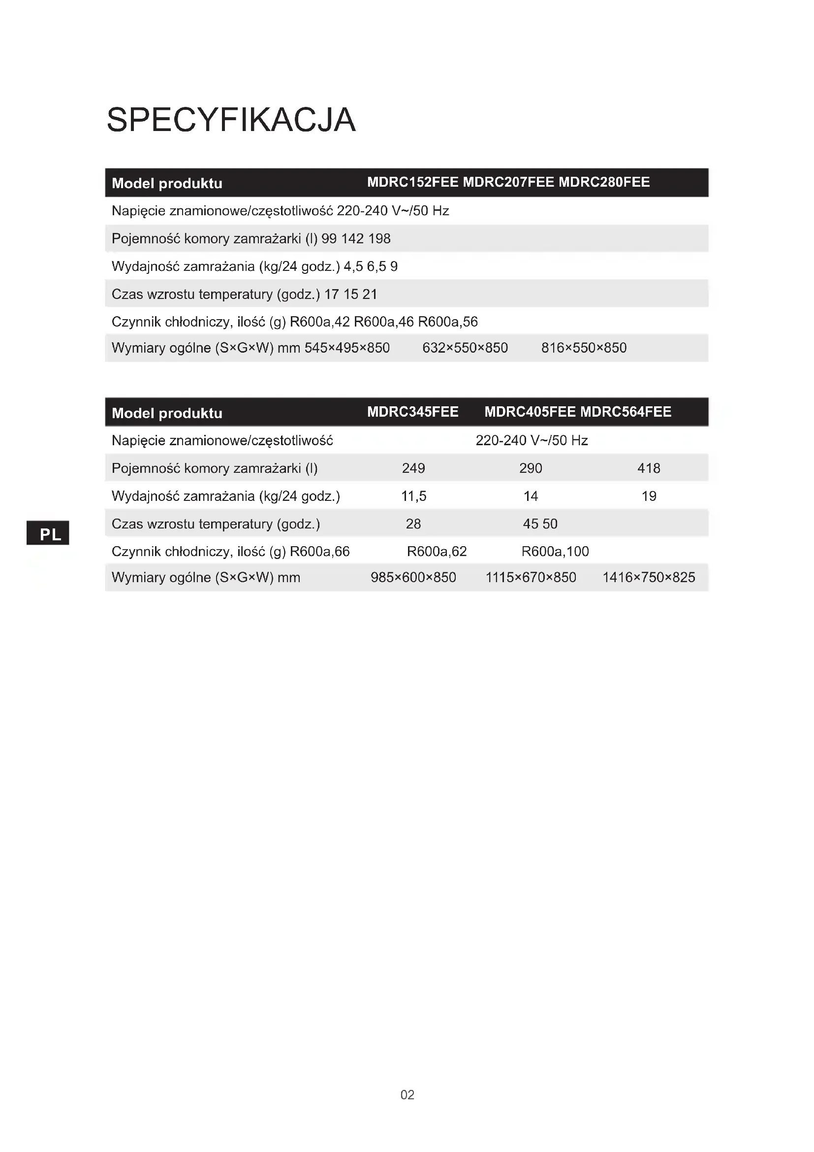 Napięcie znamionowe/częstotliwość 220-240 V~/50 Hz Pojemność komory zamrażarki (l) 249 290 418 Wydajność zamrażania (kg/24 godz.) 11,5 14 19 Czas wzrostu temperatury (godz.) 28 45 50 Czynnik chłodniczy, ilość (g) R600a,66 R600a,62 R600a,100 Wymiary ogólne (S×G×W) mm 985×600×850 1115×670×850 1416×750×82503