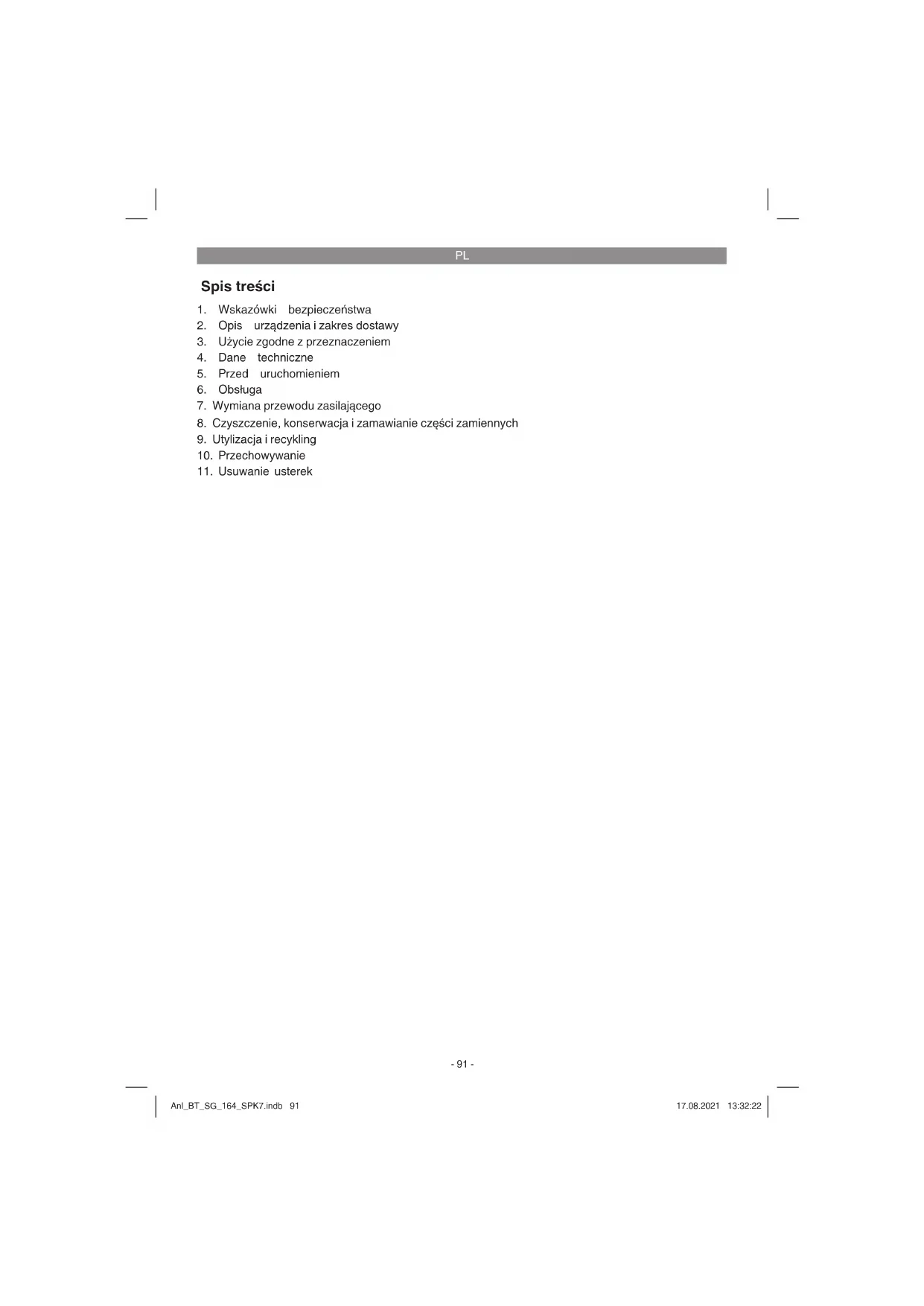 Urządzenie i wyposażenie dodatkowe przechowywać w miejscu ciemnym, suchym i wolnym od przemarzania, zabezpieczyć przed dziećmi. Optymalna temperatura przechowywani 5 do 30˚C. Przechowywać urządzenie w oryginal- nym opakowaniu. Anl_BT_SG_164_SPK7.indb 104Anl_BT_SG_164_SPK7.indb 104 17.08.2021 13:32:2317.08.2021 13:32:23PL
