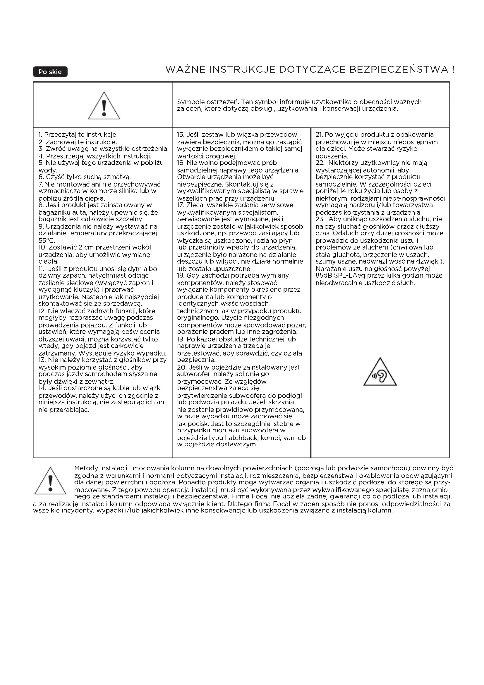 MBZ v2 Handleiding Aanpassingsperiode De-speakers bestaan uit complexe mechanische onderdelen die een aanpassingsperiode vereisen om optimaal te werken. Deze aanpassingsperiode verschilt naargelang de omstandigheden en kan verschillende weken duren. Om deze periode te versnellen, wordt aanbevolen de speakers minstens twintig opeenvolgende uren te laten werken op een gemiddeld geluidsniveau. Zodra de eigenschappen van uw speakers volledig stabiel zijn, kunt u volledig gebruikmaken van het volledige vermogen van de producten. Garantievoorwaarden Alle Focal-luidsprekers zijn gedekt door een garantie die is bepaald door de officiële Focal-distributeur in uw land. Uw distributeur kan alle details over de garantievoorwaarden verstrekken. De garantie dekt ten minste de juridisch bepaalde garanties die van kracht zijn in het land waar de oorspronkelijke aankoopfactuur is afgegeven.Polskie Metody instalacji i mocowania kolumn na dowolnych powierzchniach (podłoga lub podwozie samochodu) powinny być zgodne z warunkami i normami dotyczącymi instalacji, rozmieszczenia, bezpieczeństwa i okablowania obowiązującymi dla danej powierzchni i podłoża. Ponadto produkty mogą wytwarzać drgania i uszkodzić podłoże, do którego są przy- mocowane. Z tego powodu operacja instalacji musi być wykonywana przez wykwalifikowanego specjalistę, zaznajomio- nego ze standardami instalacji i bezpieczeństwa. Firma Focal nie udziela żadnej gwarancji co do podłoża lub instalacji, a za realizację instalacji kolumn odpowiada wyłącznie klient. Dlatego firma Focal w żaden sposób nie ponosi odpowiedzialności za wszelkie incydenty, wypadki i/lub jakichkolwiek inne konsekwencje lub uszkodzenia związane z instalacją kolumn. Symbole ostrzeżeń. Ten symbol informuje użytkownika o obecności ważnych zaleceń, które dotyczą obsługi, użytkowania i konserwacji urządzenia.