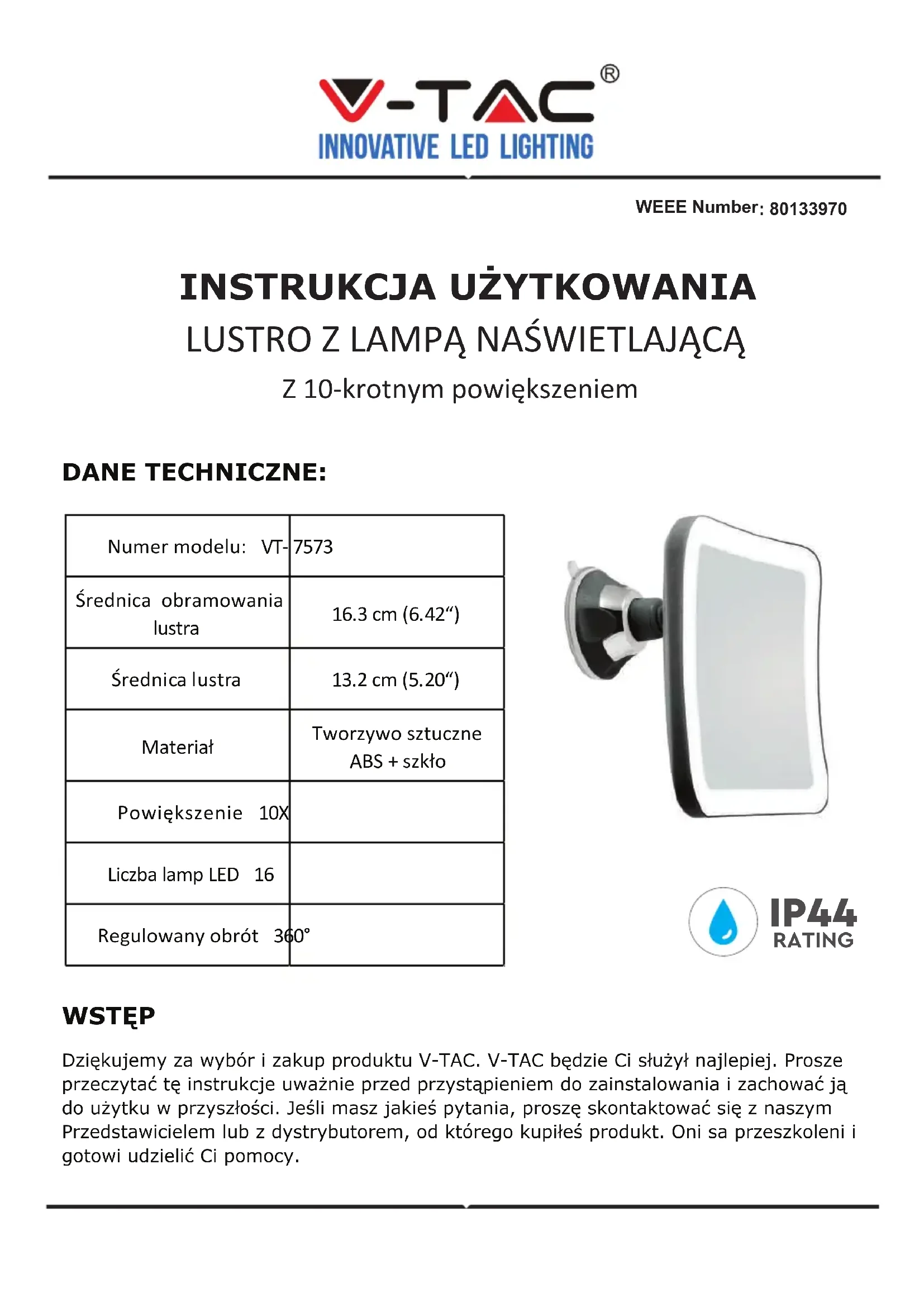 Z 10-krotnym powiększeniem DANE TECHNICZNE: WSTĘP Dziękujemy za wybór i zakup produktu V-TAC. V-TAC będzie Ci służył najlepiej. Prosze przeczytać tę instrukcje uważnie przed przystąpieniem do zainstalowania i zachować ją do użytku w przyszłości. Jeśli masz jakieś pytania, proszę skontaktować się z naszym Przedstawicielem lub z dystrybutorem, od którego kupiłeś produkt. Oni sa przeszkoleni i gotowi udzielić Ci pomocy. Agradecemos que escolheu e adquiriu o produto da V-TAC. A V-TAC irá servir-lhe da melhor maneira possível. Por favor, leia atentamente estas instruções antes da insta- lação e mantenha este manual para referência no futuro. Se tiver outras dúvidas, entre em contacto com o nosso revendedor ou comerciante local de quem adquiriu o produto. Eles são formados e estão prontos para lhe serem úteis da melhor maneira possível. Numer modelu: VT- 7573Średnica obramowania lustra