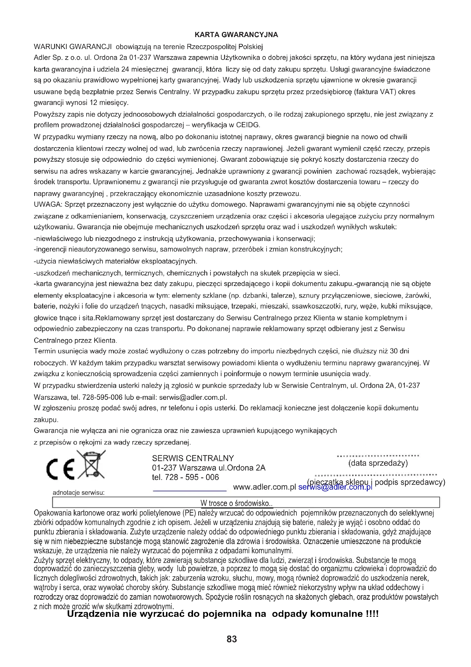 KARTA GWARANCYJNAWARUNKI GWARANCJI obowiązują na terenie Rzeczpospolitej Polskiej Adler Sp. z o.o. ul. Ordona 2a 01-237 Warszawa zapewnia Użytkownika o dobrej jakości sprzętu, na który wydana jest niniejsza karta gwarancyjna i udziela 24 miesięcznej gwarancji, która liczy się od daty zakupu sprzętu. Usługi gwarancyjne świadczone są po okazaniu prawidłowo wypełnionej karty gwarancyjnej. Wady lub uszkodzenia sprzętu ujawnione w okresie gwarancji usuwane będą bezpłatnie przez Serwis Centralny. W przypadku zakupu sprzętu przez przedsiębiorcę (faktura VAT) okres gwarancji wynosi 12 miesięcy. Powyższy zapis nie dotyczy jednoosobowych działalności gospodarczych, o ile rodzaj zakupionego sprzętu, nie jest związany z profilem prowadzonej działalności gospodarczej – weryfikacja w CEIDG.W przypadku wymiany rzeczy na nową, albo po dokonaniu istotnej naprawy, okres gwarancji biegnie na nowo od chwili dostarczenia klientowi rzeczy wolnej od wad, lub zwrócenia rzeczy naprawionej. Jeżeli gwarant wymienił część rzeczy, przepis powyższy stosuje się odpowiednio do części wymienionej. Gwarant zobowiązuje się pokryć koszty dostarczenia rzeczy do serwisu na adres wskazany w karcie gwarancyjnej. Jednakże uprawniony z gwarancji powinien zachować rozsądek, wybierając środek transportu. Uprawnionemu z gwarancji nie przysługuje od gwaranta zwrot kosztów dostarczenia towaru – rzeczy do naprawy gwarancyjnej , przekraczający ekonomicznie uzasadnione koszty przewozu. UWAGA: Sprzęt przeznaczony jest wyłącznie do użytku domowego. Naprawami gwarancyjnymi nie są objęte czynności związane z odkamienianiem, konserwacją, czyszczeniem urządzenia oraz części i akcesoria ulegające zużyciu przy normalnym użytkowaniu. Gwarancja nie obejmuje mechanicznych uszkodzeń sprzętu oraz wad i uszkodzeń wynikłych wskutek:-niewłaściwego lub niezgodnego z instrukcją użytkowania, przechowywania i konserwacji;-ingerencji nieautoryzowanego serwisu, samowolnych napraw, przeróbek i zmian konstrukcyjnych;-użycia niewłaściwych materiałów eksploatacyjnych. -uszkodzeń mechanicznych, termicznych, chemicznych i powstałych na skutek przepięcia w sieci. -karta gwarancyjna jest nieważna bez daty zakupu, pieczęci sprzedającego i kopii dokumentu zakupu.-gwarancją nie są objęte elementy eksploatacyjne i akcesoria w tym: elementy szklane (np. dzbanki, talerze), sznury przyłączeniowe, sieciowe, żarówki, baterie, nożyki i folie do urządzeń tnących, nasadki miksujące, trzepaki, mieszaki, ssawkoszczotki, rury, węże, kubki miksujące, głowice tnące i sita.Reklamowany sprzęt jest dostarczany do Serwisu Centralnego przez Klienta w stanie kompletnym i odpowiednio zabezpieczony na czas transportu. Po dokonanej naprawie reklamowany sprzęt odbierany jest z Serwisu Centralnego przez Klienta.Termin usunięcia wady może zostać wydłużony o czas potrzebny do importu niezbędnych części, nie dłuższy niż 30 dni roboczych. W każdym takim przypadku warsztat serwisowy powiadomi klienta o wydłużeniu terminu naprawy gwarancyjnej. W związku z koniecznością sprowadzenia części zamiennych i poinformuje o nowym terminie usunięcia wady.W przypadku stwierdzenia usterki należy ją zgłosić w punkcie sprzedaży lub w Serwisie Centralnym, ul. Ordona 2A, 01-237 Warszawa, tel. 728-595-006 lub e-mail: serwis@adler.com.pl. W zgłoszeniu proszę podać swój adres, nr telefonu i opis usterki. Do reklamacji konieczne jest dołączenie kopii dokumentu zakupu.Gwarancja nie wyłącza ani nie ogranicza oraz nie zawiesza uprawnień kupującego wynikających z przepisów o rękojmi za wady rzeczy sprzedanej. SERWIS CENTRALNY 01-237 Warszawa ul.Ordona 2A tel. 728 - 595 - 006 www.adler.com.pl serwis@adler.com.pl (data sprzedaży) (pieczątka sklepu i podpis sprzedawcy) adnotacje serwisu: Urządzenia nie wyrzucać do pojemnika na odpady komunalne !!!! W trosce o środowisko.. Opakowania kartonowe oraz worki polietylenowe (PE) należy wrzucać do odpowiednich pojemników przeznaczonych do selektywnej zbiórki odpadów komunalnych zgodnie z ich opisem. Jeżeli w urządzeniu znajdują się baterie, należy je wyjąć i osobno oddać do punktu zbierania i składowania. Zużyte urządzenie należy oddać do odpowiedniego punktu zbierania i składowania, gdyż znajdujące się w nim niebezpieczne substancje mogą stanowić zagrożenie dla zdrowia i środowiska. Oznaczenie umieszczone na produkcie wskazuje, że urządzenia nie należy wyrzucać do pojemnika z odpadami komunalnymi. Zużyty sprzęt elektryczny, to odpady, które zawierają substancje szkodliwe dla ludzi, zwierząt i środowiska. Substancje te mogą doprowadzić do zanieczyszczenia gleby, wody lub powietrze, a poprzez to mogą się dostać do organizmu człowieka i doprowadzić do licznych dolegliwości zdrowotnych, takich jak: zaburzenia wzroku, słuchu, mowy, mogą również doprowadzić do uszkodzenia nerek, wątroby i serca, oraz wywołać choroby skóry. Substancje szkodliwe mogą mieć również niekorzystny wpływ na układ oddechowy i rozrodczy oraz doprowadzić do zamian nowotworowych. Spożycie roślin rosnących na skażonych glebach, oraz produktów powstałych z nich może grozić w/w skutkami zdrowotnymi.84 POLSKI WARUNKI BEZPIECZEŃSTWA WAŻNE WSKAZÓWKI DOTYCZĄCE BEZPIECZEŃSTWA UŻYTKOWANIA PROSZĘ UWAŻNIE PRZECZYTAĆ I