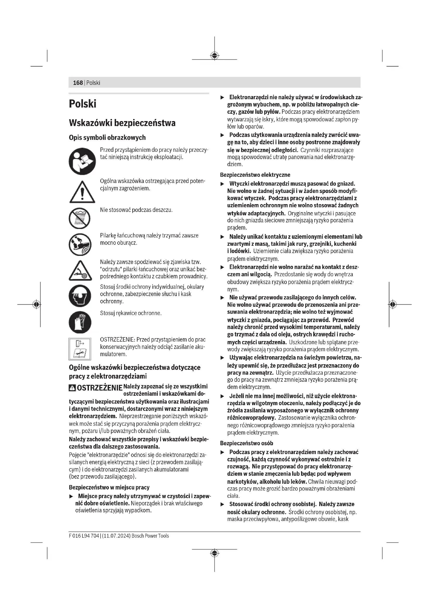 Karasoku Mahallesi 28028. Sokak No:20/A Merkez / ADANA Tel.: +903223599710 -3521379 Fax: +903223591323 E-mail: isiklar@isiklarelektrik.com Diğer servisleri şu adreste bulabilirsiniz: www.bosch-pt.com/serviceaddresses Taşıma Alet içindeki lityum iyon (Li-Ion) aküler tehlikeli madde taşıma yönetmeliği hükümlerine tabidir. Akuler başka bir yukumluluk olmaksızın kullanıcı tarafından caddeler uzerinde taşınabilir. Üçüncü kişiler aracılığıyla yollamada (örneğin hava yolu veya nakliye şirketi ile yollamada) ambalaj ve etiketlemeye ait özel hükümlere uyulmalıdır. Bu konuda gönderi hazırlanırken bir tehlikeli madde uzmanından yardım alınmalıdır. Aküleri sadece gövdeleri hasarsız durumda gönderin. Açık kontakların üzerini kapatınız ve aküyü ambalaj içinde hareket etmeyecek biçimde paketleyiniz. Lutfen olası ek ulusal yönetmelik hukumlerine de uyun. Tasfiye Ürünler, aküler, aksesuar ve ambalaj malzemesi çevre dostu yeniden kazanım merkezine gönderilmek zorundadır. ürünleri ve aküleri/bataryaları evsel çöplerin içine atmayın! Sadece AB üyesi ülkeler için: 2012/19/EU yönetmeliği uyarınca kullanım ömrünü tamamlamış ürünler ve 2006/66/EC yönetmeliği uyarınca arızalı veya kullanım ömrünü tamamlamış aküler/ bataryalar ayrı ayrı toplanmak ve çevre dostu tasfiye için bir geri dönüşüm merkezine gönderilmek zorundadır. Atık elektrikli ve elektronik ekipmanlar, uygunsuz şekilde bertaraf edildikleri takdirde, olası tehlikeli maddelerin varlığı nedeniyle çevre ve insan sağlığı üzerinde zararlı etkilere yol açabilir. Aküler/Bataryalar: Li-Ion: Lütfen (Bakınız „Nakliye“, Sayfa167) bölümündeki uyarı ve açıklamalara uyun. Bosch Power Tools F 016 L94 704 | (11.07.2024)168 | Polski Polski Wskazówki bezpieczeństwa Opis symboli obrazkowych Przed przystąpieniem do pracy należy przeczy- tać niniejszą instrukcję eksploatacji. Ogólna wskazówka ostrzegająca przed poten- cjalnym zagrożeniem. Nie stosować podczas deszczu. Pilarkę łańcuchową należy trzymać zawsze mocno oburącz. Należy zawsze spodziewać się zjawiska tzw. "odrzutu" pilarki łańcuchowej oraz unikać bez- pośredniego kontaktu z czubkiem prowadnicy. Stosuj środki ochrony indywidualnej, okulary ochronne, zabezpieczenie słuchu i kask ochronny. Stosuj rękawice ochronne. OSTRZEŻENIE: Przed przystąpieniem do prac konserwacyjnych należy odciąć zasilanie aku- mulatorem. Ogólne wskazówki bezpieczeństwa dotyczące pracy z elektronarzędziami OSTRZEŻENIE Należy zapoznać się ze wszystkimi ostrzeżeniami i wskazówkami do- tyczącymi bezpieczeństwa użytkowania oraz ilustracjami i danymi technicznymi, dostarczonymi wraz z niniejszym elektronarzędziem. Nieprzestrzeganie poniższych wskazó- wek może stać się przyczyną porażenia prądem elektrycz- nym, pożaru i/lub poważnych obrażeń ciała. Należy zachować wszystkie przepisy i wskazówki bezpie- czeństwa dla dalszego zastosowania. Pojęcie "elektronarzędzie" odnosi się do elektronarzędzi za- silanych energią elektryczną z sieci (z przewodem zasilają- cym) i do elektronarzędzi zasilanych akumulatorami (bezprzewodu zasilającego). Bezpieczeństwo w miejscu pracy u Miejsce pracy należy utrzymywać w czystości i zapew- nić dobre oświetlenie. Nieporządek i brak właściwego oświetlenia sprzyjają wypadkom. u Elektronarzędzi nie należy używać w środowiskach za- grożonym wybuchem, np. w pobliżu łatwopalnych cie- czy, gazów lub pyłów. Podczas pracy elektronarzędziem wytwarzają się iskry, które mogą spowodować zapłon py- łów lub oparów. u Podczas użytkowania urządzenia należy zwrócić uwa- gę na to, aby dzieci i inne osoby postronne znajdowały się w bezpiecznej odległości. Czynniki rozpraszające mogą spowodować utratę panowania nad elektronarzę- dziem. Bezpieczeństwo elektryczne u Wtyczki elektronarzędzi muszą pasować do gniazd. Nie wolno w żadnej sytuacji i w żaden sposób modyfi- kować wtyczek. Podczas pracy elektronarzędziami z uziemieniem ochronnym nie wolno stosować żadnych wtyków adaptacyjnych. Oryginalne wtyczki i pasujące do nich gniazda sieciowe zmniejszają ryzyko porażenia prądem. u Należy unikać kontaktu z uziemionymi elementami lub zwartymi z masą, takimi jak rury, grzejniki, kuchenki ilodówki. Uziemienie ciała zwiększa ryzyko porażenia prądem elektrycznym. u Elektronarzędzi nie wolno narażać na kontakt z desz- czem ani wilgocią. Przedostanie się wody do wnętrza obudowy zwiększa ryzyko porażenia prądem elektrycz- nym. u Nie używać przewodu zasilającego do innych celów. Nie wolno używać przewodu do przenoszenia ani prze- suwania elektronarzędzia; nie wolno też wyjmować wtyczki z gniazda, pociągając za przewód. Przewód należy chronić przed wysokimi temperaturami, należy go trzymać zdala od oleju, ostrych krawędzi i rucho- mych części urządzenia. Uszkodzone lub splątane prze- wody zwiększają ryzyko porażenia prądem elektrycznym. u Używając elektronarzędzia na świeżym powietrzu, na- leży upewnić się, że przedłużacz jest przeznaczony do pracy na zewnątrz. Użycie przedłużacza przeznaczone- go do pracy na zewnątrz zmniejsza ryzyko porażenia prą- dem elektrycznym. u Jeżeli nie ma innej możliwości, niż użycie elektrona- rzędzia w wilgotnym otoczeniu, należy podłączyć je do źródła zasilania wyposażonego w wyłącznik ochronny różnicowoprądowy. Zastosowanie wyłącznika ochron- nego różnicowoprądowego zmniejsza ryzyko porażenia prądem elektrycznym. Bezpieczeństwo osób u Podczas pracy z elektronarzędziem należy zachować czujność, każdą czynność wykonywać ostrożnie i z rozwagą. Nie przystępować do pracy elektronarzę- dziem w stanie zmęczenia lub będąc pod wpływem narkotyków, alkoholu lub leków. Chwila nieuwagi pod- czas pracy może grozić bardzo poważnymi obrażeniami ciała. u Sto