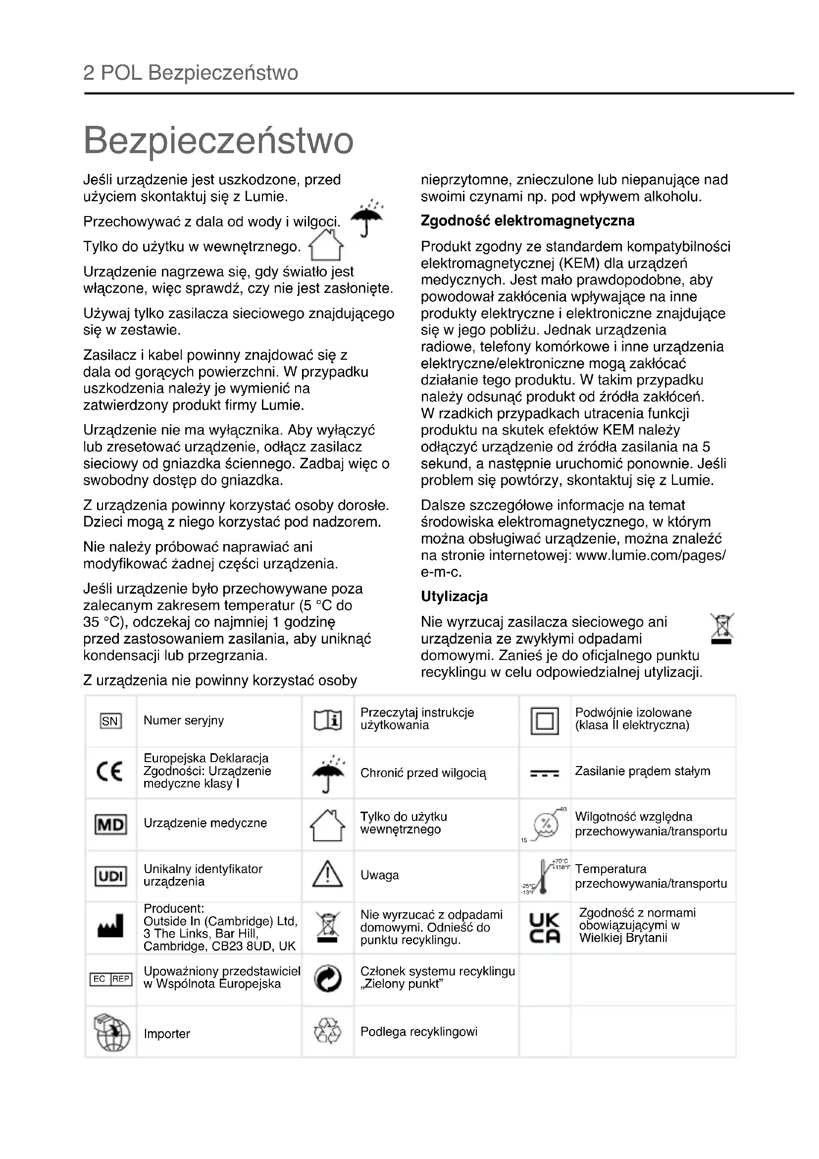 +70°C-25°C-13°F+158°F Zgodność z normami obowiązującymi w Wielkiej Brytanii Importer Jeśli urządzenie jest uszkodzone, przed użyciem skontaktuj się z Lumie. Przechowywać z dala od wody i wilgoci. Tylko do użytku w wewnętrznego. Urządzenie nagrzewa się, gdy światło jest włączone, więc sprawdź, czy nie jest zasłonięte. Używaj tylko zasilacza sieciowego znajdującego się w zestawie. Zasilacz i kabel powinny znajdować się z dala od gorących powierzchni. W przypadku uszkodzenia należy je wymienić na zatwierdzony produkt firmy Lumie. Urządzenie nie ma wyłącznika. Aby wyłączyć lub zresetować urządzenie, odłącz zasilacz sieciowy od gniazdka ściennego. Zadbaj więc o swobodny dostęp do gniazdka. Z urządzenia powinny korzystać osoby dorosłe. Dzieci mogą z niego korzystać pod nadzorem. Nie należy próbować naprawiać ani modyfikować żadnej części urządzenia. Jeśli urządzenie było przechowywane poza zalecanym zakresem temperatur (5 °C do 35 °C), odczekaj co najmniej 1 godzinę przed zastosowaniem zasilania, aby uniknąć kondensacji lub przegrzania. Z urządzenia nie powinny korzystać osoby nieprzytomne, znieczulone lub niepanujące nad swoimi czynami np. pod wpływem alkoholu. Zgodność elektromagnetyczna Produkt zgodny ze standardem kompatybilności elektromagnetycznej (KEM) dla urządzeń medycznych. Jest mało prawdopodobne, aby powodował zakłócenia wpływające na inne produkty elektryczne i elektroniczne znajdujące się w jego pobliżu. Jednak urządzenia radiowe, telefony komórkowe i inne urządzenia elektryczne/elektroniczne mogą zakłócać działanie tego produktu. W takim przypadku należy odsunąć produkt od źródła zakłóceń. W rzadkich przypadkach utracenia funkcji produktu na skutek efektów KEM należy odłączyć urządzenie od źródła zasilania na 5 sekund, a następnie uruchomić ponownie. Jeśli problem się powtórzy, skontaktuj się z Lumie. Dalsze szczegółowe informacje na temat środowiska elektromagnetycznego, w którym można obsługiwać urządzenie, można znaleźć na stronie internetowej: www.lumie.com/pages/ e-m-c. Utylizacja Nie wyrzucaj zasilacza sieciowego ani urządzenia ze zwykłymi odpadami domowymi. Zanieś je do oficjalnego punktu recyklingu w celu odpowiedzialnej utylizacji.POL 3 Wprowadzenie Lumie Bodyclock budzi Cię naturalnie przy pomocy funkcji wschodu słońca. Wykazano, że budzenie się wraz ze światłem poprawia nastrój, podnosi poziom energii, zwiększa produktywność oraz jakość snu i przebudzenia.