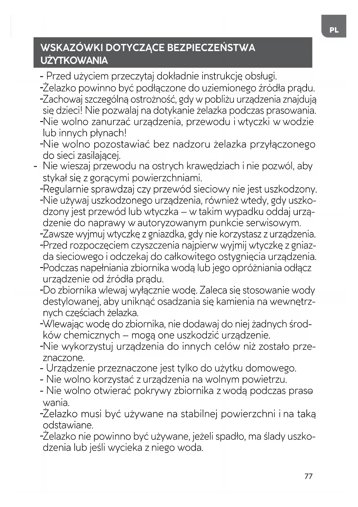 Żelazko nie powinno być używane, jeżeli spadło, ma ślady uszko- dzenia lub jeśli wycieka zniego woda.78
